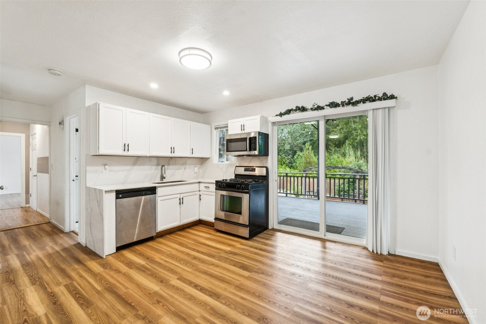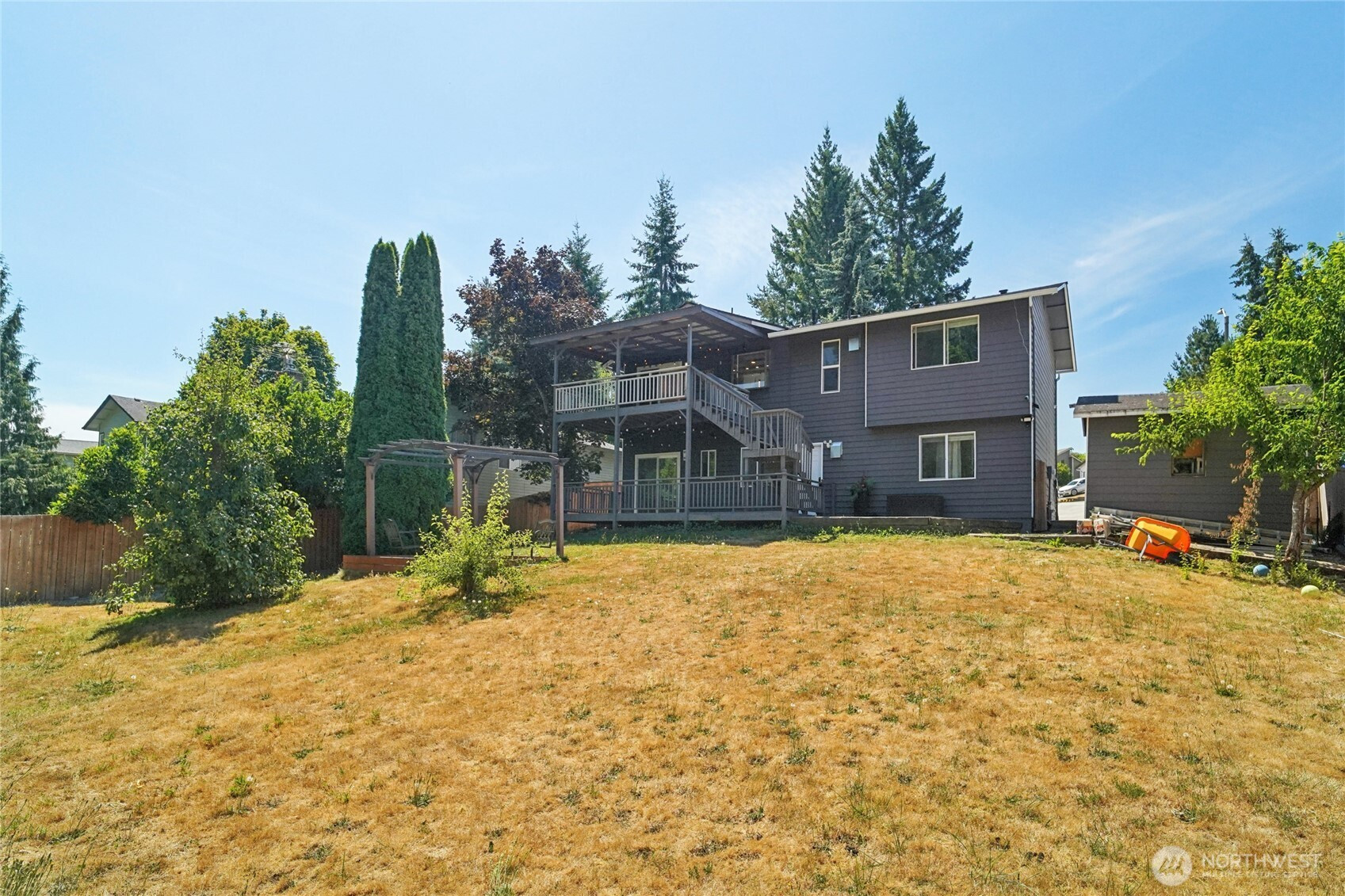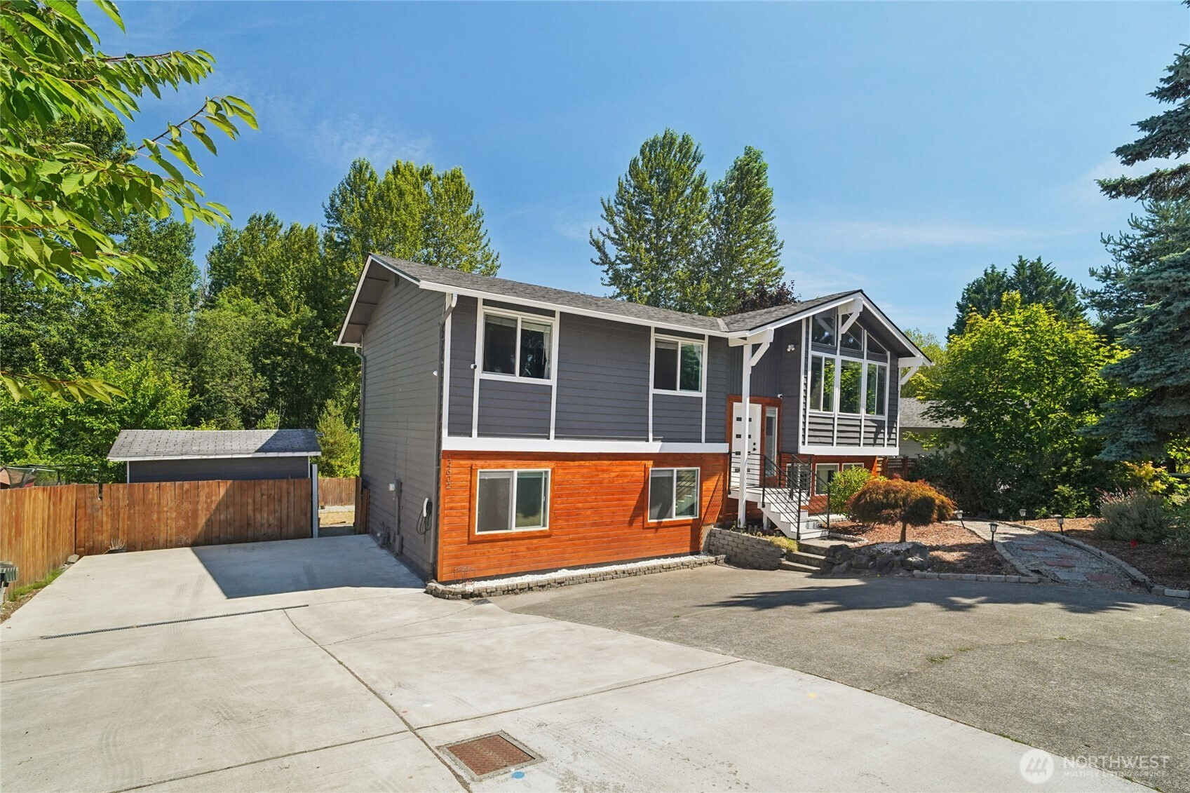 Updated 5 bedroom home that offers multi-generational living possibilities. The Main level welcomes you with light filled open concept living room anchored by a cozy fireplace. Modern open Kitchen with Dining area. Step out to a generous covered deck, perfect for entertaining! This level also offer a primary bedroom with own bath and two additional spacious bedrooms and another full bath. The lower level is a game changer as it functions as a complete private residence. You will find a stylish 2nd Kitchen with quartz counters, a large rec room with fireplace. 2 more bedrooms and a beautifully finished 3/4 bath. Huge fully fenced yard backs to open space. New Roof, Updated insulation added in attic, New windows (2022) and elec. car charger.