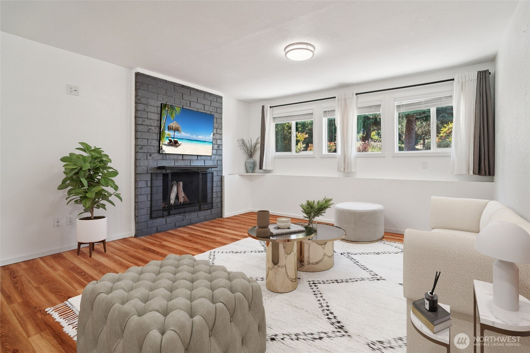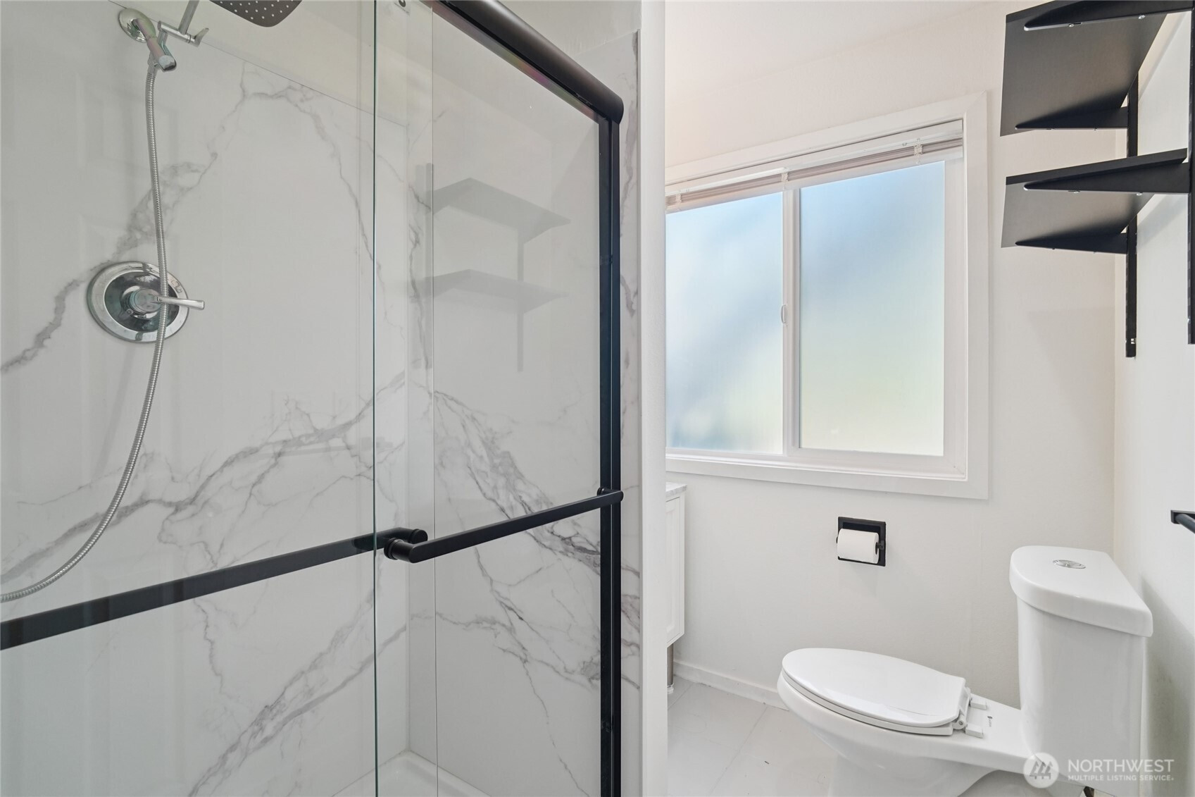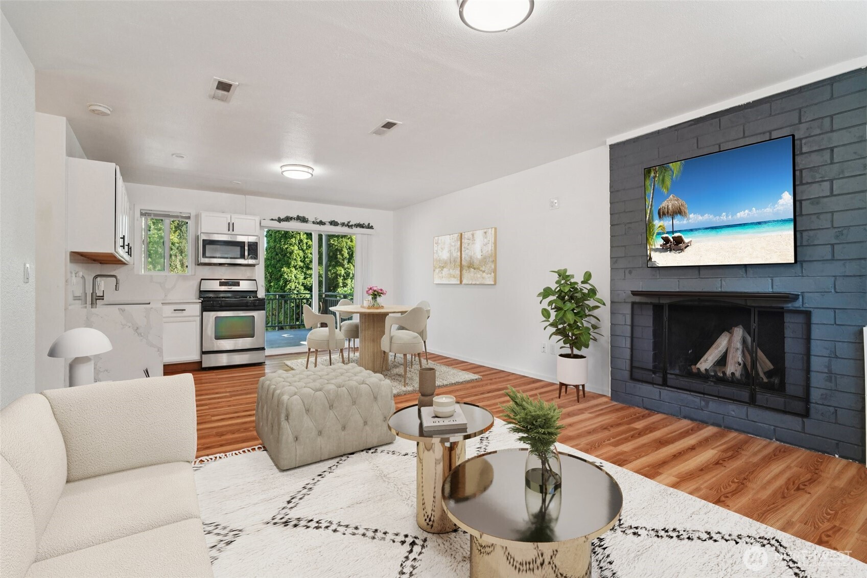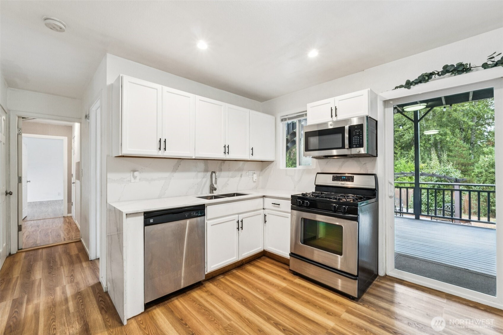 Updated 5 bedroom home that offers multi-generational living possibilities. The Main level welcomes you with light filled open concept living room anchored by a cozy fireplace. Modern open Kitchen with Dining area. Step out to a generous covered deck, perfect for entertaining! This level also offer a primary bedroom with own bath and two additional spacious bedrooms and another full bath. The lower level is a game changer as it functions as a complete private residence. You will find a stylish 2nd Kitchen with quartz counters, a large rec room with fireplace. 2 more bedrooms and a beautifully finished 3/4 bath. Huge fully fenced yard backs to open space. New Roof, Updated insulation added in attic, New windows (2022) and elec. car charger.