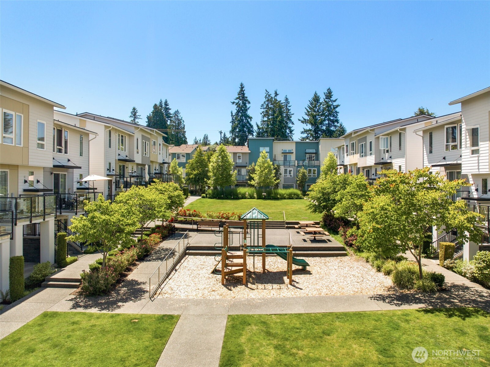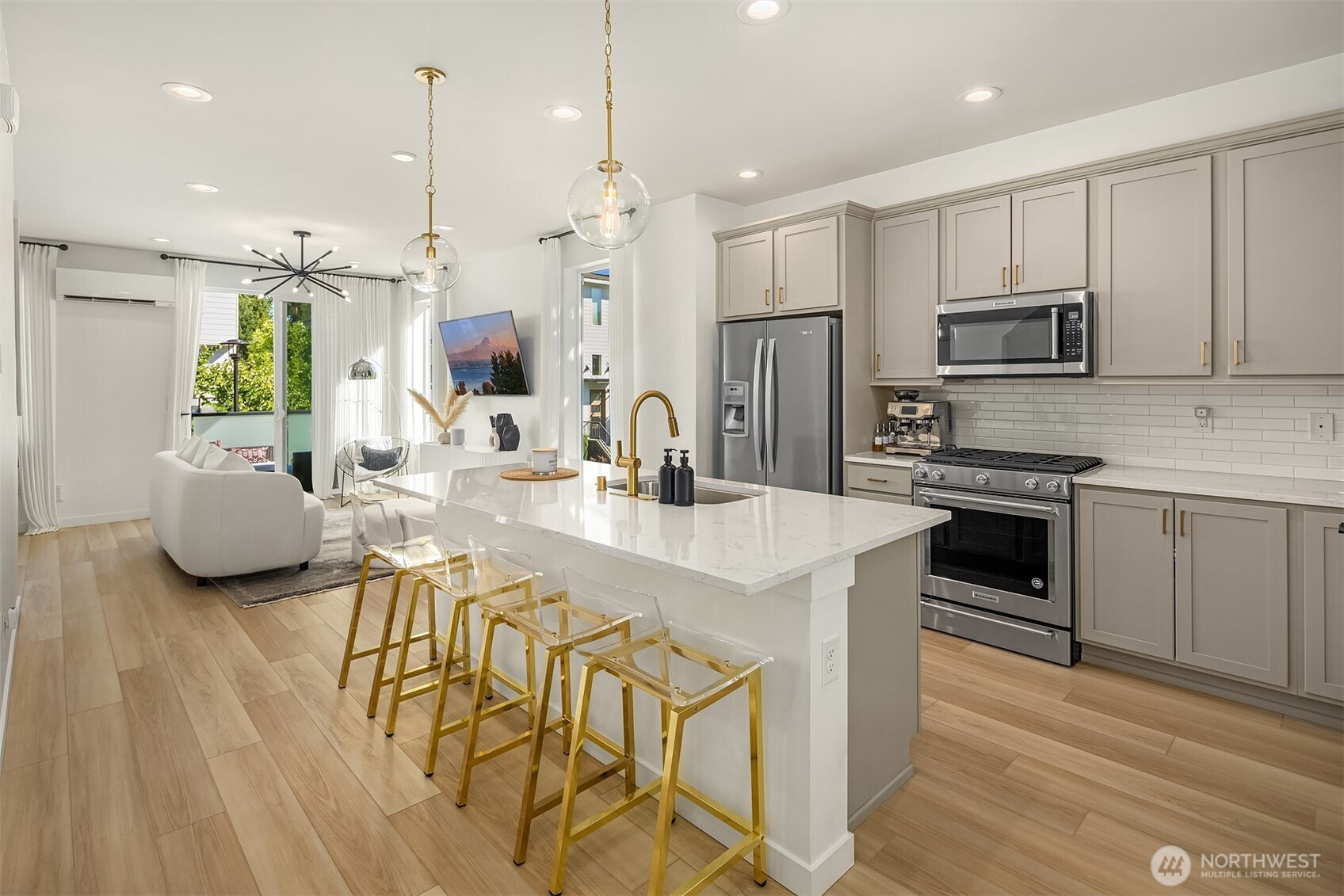 Stunningly renovated, sun-filled end-unit residence w/views of community park in desirable 12 Degrees North. High-end upgrades & designer finishes throughout. Over $50K in recent upgrades include central heating & cooling on upper level, along w/mini-splits on the main & lower levels, white oak laminate flooring, stylish hardware & modern lighting fixtures, refinished cabinetry, remodeled powder room, custom closet built-ins, glass/iron barn door & fresh paint. Open concept layout & thoughtful design w/each bedroom equipped w/own en-suite bath & a power room on the main. Enjoy private balcony & patio, 2-car garage & ample guest parking. Walkable to Burke-Gilman Trail, minutes to shopping & dining, & major commuting routes. No rental cap!