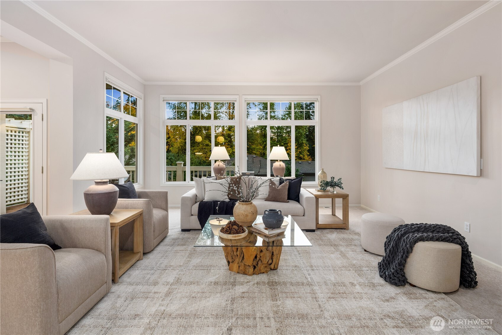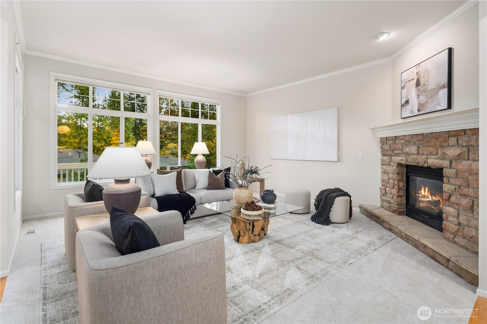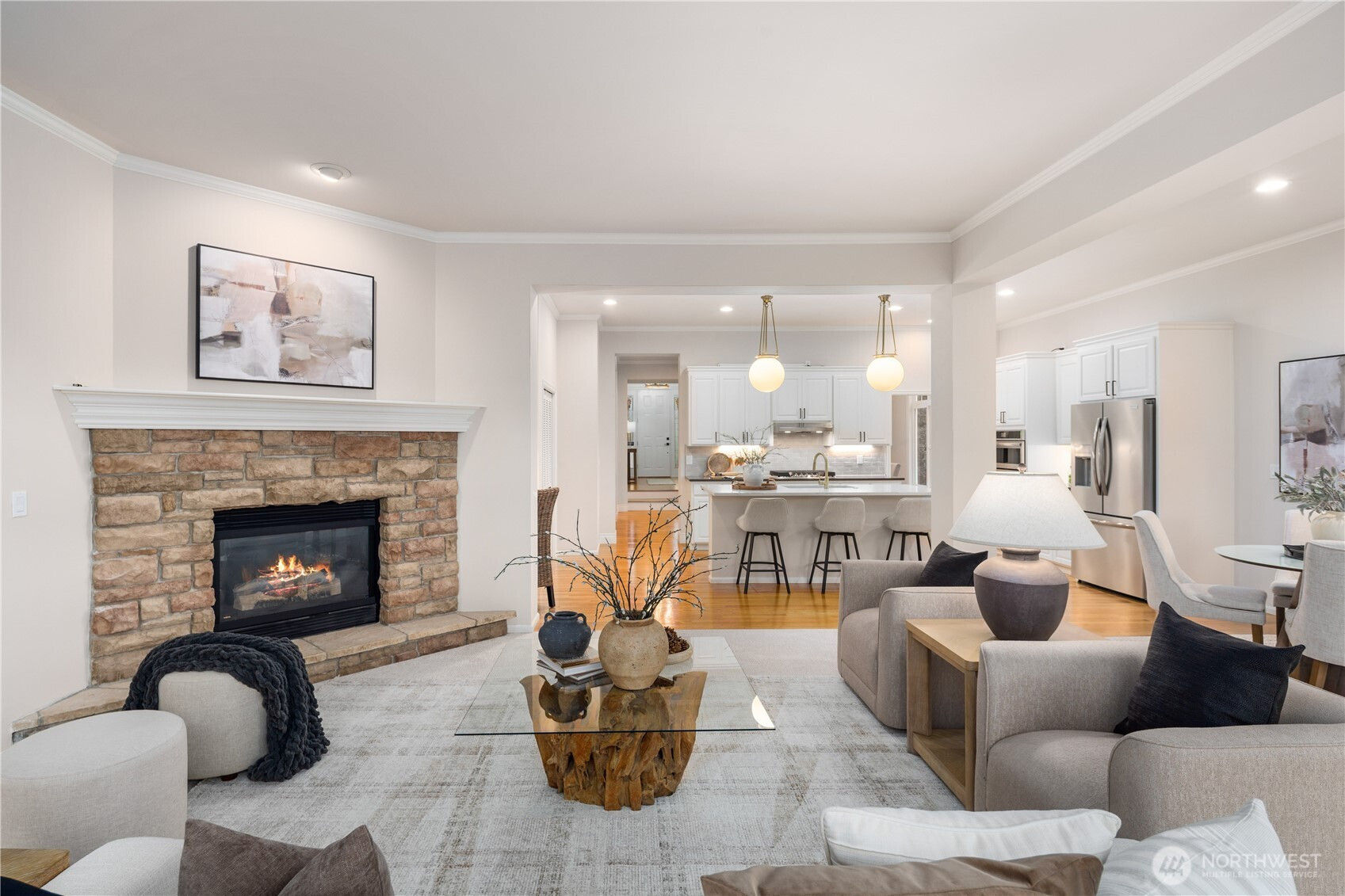 Timeless Bellevue living begins at the covered front entrance leading to a bright formal living room. The refreshed gourmet kitchen features new appliances, backsplash, countertops, sink, and stove, flowing into an open dining and family area with French doors to the deck. A formal dining room sits nearby, complemented by new carpet and lighting throughout. Three stone-surround gas fireplaces bring warmth and character. The primary suite offers a walk-in closet and spa-like bath with walk-in shower, double vanity, and updated lighting and flooring. Three additional bedrooms, a full bath, laundry room, and a finished lower-level bonus with garden access complete this home near top schools, parks, trails, and shopping.