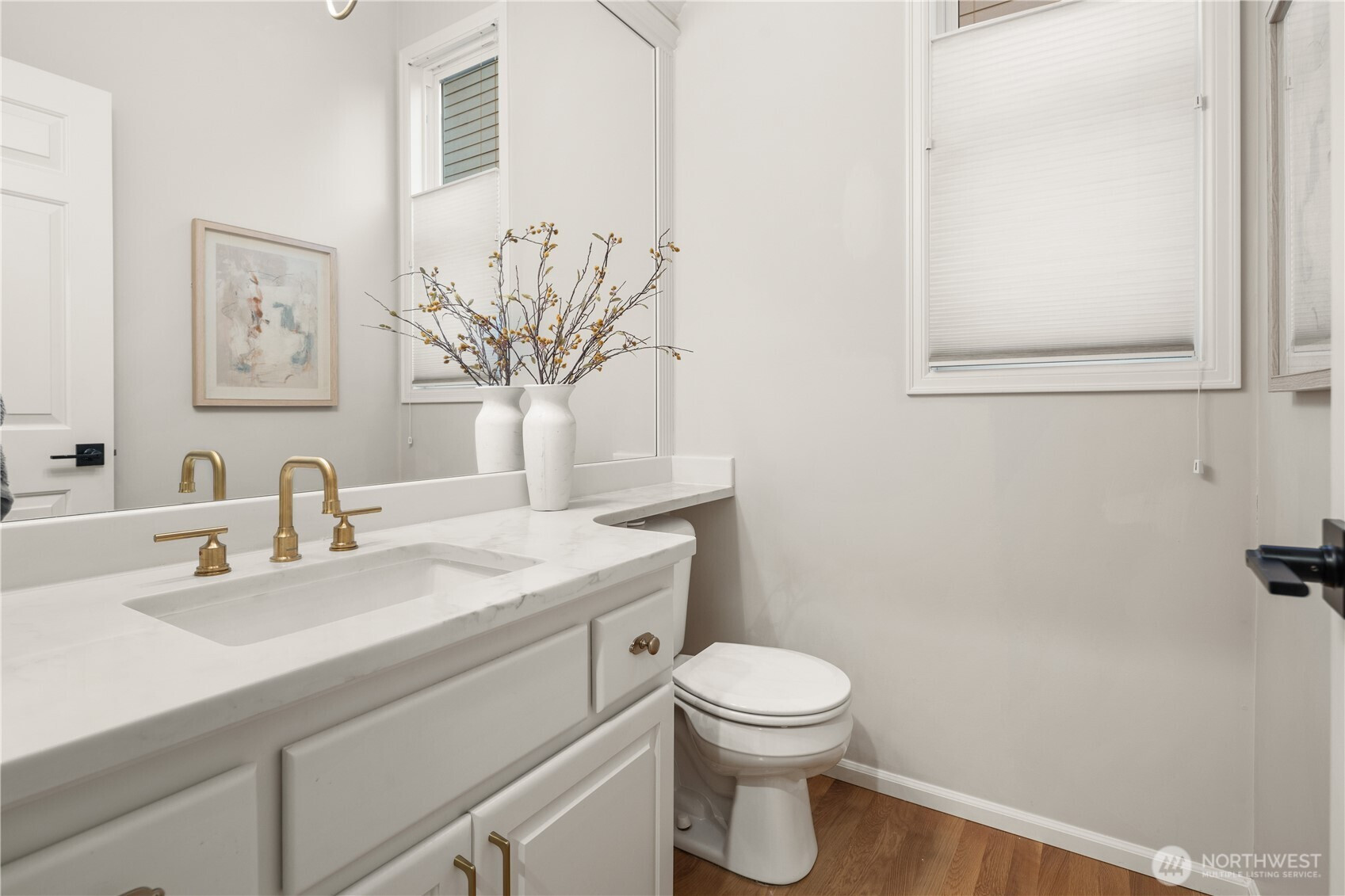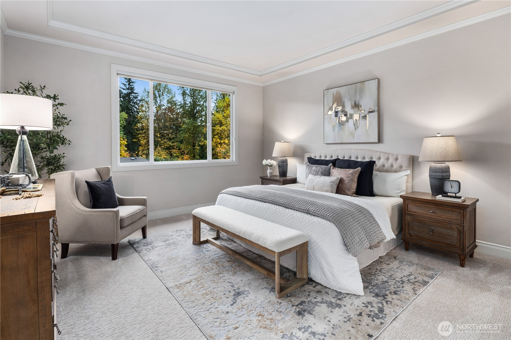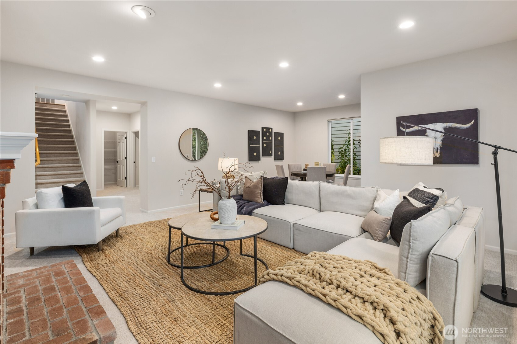 Timeless Bellevue living begins at the covered front entrance leading to a bright formal living room. The refreshed gourmet kitchen features new appliances, backsplash, countertops, sink, and stove, flowing into an open dining and family area with French doors to the deck. A formal dining room sits nearby, complemented by new carpet and lighting throughout. Three stone-surround gas fireplaces bring warmth and character. The primary suite offers a walk-in closet and spa-like bath with walk-in shower, double vanity, and updated lighting and flooring. Three additional bedrooms, a full bath, laundry room, and a finished lower-level bonus with garden access complete this home near top schools, parks, trails, and shopping.