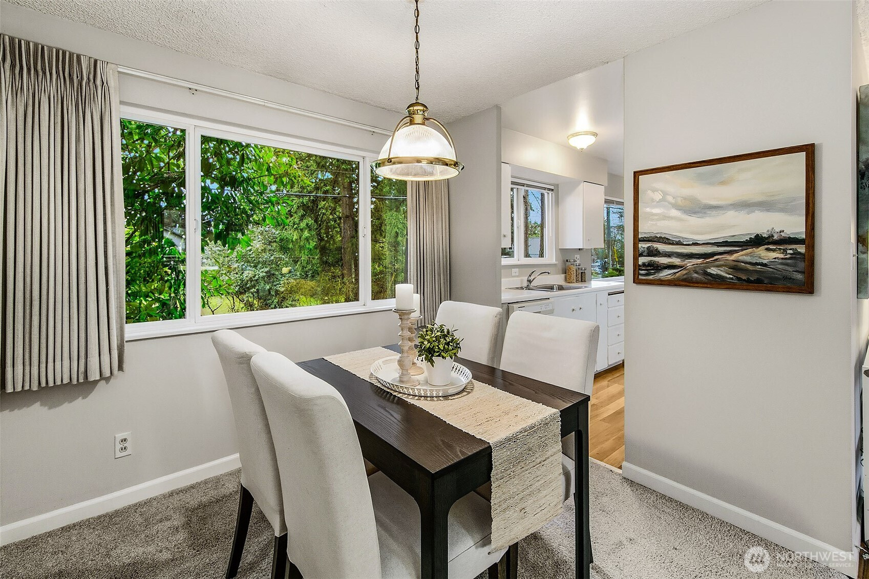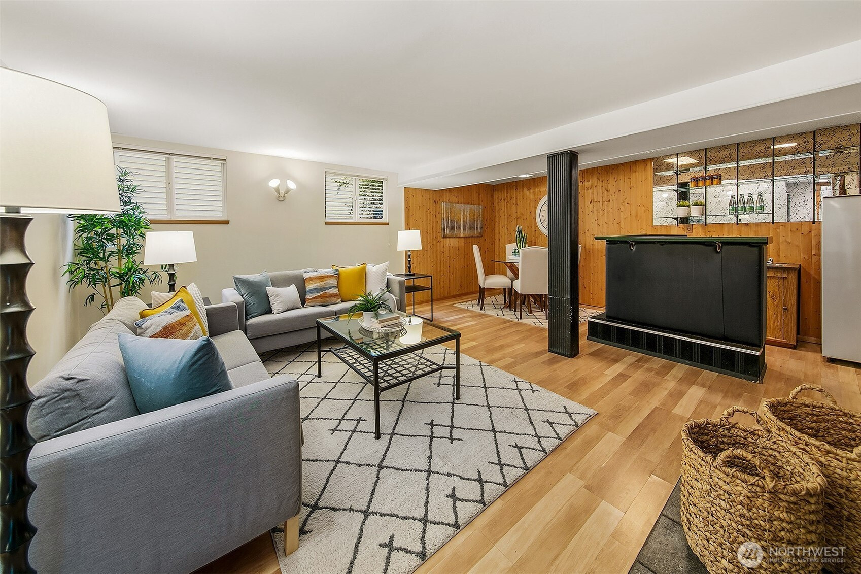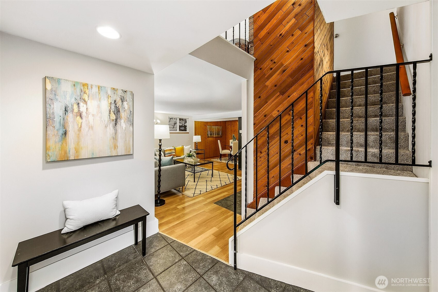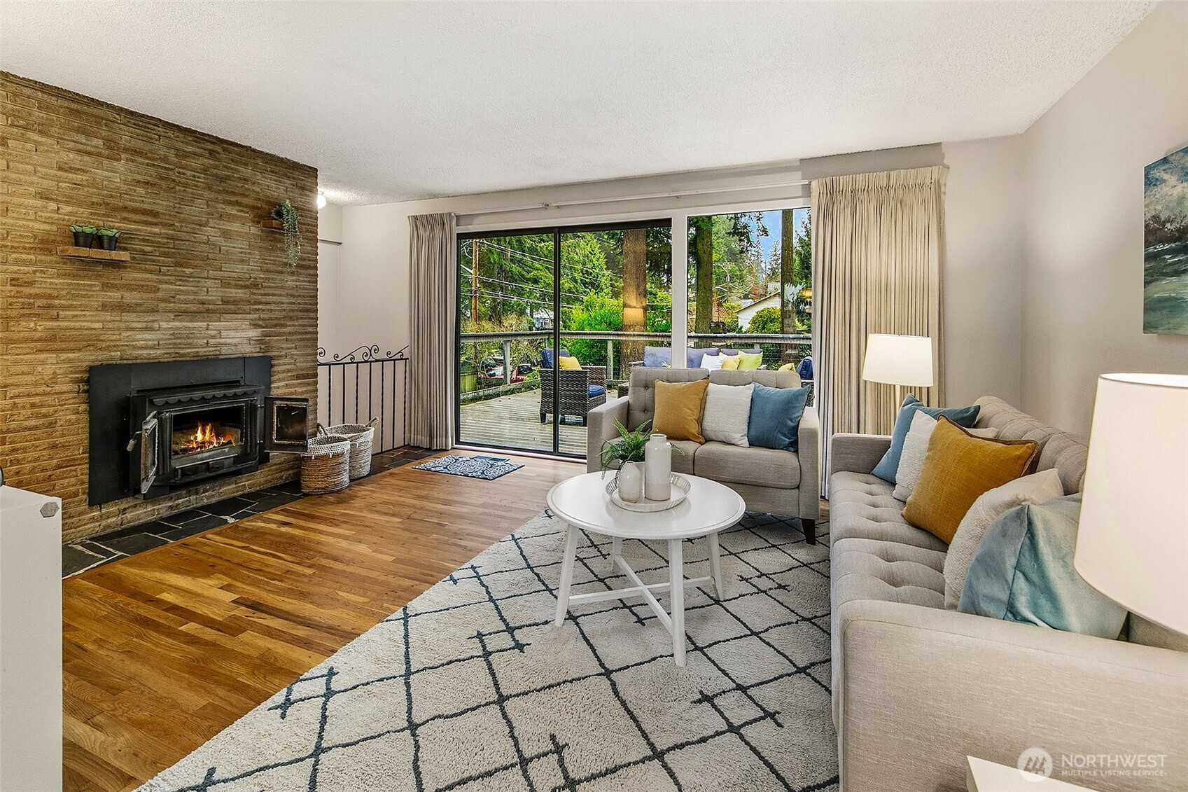 Mid-century home w/pride of ownership! Slate entry leads to sunny kitchen w/eating space, formal living & dining room. Living room has newly refinished hardwood floors, fireplace & wall of windows w/slider that opens to spacious deck overlooking private fenced yard, perfect for entertaining! 3 beds on main floor w/new carpet & full bath. Lower-level features family room w/bar & fireplace, 4th bedroom/office, ¾ bath & primary suite w/walk-in closet, attached bath w/heated floor! Other updates incl some fresh paint & new TPN roof! Situated on corner lot on quiet street just steps from Interurban Trail & short walk to restaurants, Town & Country Market & more! Minutes to light rail station & easy commute to downtown. Popular Shoreline Schools!