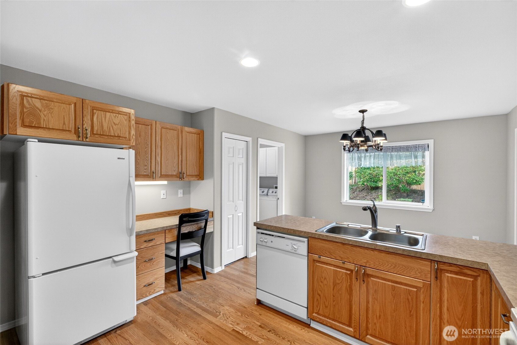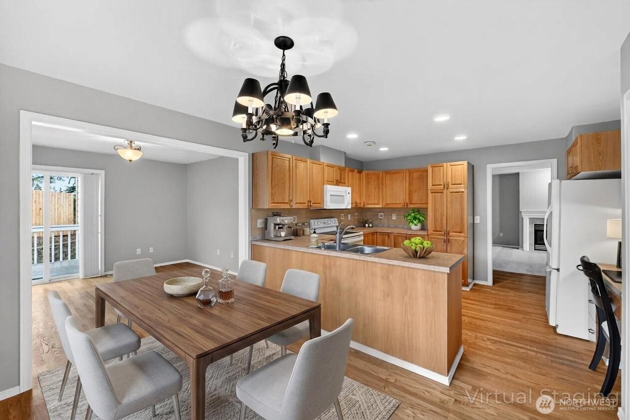 Welcome to Ridge Haven Condos in the heart of Enumclaw, where comfort meets effortless elegance. This beautifully appointed main-level residence offers 2 bedrooms, 1.75 bathrooms, and a sophisticated den or flex space—perfect for both quiet moments and productivity. The thoughtfully designed floor plan showcases a spacious kitchen that flows seamlessly into an inviting living area, anchored by a warm gas fireplace. Expansive windows bathe the home in natural light, creating an airy and refined ambiance throughout. The primary suite is a private retreat, complete with a well-appointed en suite bath and a generous walk-in closet. Every detail has been designed to offer both comfort and style. An attached 2-car garage provides both convenience and ample storage. Step outside to discover lush, mature landscaping that frames the home in natural beauty. The secluded yard offers a serene escape, featuring a deck ideal for relaxing or entertaining in a peaceful setting. Situated on a desirable corner unit with an expansive side yard, this home offers an added sense of space and privacy. Perfectly positioned just moments from downtown Enumclaw, the golf course, Mud Mountain Dam Park, and Mount Peak hiking trails, with Crystal Mountain within easy reach. This is Pacific Northwest living at its finest—where small-town charm meets year-round recreation.