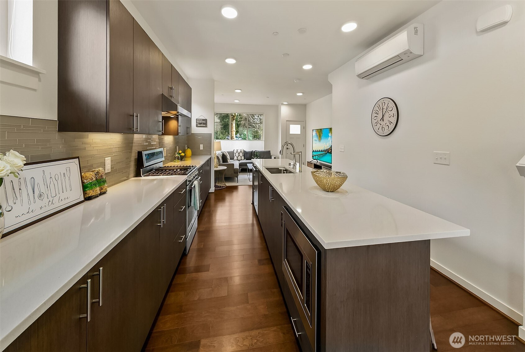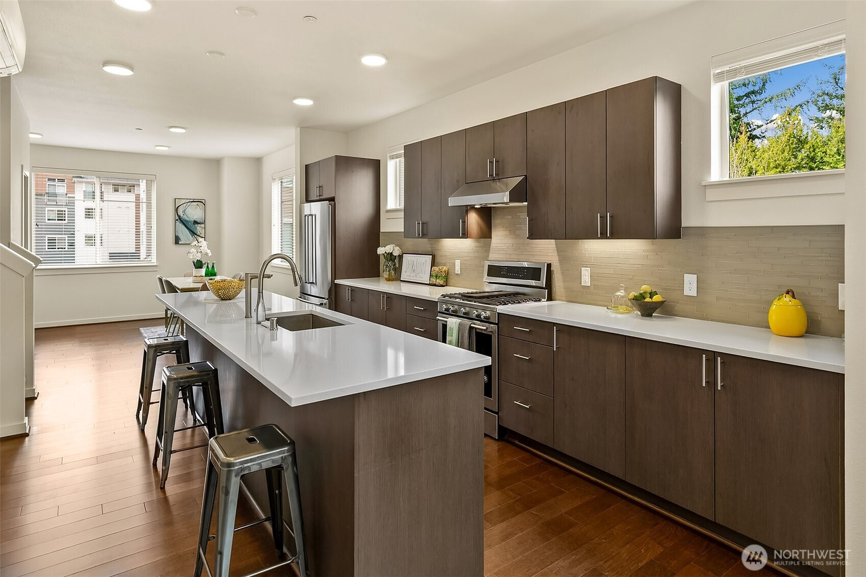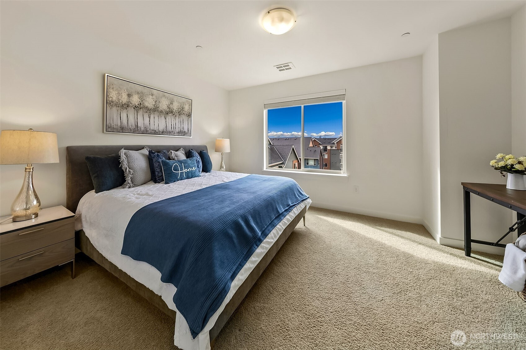 Rare to find end unit in Upton at Crossroads! This Bright & Modern 3b/3B home is maintained exceptional by original owner with well designed details, Main level filled with nature light as End Unit. Open kitchen, large Island, living, dining on main level. Master suite & one room adjacent to a hallway bathroom on second level. Top level featured with bonus room, a full private suite and private balcony overlooking the park surrounded by greenery. Customized blinds & curtained throughout. Oversized 2-car tandem garage provide ample storage space. Mins to mall, parks & restaurants. Pre-inspected, low HOA with water & sewer covered. NO rental cap!