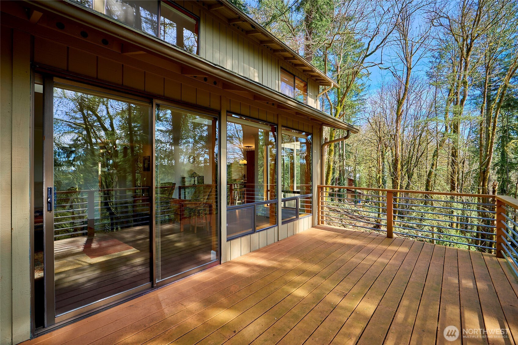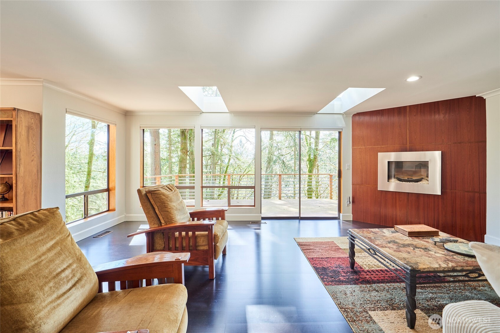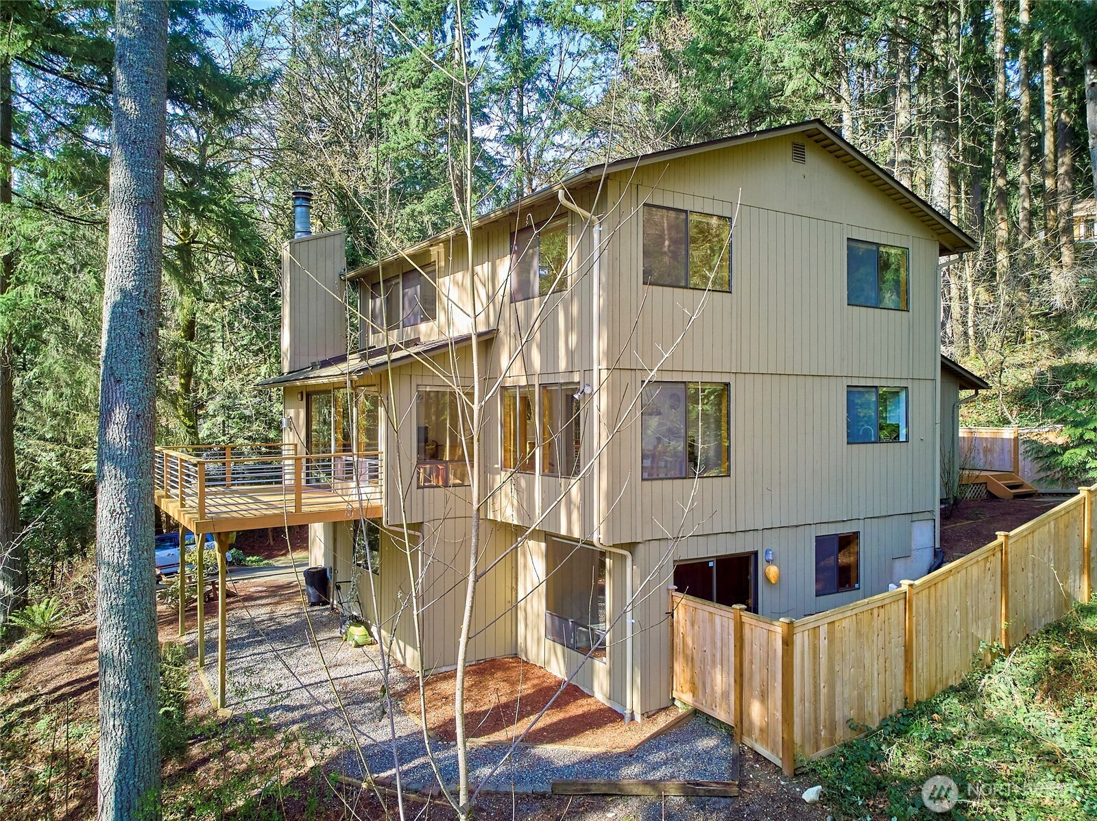 A tree-lined driveway (steep, but worth it) leads to this stunning home set on nearly an acre of peaceful, forested land. Expansive windows throughout capture breathtaking views of the surrounding woods and bring the outdoors in. The main level features an open-concept layout that flows seamlessly to a spacious deck—perfect for entertaining or relaxing. Skylights above the living room fill the space with natural light, creating a warm and inviting atmosphere. The family room opens to a private back patio with a dedicated barbecue area, along with a fully fenced backyard. Downstairs, the light-filled rec room with sliding door access offers flexible space for a gym, media room, or additional living area. Fresh interior paint gives the home a clean, move-in ready feel, and a 2-car garage completes the package.