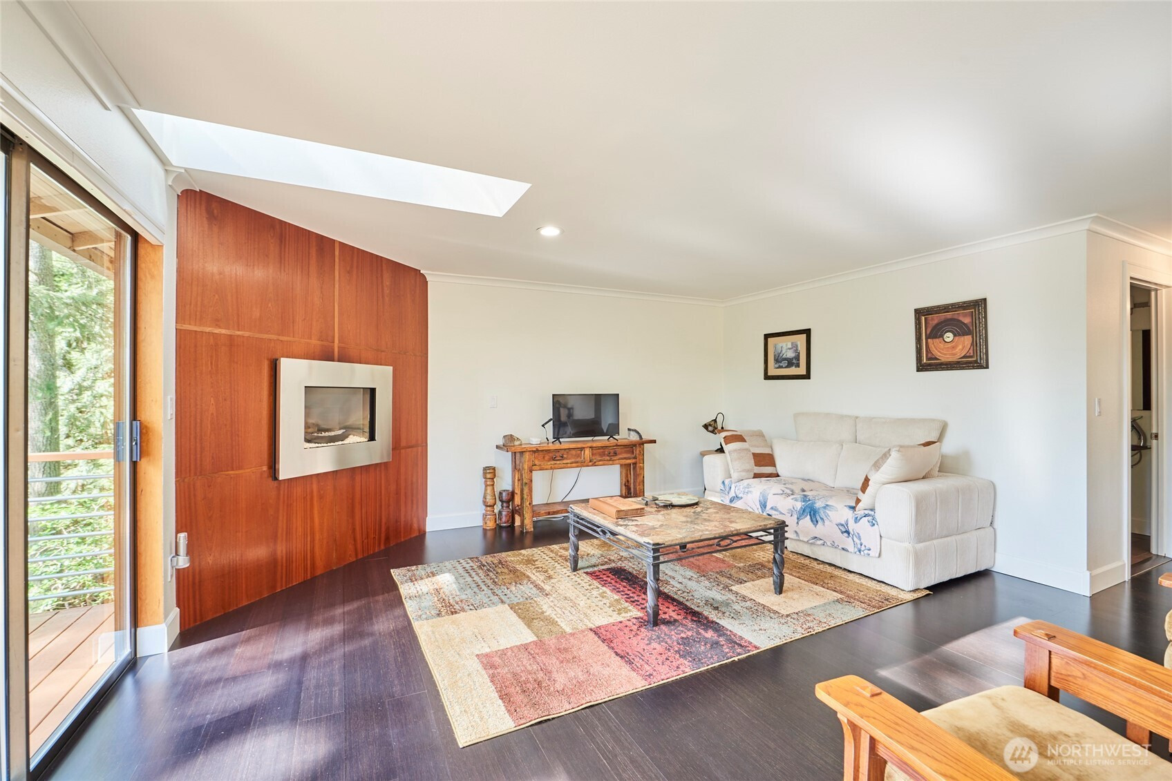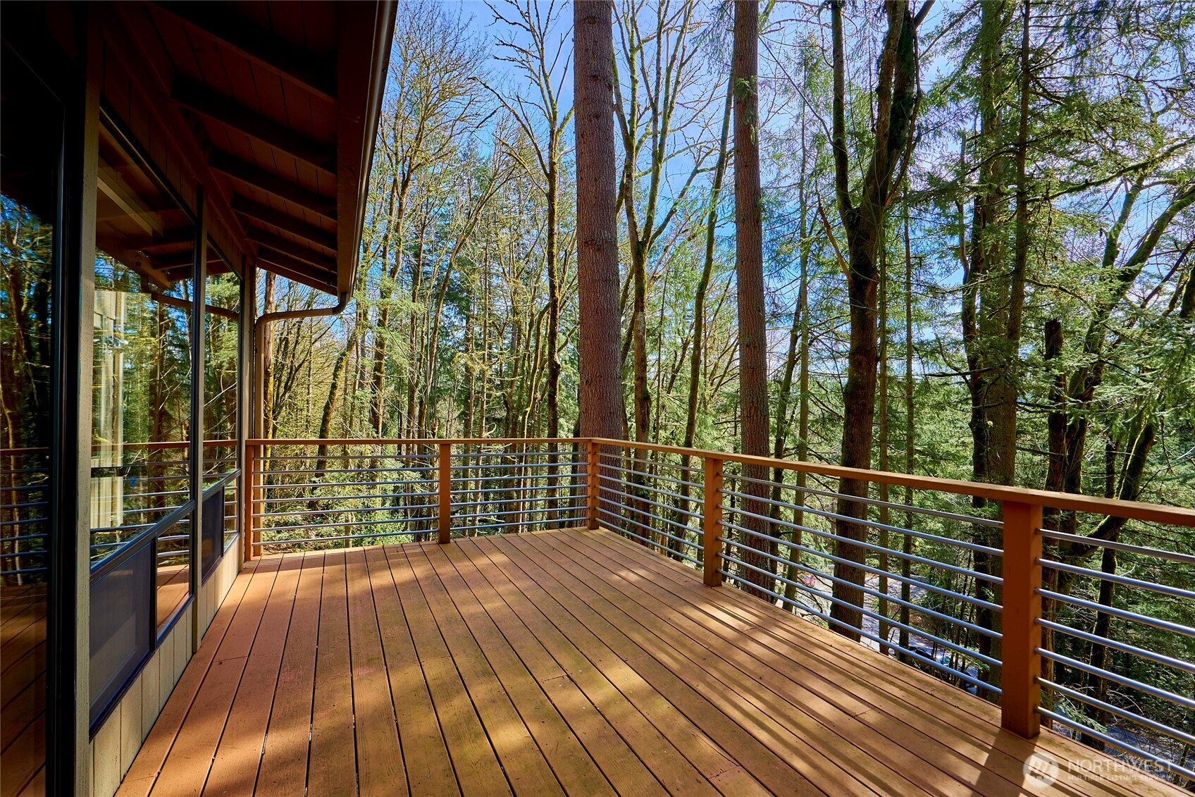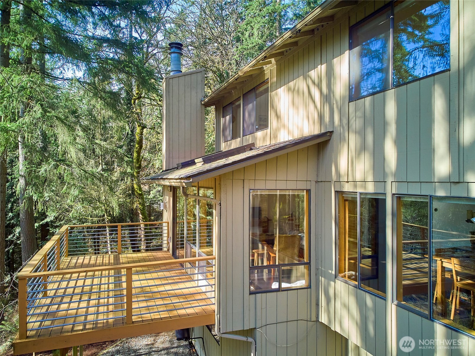 A tree-lined driveway (steep, but worth it) leads to this stunning home set on nearly an acre of peaceful, forested land. Expansive windows throughout capture breathtaking views of the surrounding woods and bring the outdoors in. The main level features an open-concept layout that flows seamlessly to a spacious deck—perfect for entertaining or relaxing. Skylights above the living room fill the space with natural light, creating a warm and inviting atmosphere. The family room opens to a private back patio with a dedicated barbecue area, along with a fully fenced backyard. Downstairs, the light-filled rec room with sliding door access offers flexible space for a gym, media room, or additional living area. Fresh interior paint gives the home a clean, move-in ready feel, and a 2-car garage completes the package.