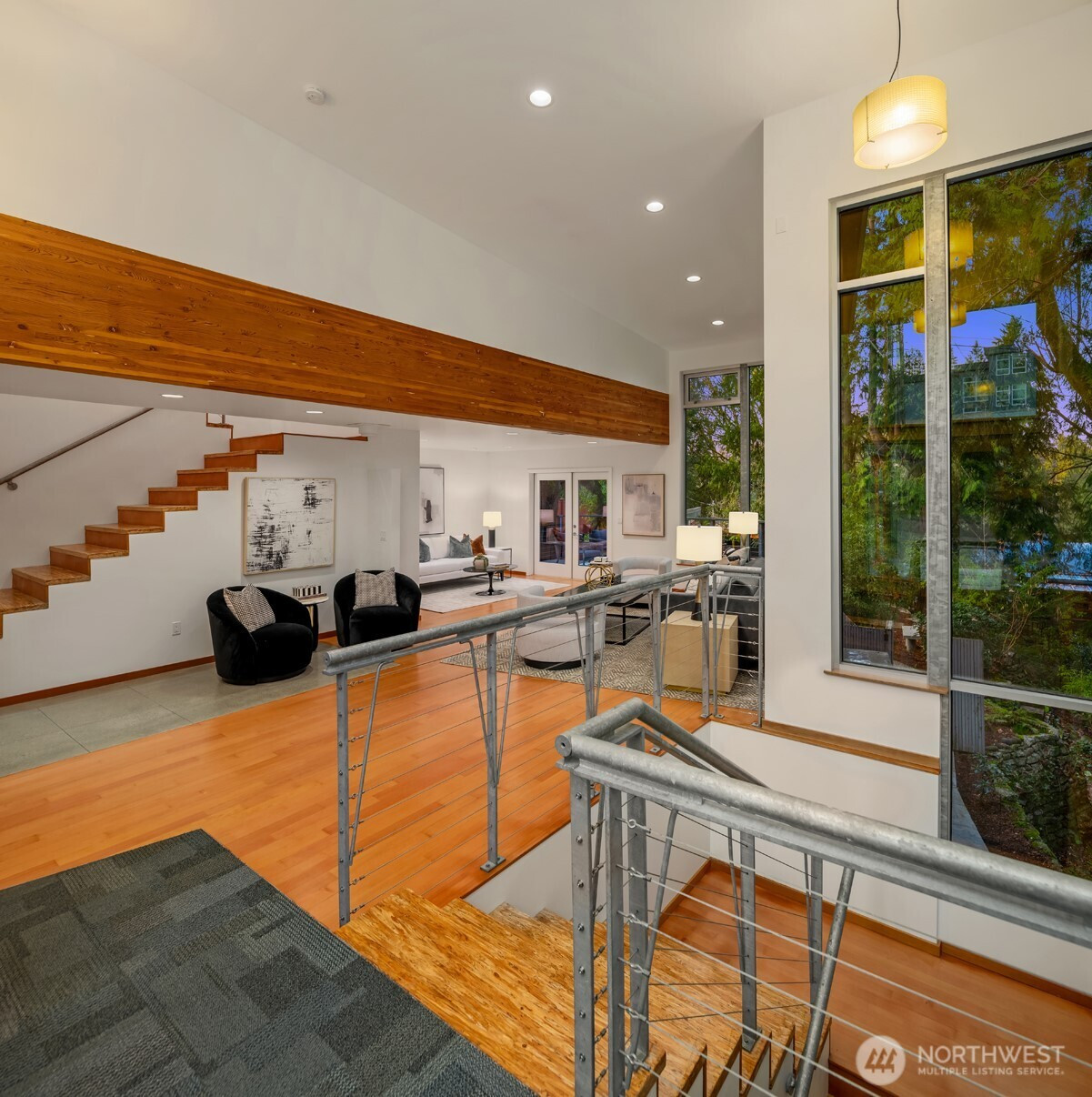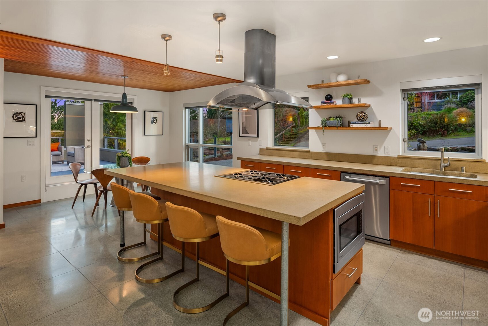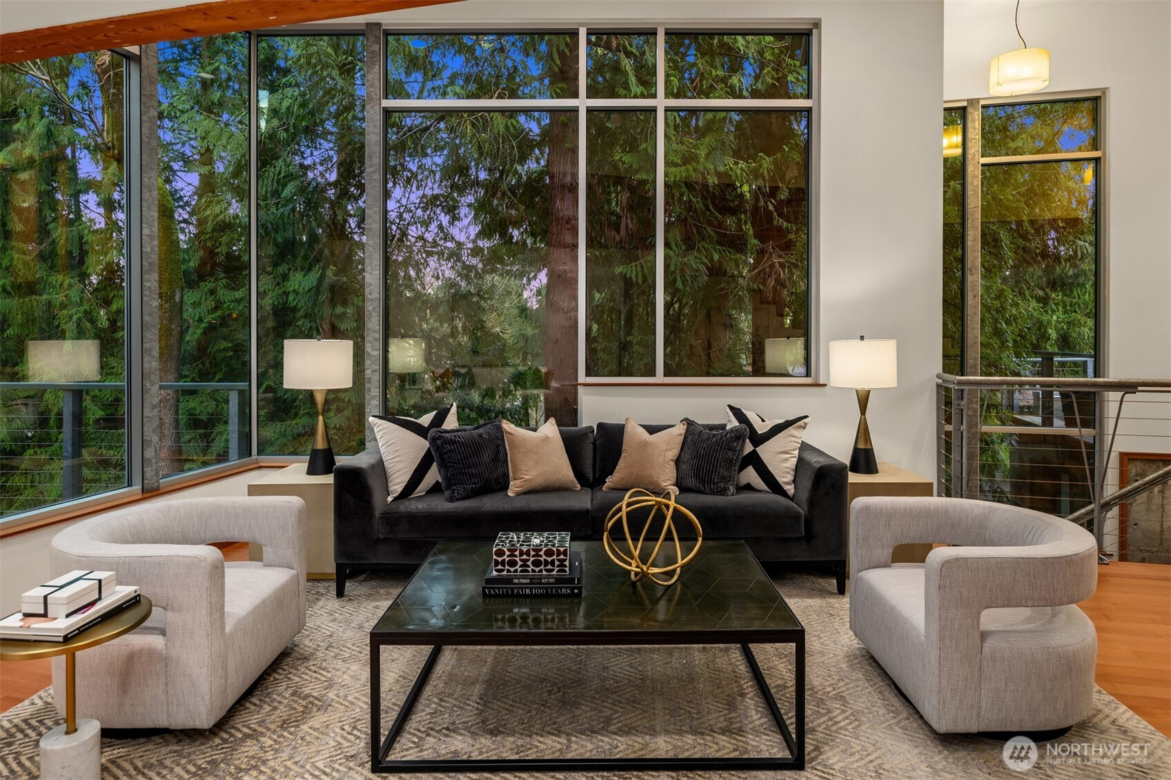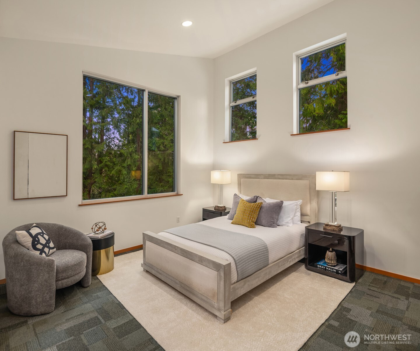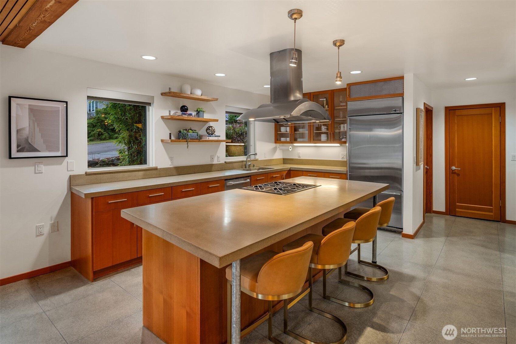 Stunning modern Pacific Northwest architecture defines this custom-built Maple Leaf residence showcasing exceptional craftsmanship, high-quality finishes, and energy-efficient design. Soaring ceilings and expansive window walls flood the open-concept living spaces with natural light while framing tranquil greenbelt views. Seamless indoor/outdoor living unfolds across multiple decks overlooking the private, wooded backyard sanctuary. Built Green certified with thoughtful incorporation of reclaimed Douglas fir elements, exposed structural beams, and artisan metal detailing throughout. Gourmet kitchen features premier GE Monogram stainless appliances, gas range, custom cabinetry, and concrete countertops. Luxurious primary suite offers vaulted ceilings, private deck access, and spa-inspired bath with jetted soaking tub. Flexible lower-level ADU with private entry provides ideal guest, rental, or multi-gen living options. Detached heated studio for work-from-home or creative space. In-floor radiant heating, HRV ventilation system, and parking for multiple vehicles complete this remarkable home.