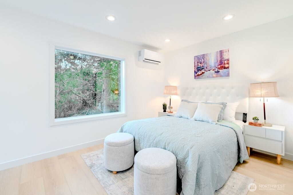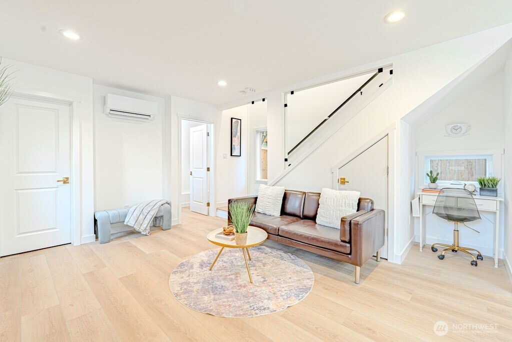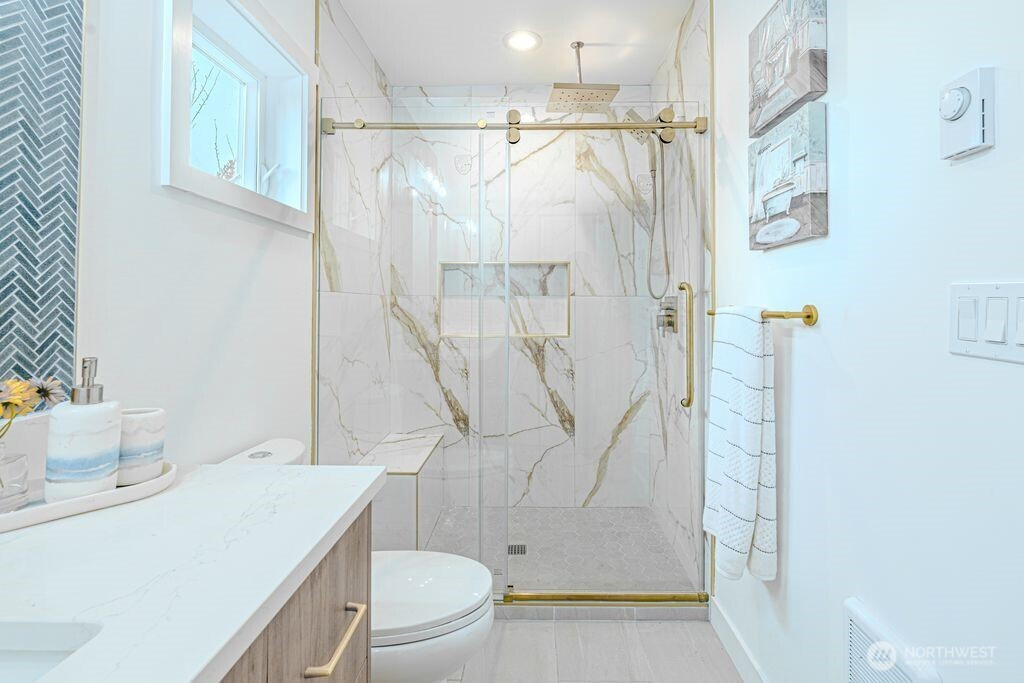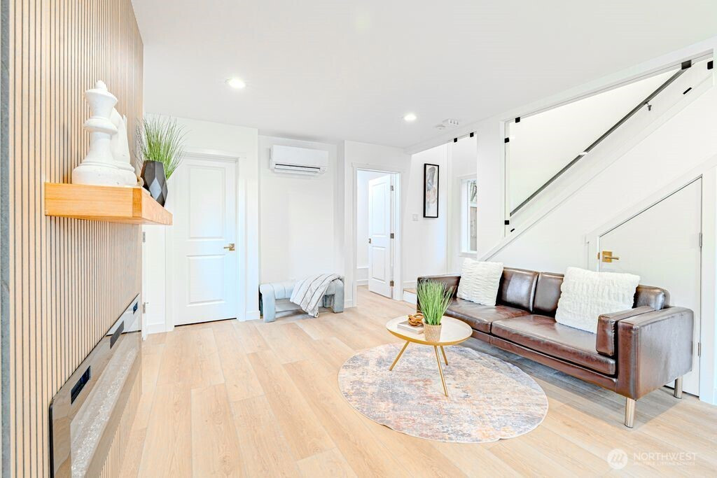 Welcome to this stunning Modern Farmhouse-inspired home, perfectly situated in the desirable Victory Heights/Northgate neighborhood. The residence boasts an airy, open floor plan anchored by a chef’s kitchen featuring custom cabinetry, sleek granite countertops, and a premium LG Bespoke Glass White appliance package. Architectural highlights include a unique wood-clad accent fireplace and a striking glass-walled staircase. Retreat to the upper level to find a spa-like bathroom complete with a walk-in tile shower, rainfall head, and built-in bench. Outdoors, unwind on your private covered gazebo patio—all just a 15-minute stroll from the Northgate Light Rail Station and shopping center.