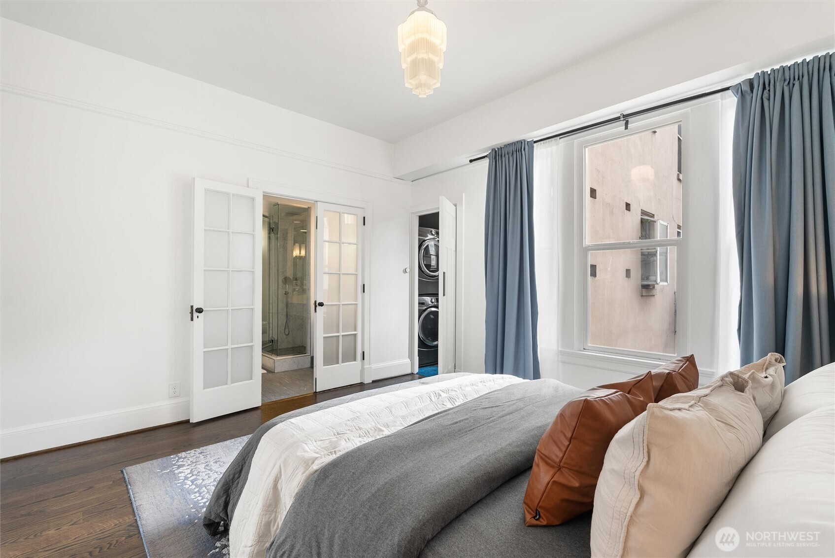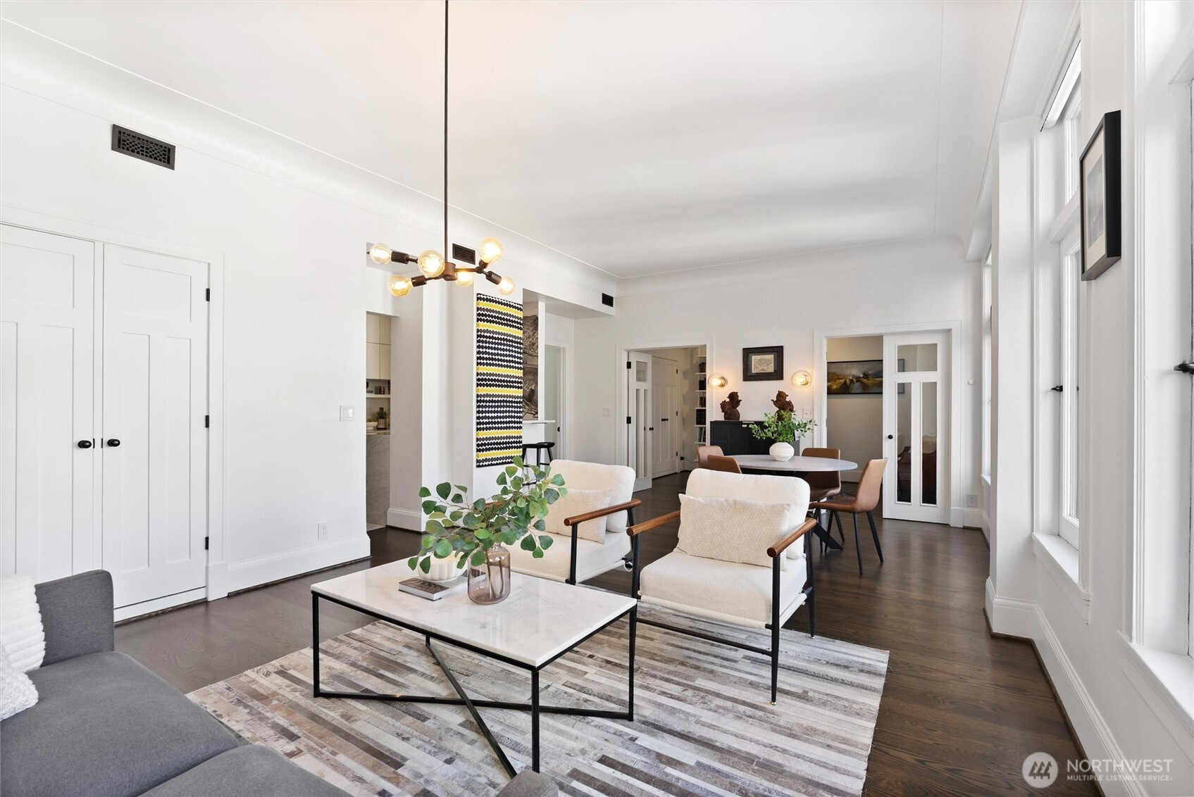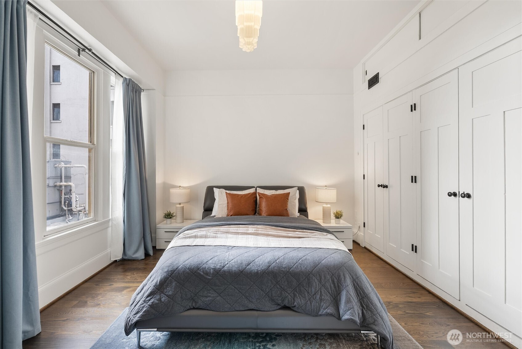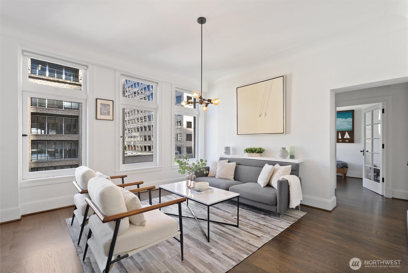 Beautifully updated 3-bedroom, 1.75-bath condo in a historic downtown Seattle building just one block from Pike Place Market. This 1,377 sq. ft. home blends timeless character with modern style and feels like an elegant apartment in Europe. Soaring ceilings, oversized windows, and rich walnut hardwood floors create a warm, light-filled feel. The spacious living and dining areas flow into a designer kitchen with marble counters, sleek cabinetry, premium appliances, and a stunning vintage Seattle map mural. The flexible floor plan includes three spacious bedrooms, beautifully updated baths, and two separate entrances—allowing the condo to easily be divided into two apartments. Perfect for multigenerational living, rental income, or adding a smart investment property to your portfolio for the price of one. Unbeatable location near the waterfront, shopping, dining, entertainment, and all the excitement of downtown Seattle—including the upcoming FIFA World Cup 2026.