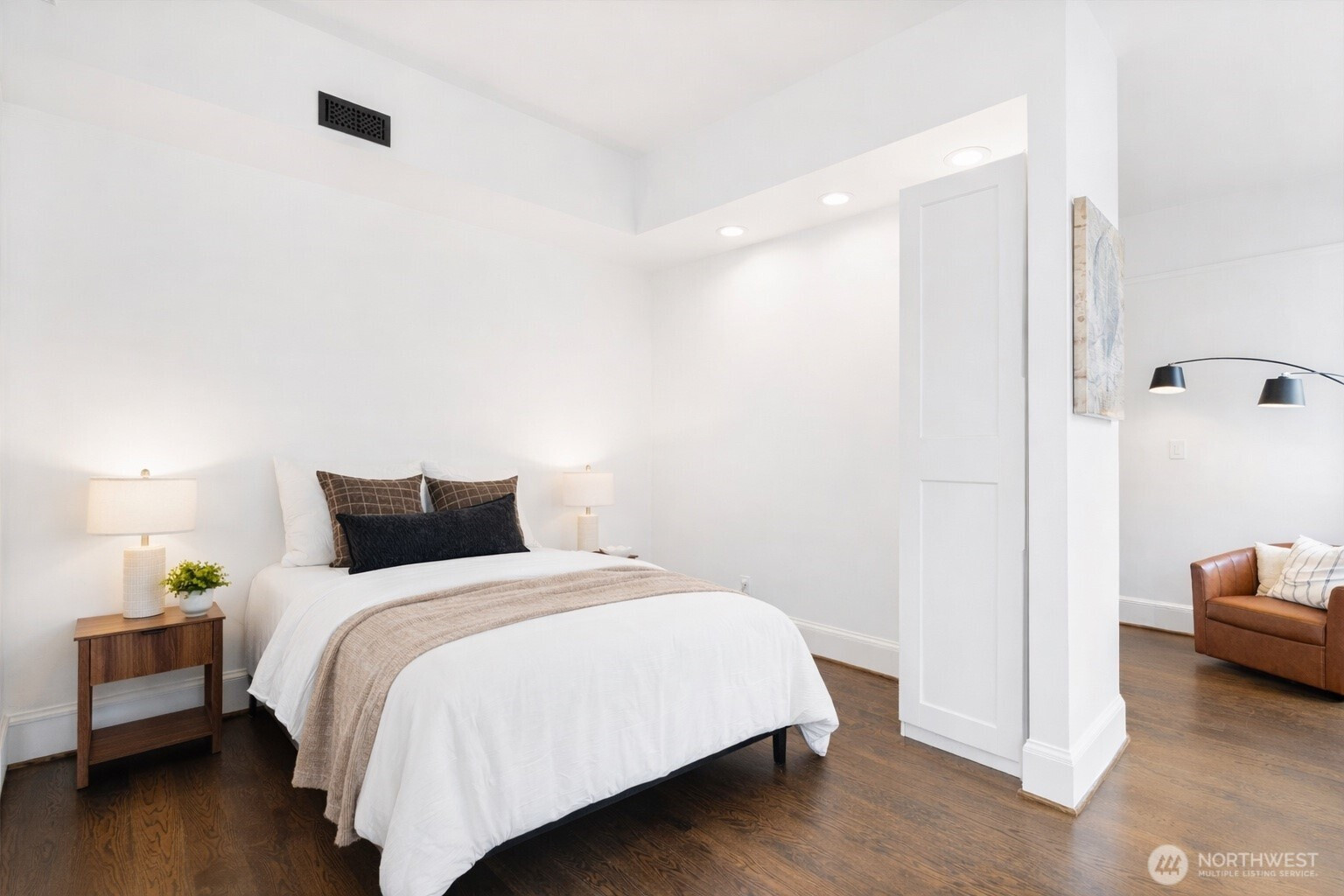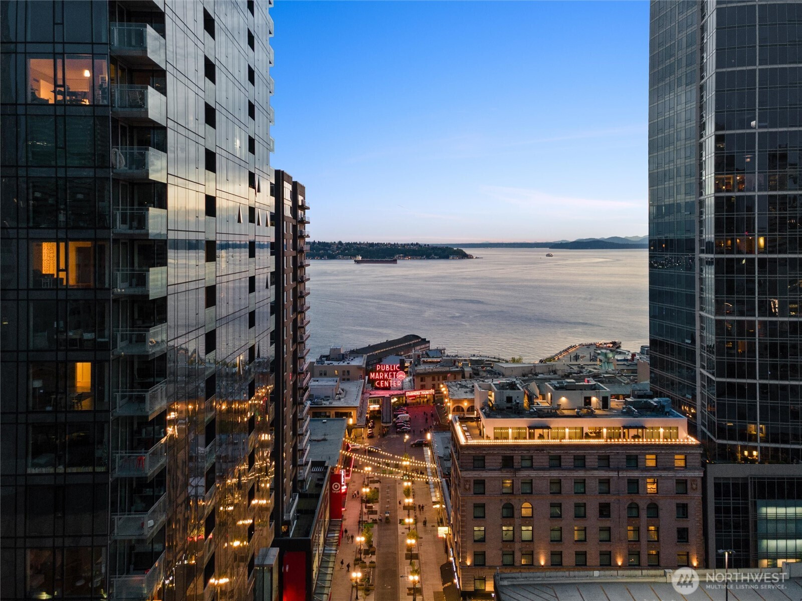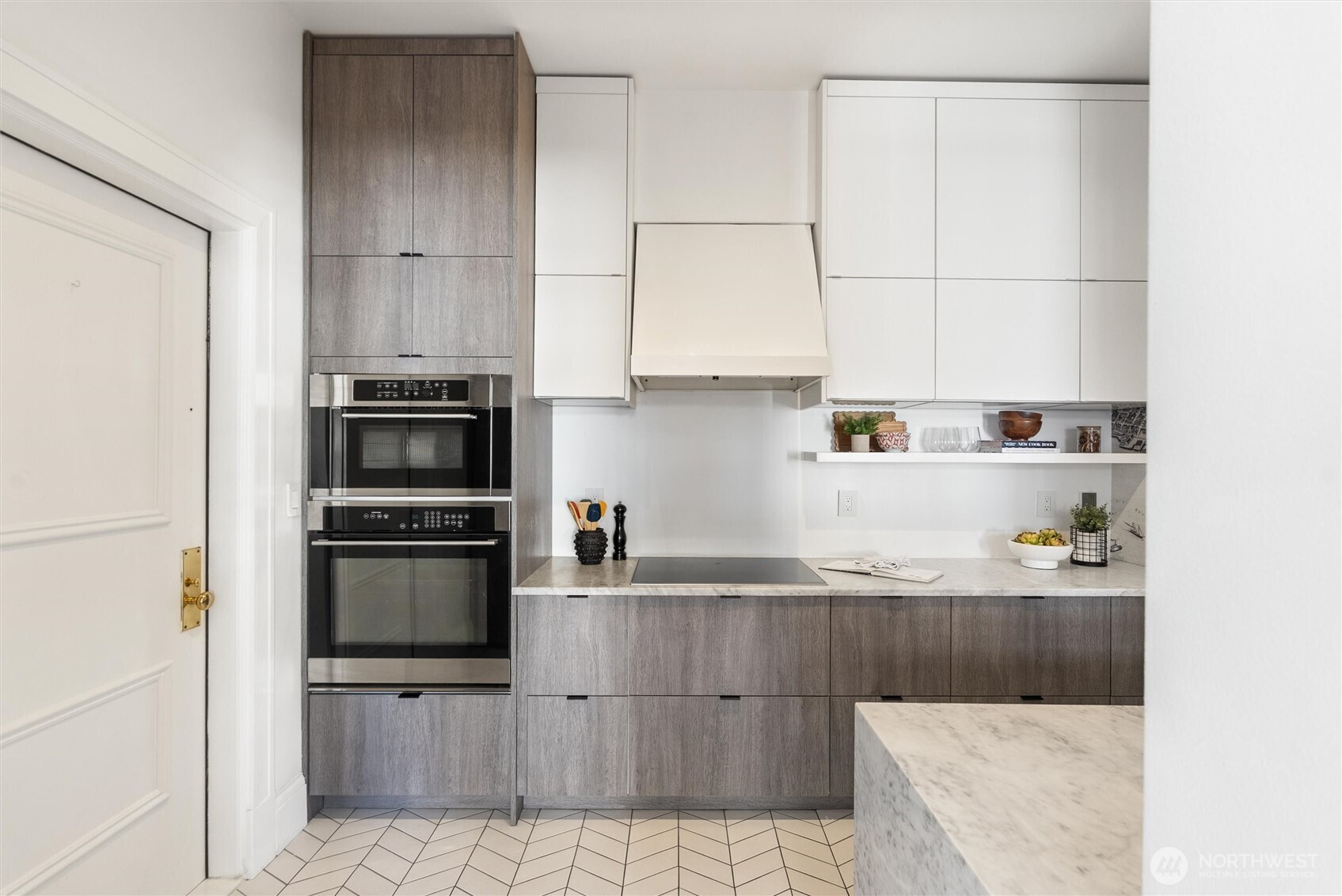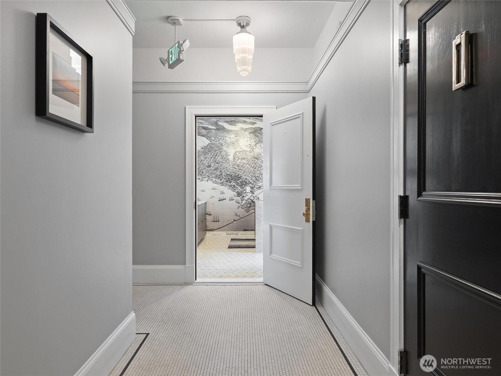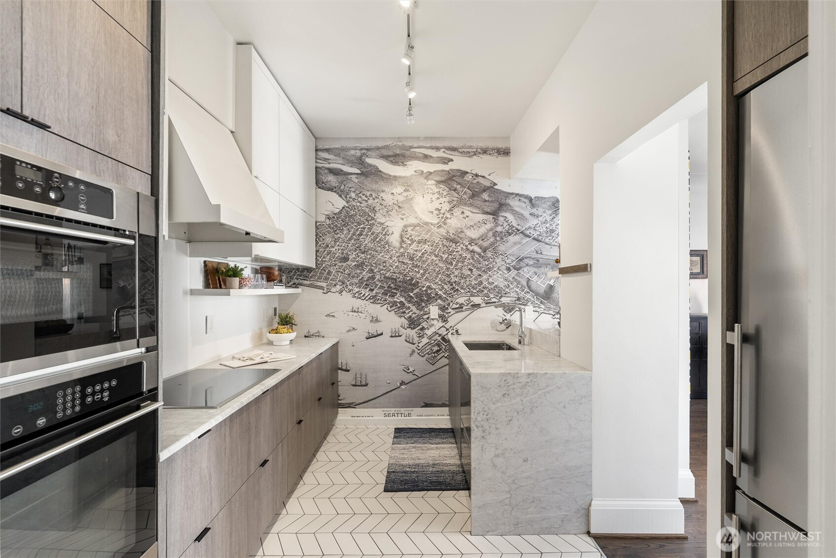 Beautifully updated 3-bedroom, 1.75-bath condo in a historic downtown Seattle building just one block from Pike Place Market. This 1,377 sq. ft. home blends timeless character with modern style and feels like an elegant apartment in Europe. Soaring ceilings, oversized windows, and rich walnut hardwood floors create a warm, light-filled feel. The spacious living and dining areas flow into a designer kitchen with marble counters, sleek cabinetry, premium appliances, and a stunning vintage Seattle map mural. The flexible floor plan includes three spacious bedrooms, beautifully updated baths, and two separate entrances—allowing the condo to easily be divided into two apartments. Perfect for multigenerational living, rental income, or adding a smart investment property to your portfolio for the price of one. Unbeatable location near the waterfront, shopping, dining, entertainment, and all the excitement of downtown Seattle—including the upcoming FIFA World Cup 2026.