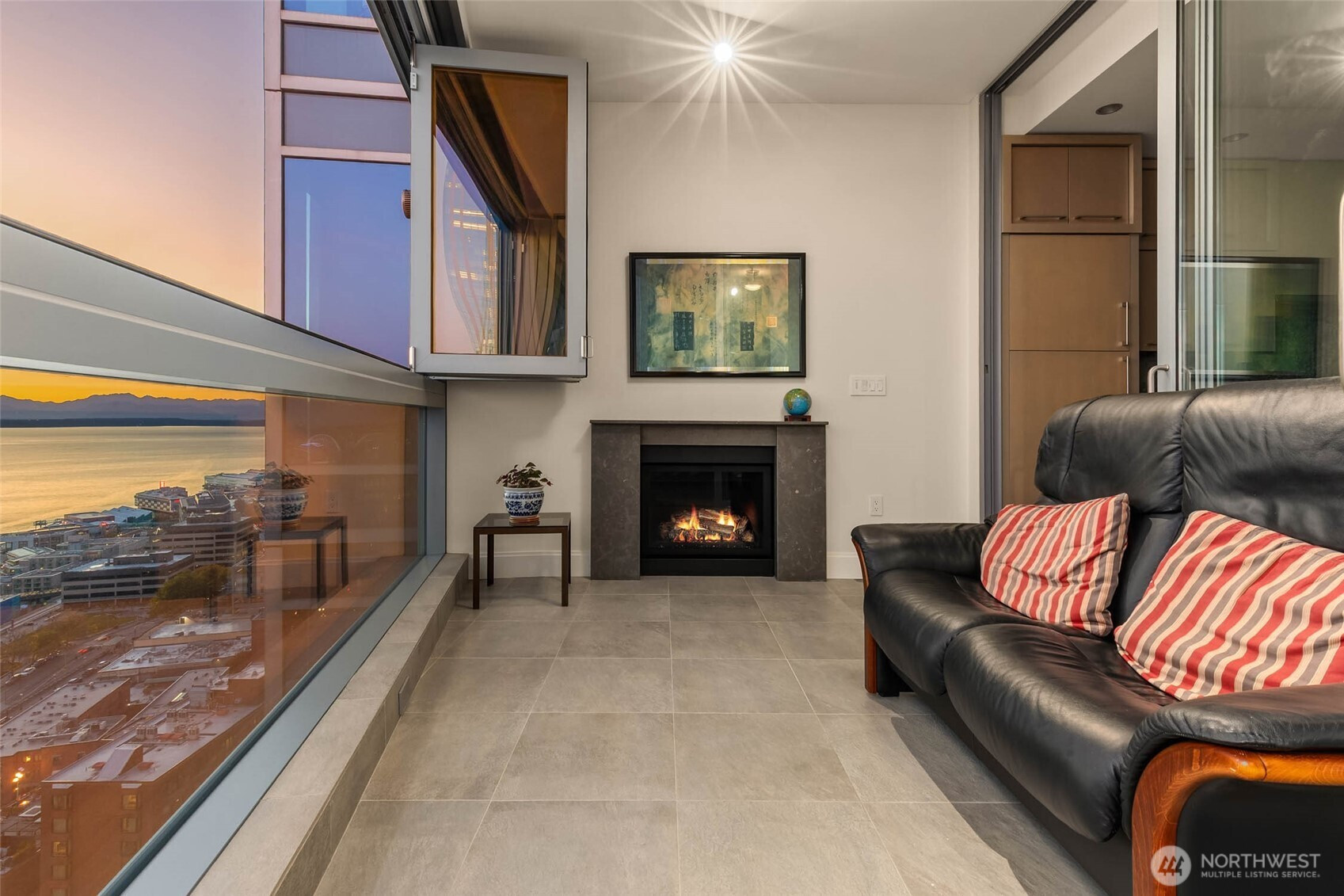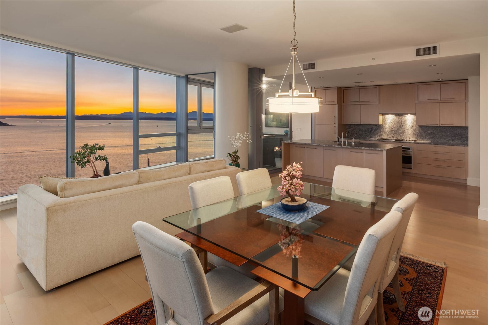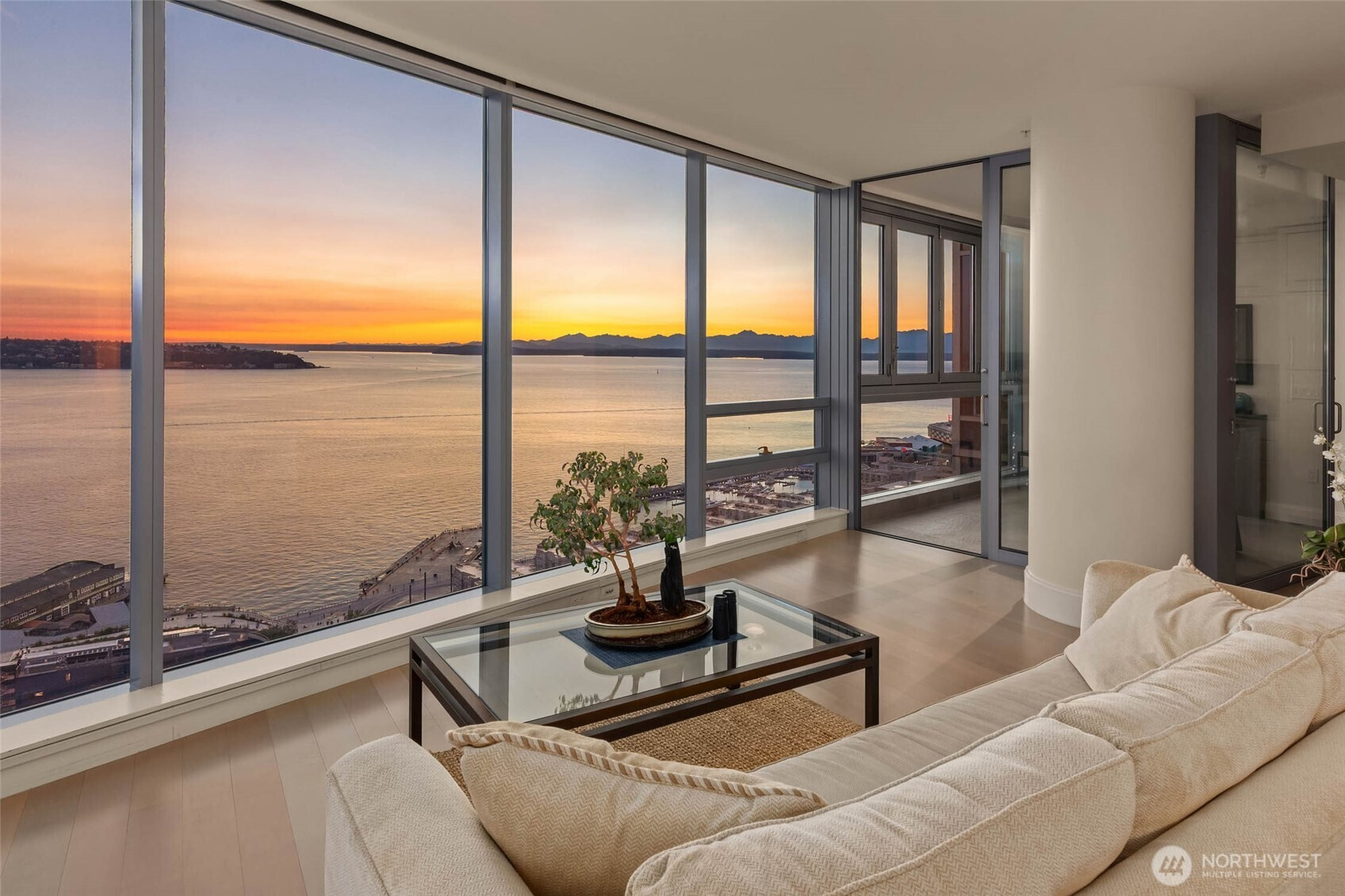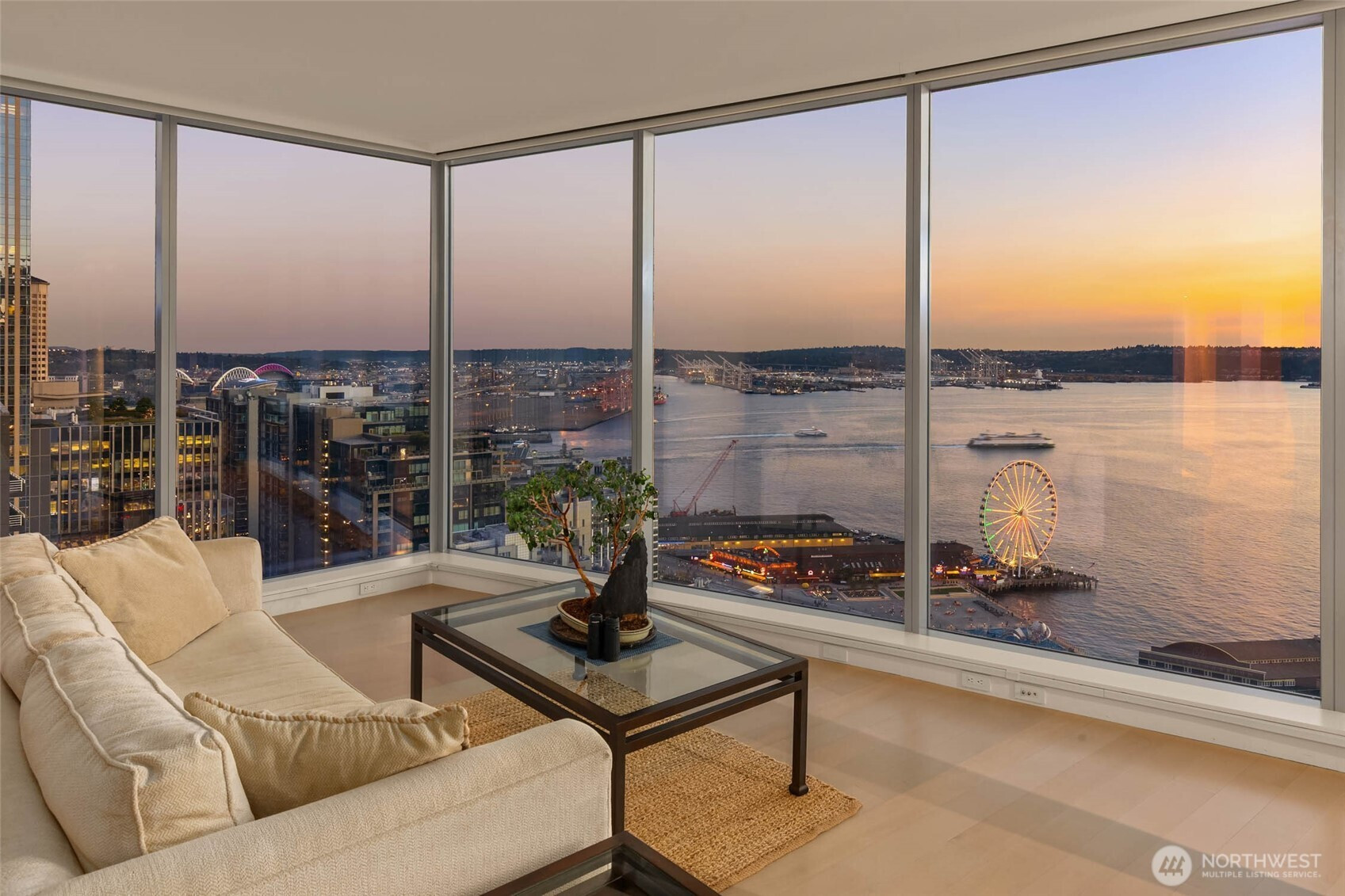 SW corner residence with grand entertaining living room with views of Elliott Bay, Olympic Mountains, Seattle waterfront, Mount Rainer and city skyline - it's a treasure. Endless entertainment the Ferris wheel, stadiums, sailboat regattas and Pike Place Market. This home has art gallery entry, epicurean kitchen with Wolf, Subzero and Miele appliances. Primary suite with water view, spa bathroom, Toto tub with water view, motorized blinds, office, wine cooler, private storage, two large parking spaces & EV charging. Just steps from Pike Place Market, Benaroya, stadiums, the arts, retail & Sculpture Park. Concierge 24/7, Walkscore 99 & two blocks to light rail. Rooftop terraces, gardens, BBQ, gym, yoga studio, boardroom, sky lounge.