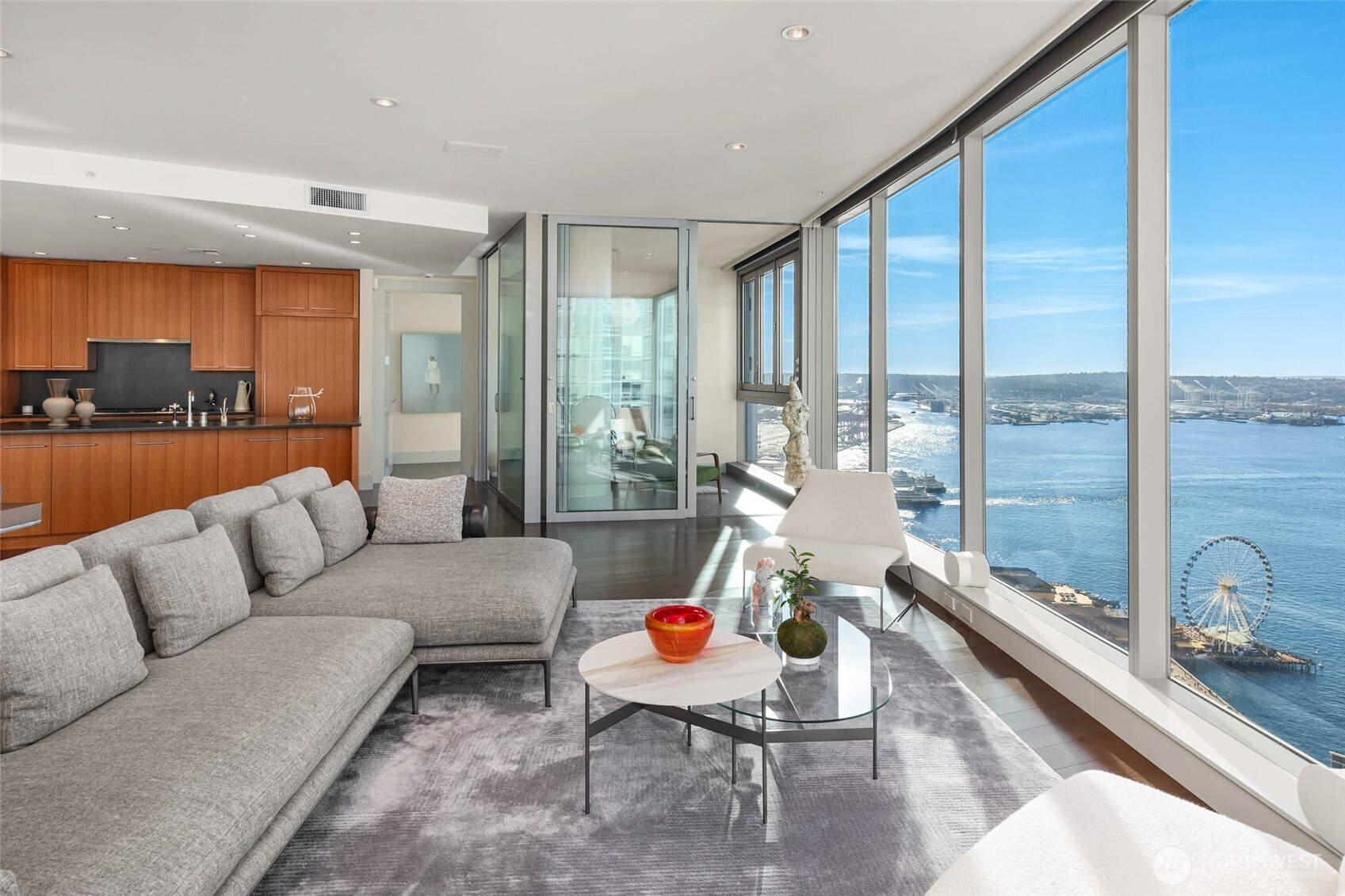 Sophisticated and refined design in this coveted NW corner home located at the award winning condominium Fifteen Twenty-One Second Avenue. Elegant art galleries for the passionate collector, gracious dining and living room for entertaining or taking in the views of Elliott Bay, Pike Place Market, Olympics and city skyline. Water and mountain views from both bedrooms located in opposite wings. Luxurious primary suite, spa bathroom, epicurean kitchen, media room, pantry, 3 parking spaces with EV, coveted large work studio, wine cellar and large storage. Concierge 24/7, new waterfront park, new aquarium, arts, restaurants, stadiums, retail and light rail. Rooftop terraces, BBq, gym, yoga, boardroom, skylounge.