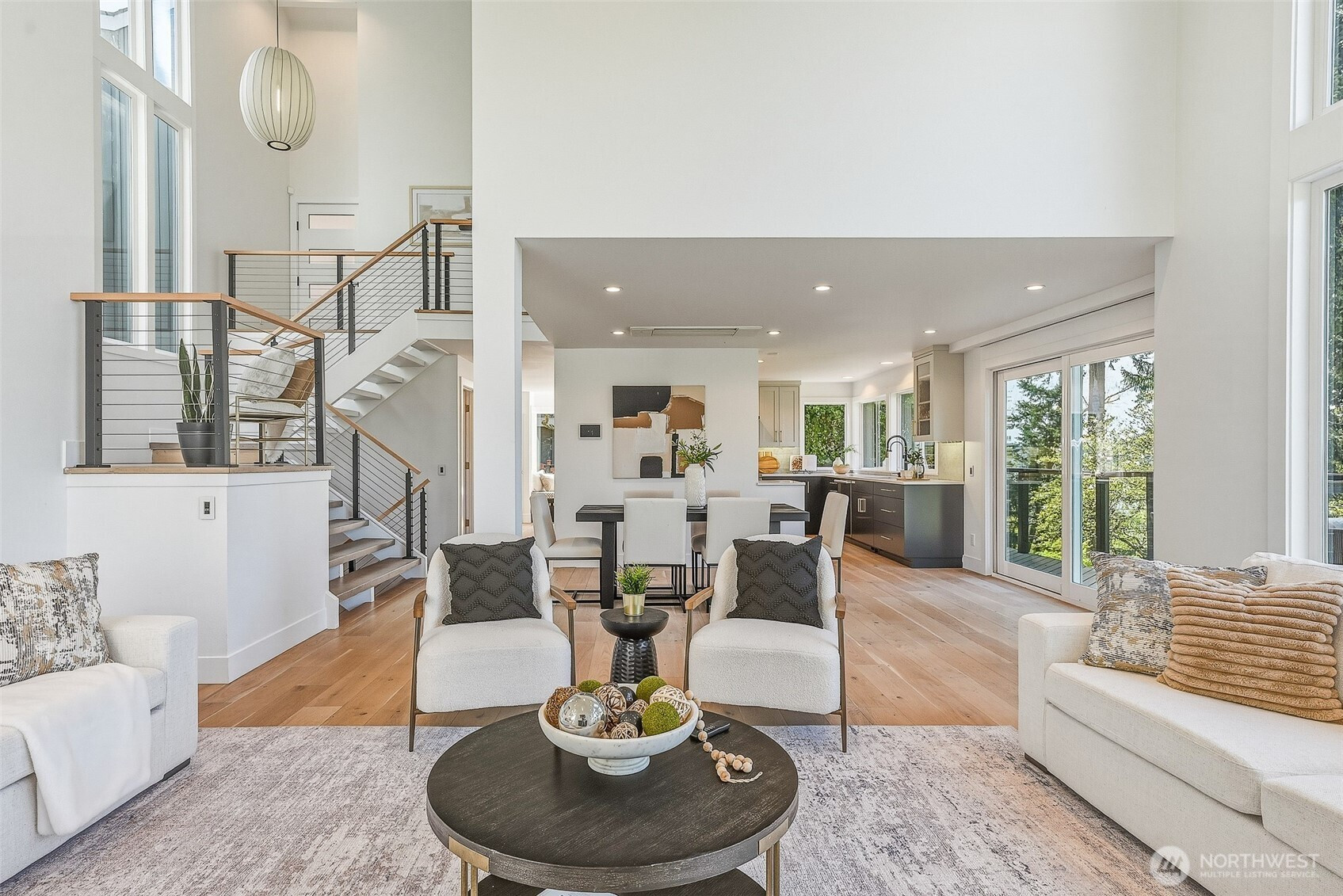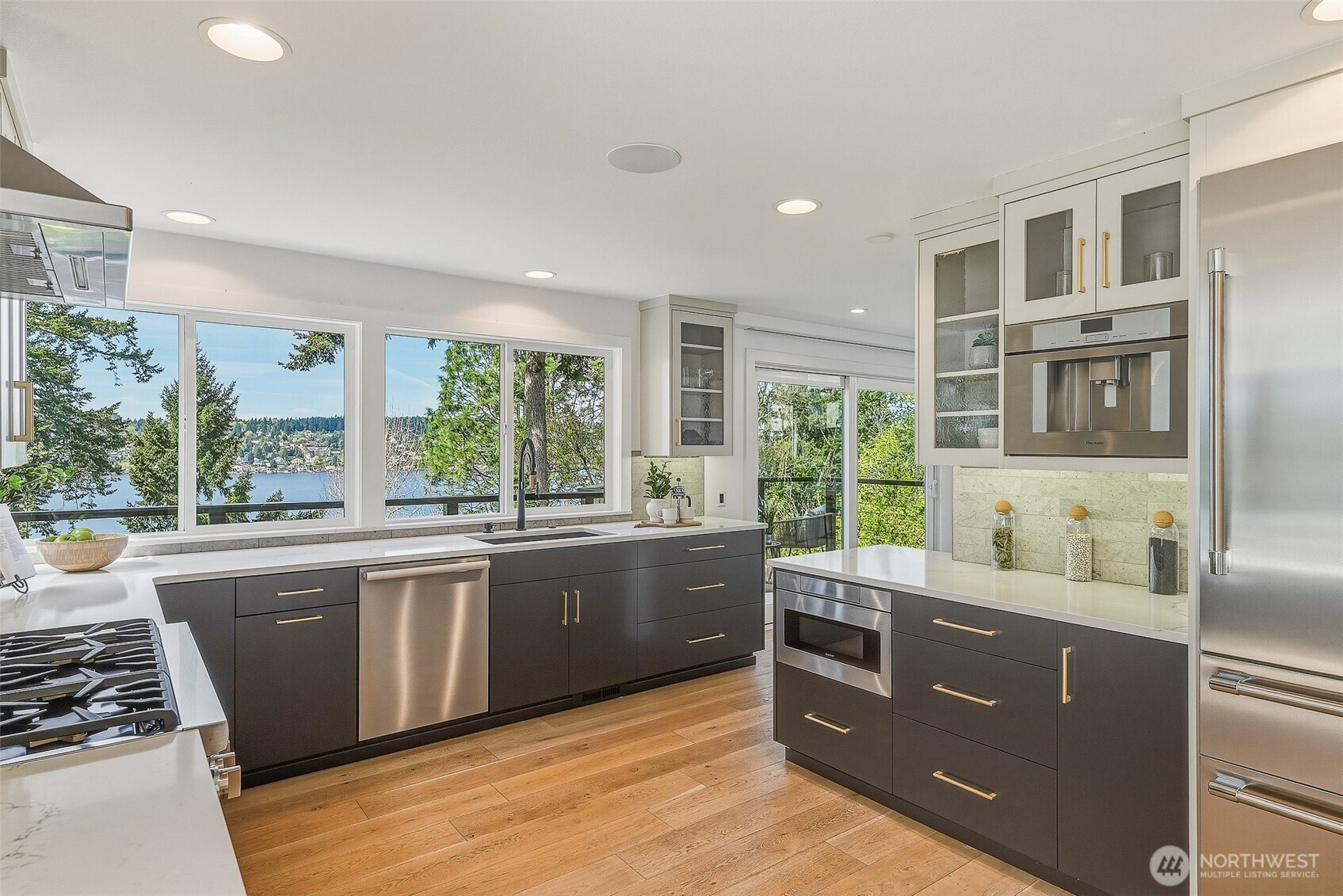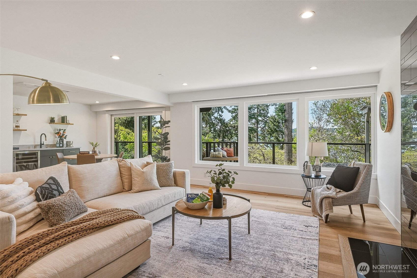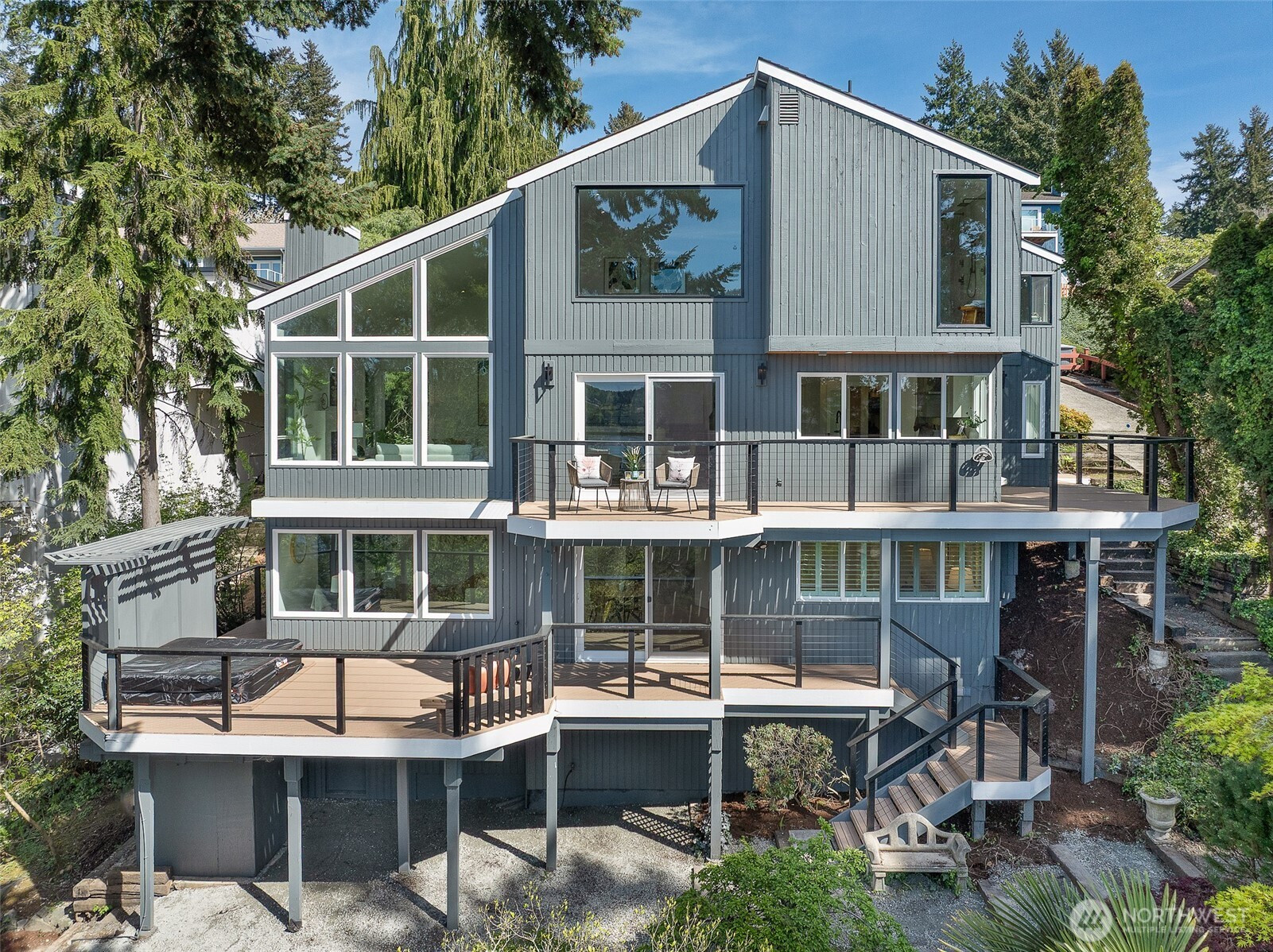 Expansive views from every level define this refined contemporary residence, where architectural lines and elevated finishes create a sense of quiet luxury. An 8-foot entry door opens to vaulted ceilings and a hand-crafted chandelier, anchoring the space with elegance. Walls of glass and oversized picture windows fill the home with natural light and frame the surrounding landscape. Engineered hardwoods flow through living and dining areas into the functional and polished kitchen, featuring Thermador appliances, a smart refrigerator, Wi-Fi compatible 6-burner gas stove and oven, built-in microwave drawer and coffee maker, plus a butler’s pantry. The vaulted primary suite is a true retreat with a sleek 5-pc bath, boasting a dual walk-in shower with rainfall showerheads, heated floors, a freestanding stone tub, and a generous walk-in closet. The great room is designed for entertainment, with a beverage bar, hidden speakers, and access to the lower deck. A view-facing hot tub extends the living experience outdoors. Integrated smart features include pre-wiring for lighting, automated shades, invisible speakers, and a robust network (ready for activation) with security and whole-home Wi-Fi. Outdoor living spaces are nestled among mature landscaping, offering privacy and a peaceful, treehouse-like setting. Northshore schools, including the highly ranked Inglemoor High School known for its International Baccalaureate program. Near Inglewood Country Club with easy access to I-405.