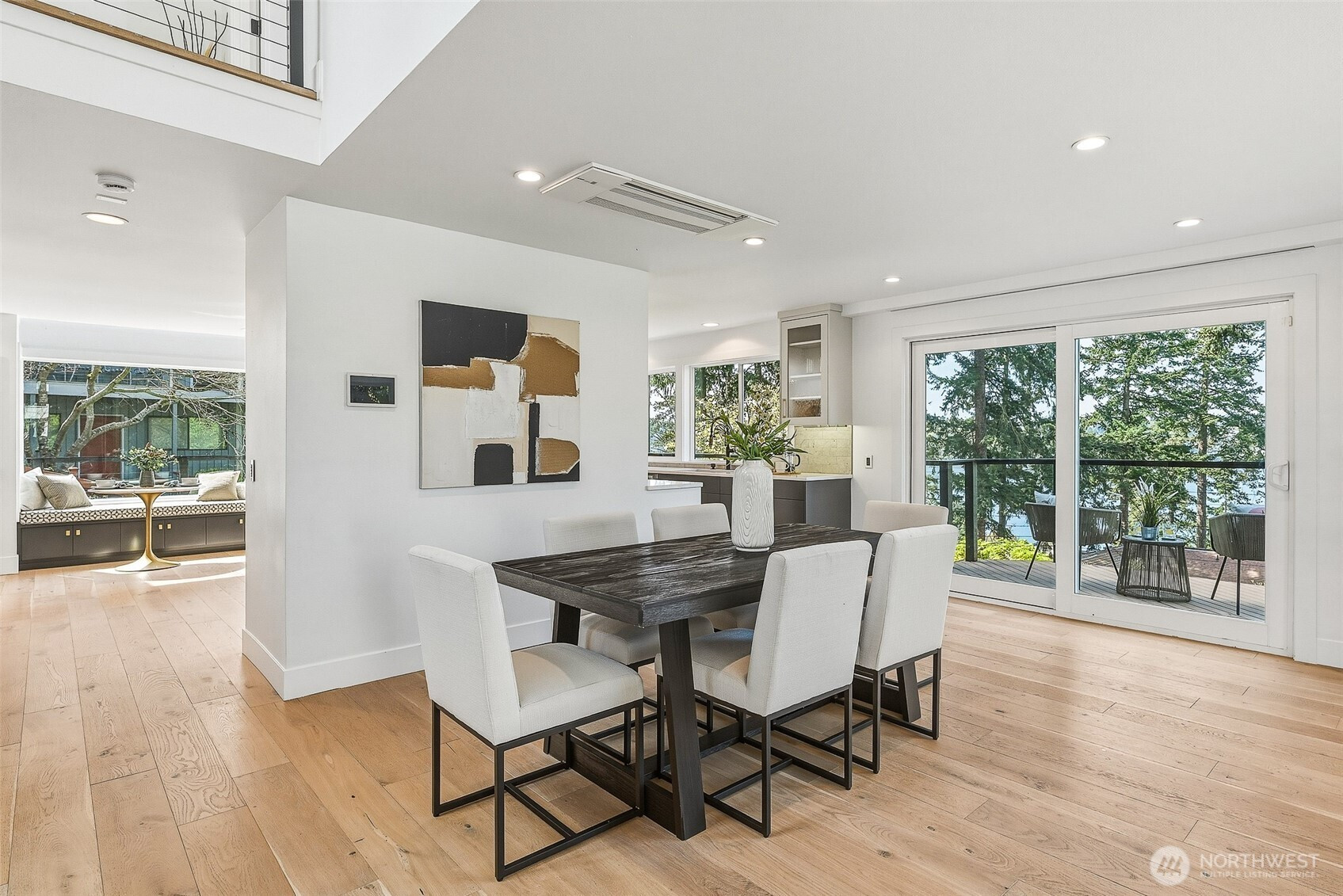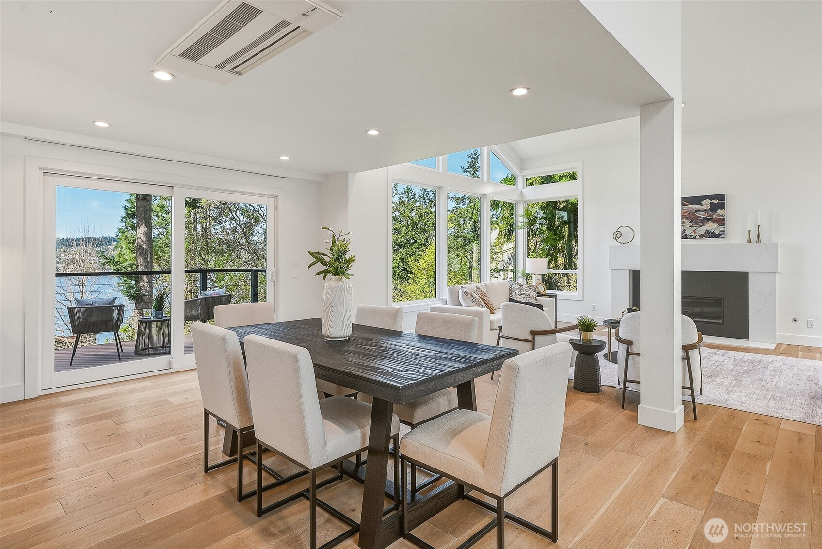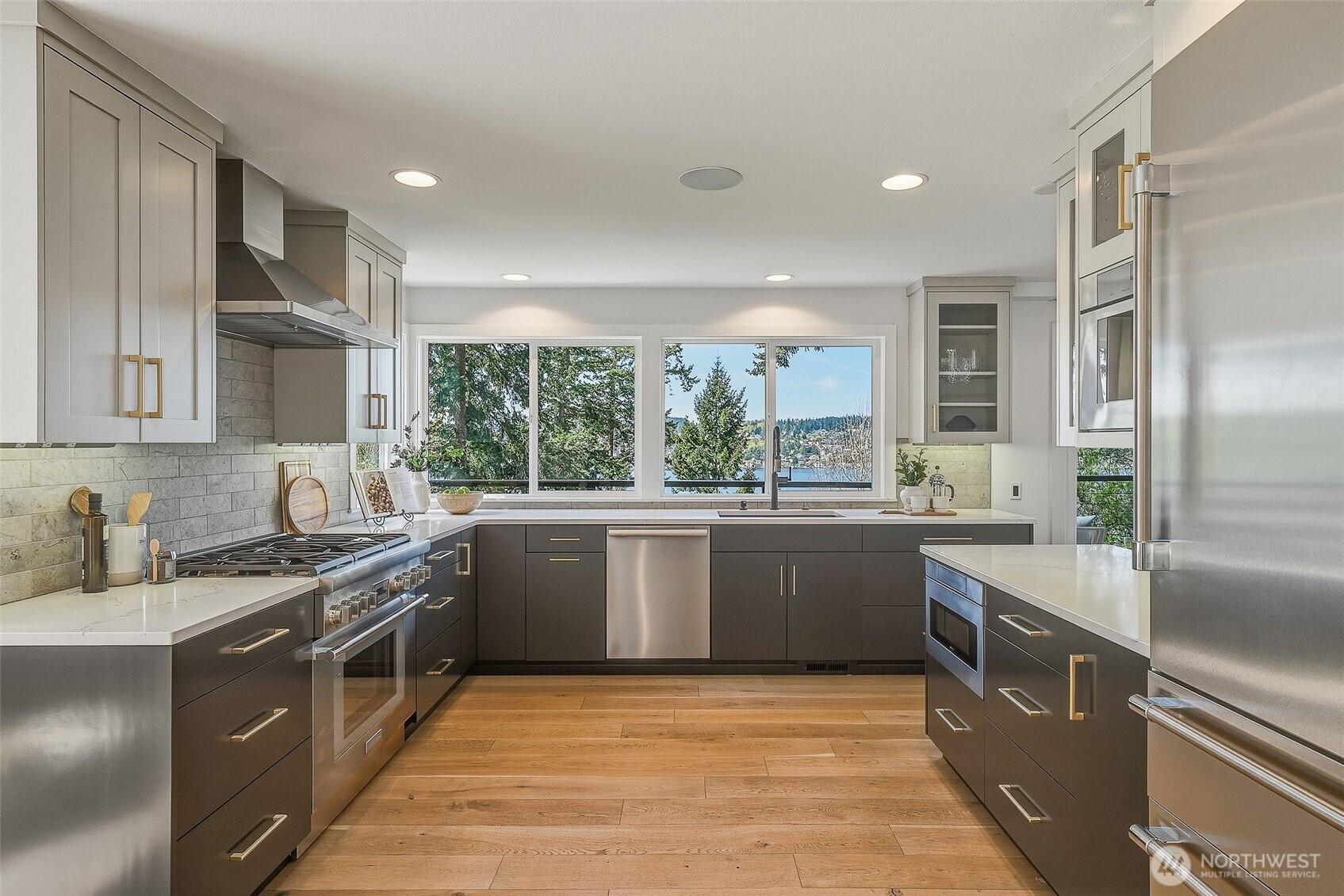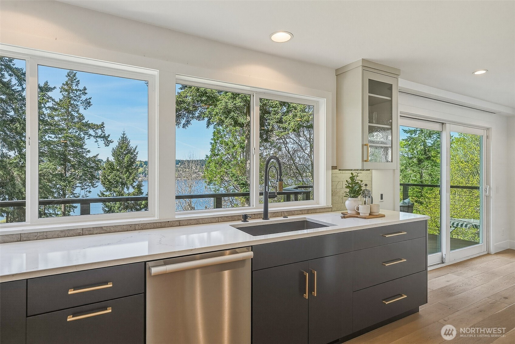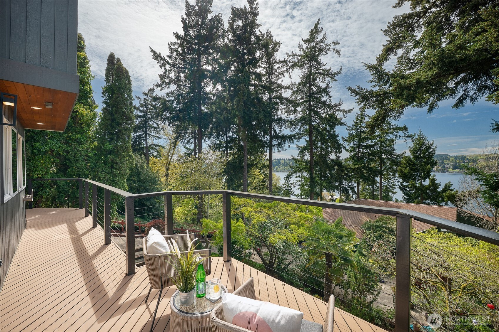 Expansive views from every level define this refined contemporary residence, where architectural lines and elevated finishes create a sense of quiet luxury. An 8-foot entry door opens to vaulted ceilings and a hand-crafted chandelier, anchoring the space with elegance. Walls of glass and oversized picture windows fill the home with natural light and frame the surrounding landscape. Engineered hardwoods flow through living and dining areas into the functional and polished kitchen, featuring Thermador appliances, a smart refrigerator, Wi-Fi compatible 6-burner gas stove and oven, built-in microwave drawer and coffee maker, plus a butler’s pantry. The vaulted primary suite is a true retreat with a sleek 5-pc bath, boasting a dual walk-in shower with rainfall showerheads, heated floors, a freestanding stone tub, and a generous walk-in closet. The great room is designed for entertainment, with a beverage bar, hidden speakers, and access to the lower deck. A view-facing hot tub extends the living experience outdoors. Integrated smart features include pre-wiring for lighting, automated shades, invisible speakers, and a robust network (ready for activation) with security and whole-home Wi-Fi. Outdoor living spaces are nestled among mature landscaping, offering privacy and a peaceful, treehouse-like setting. Northshore schools, including the highly ranked Inglemoor High School known for its International Baccalaureate program. Near Inglewood Country Club with easy access to I-405.