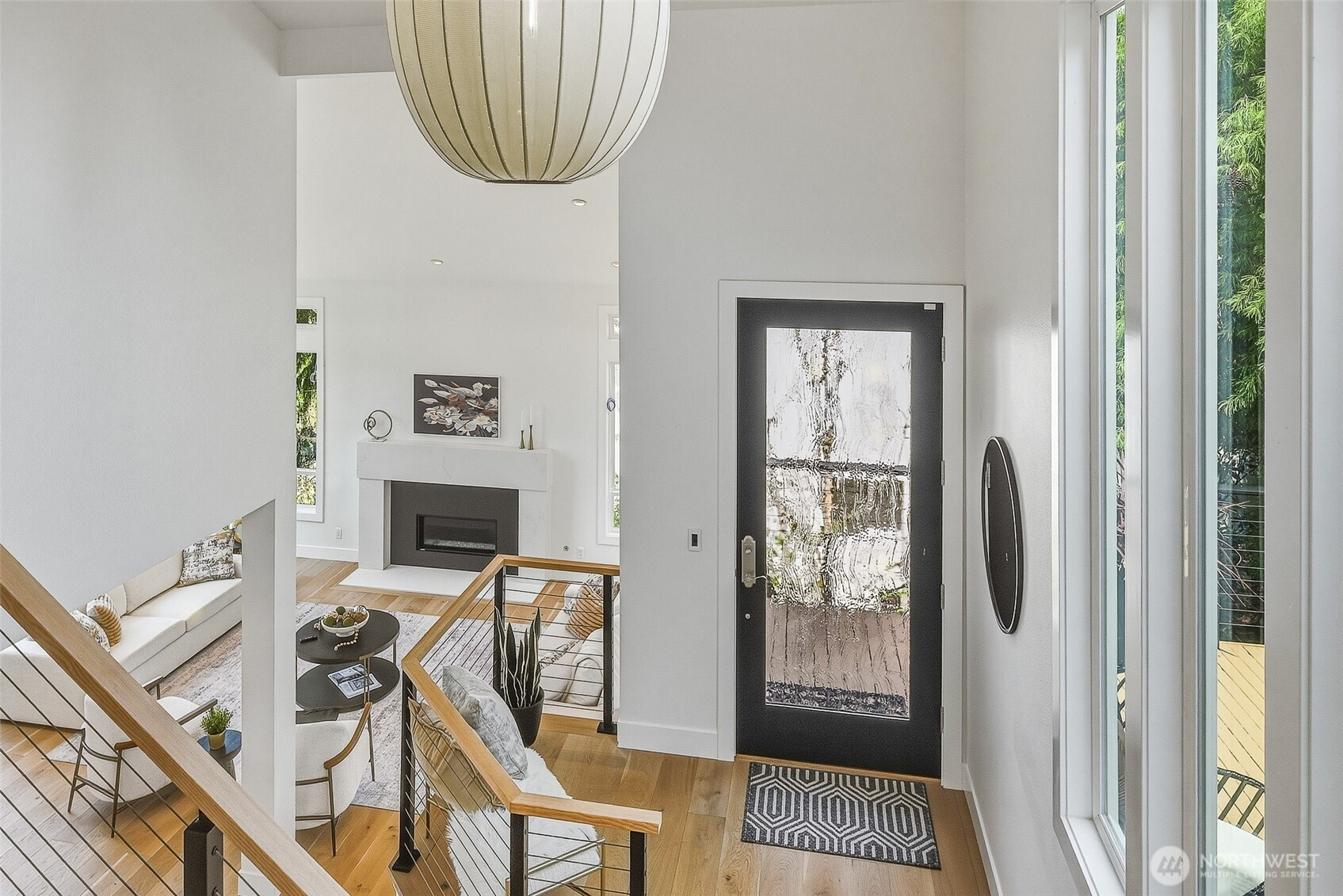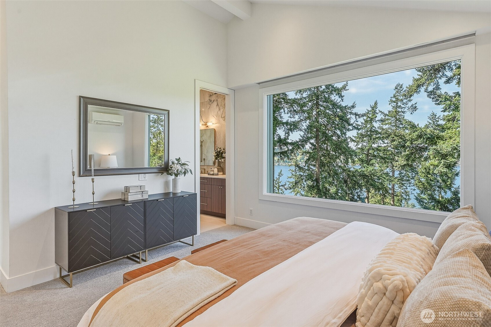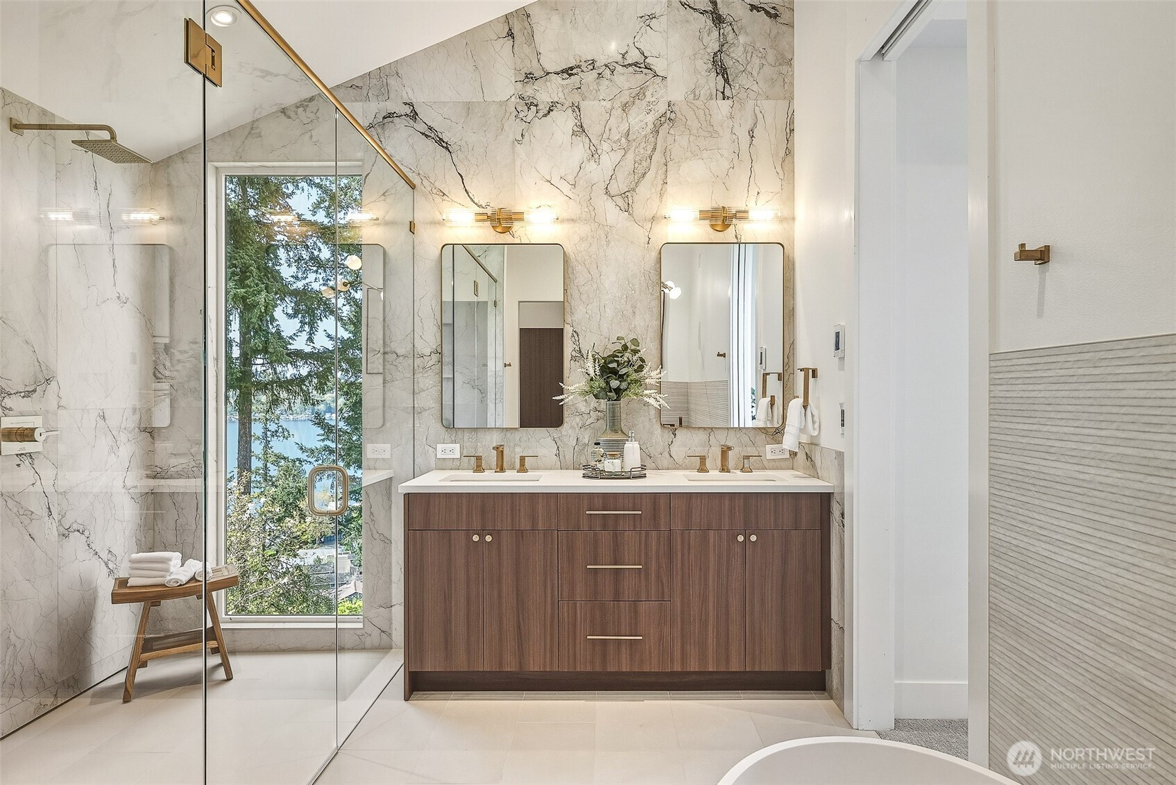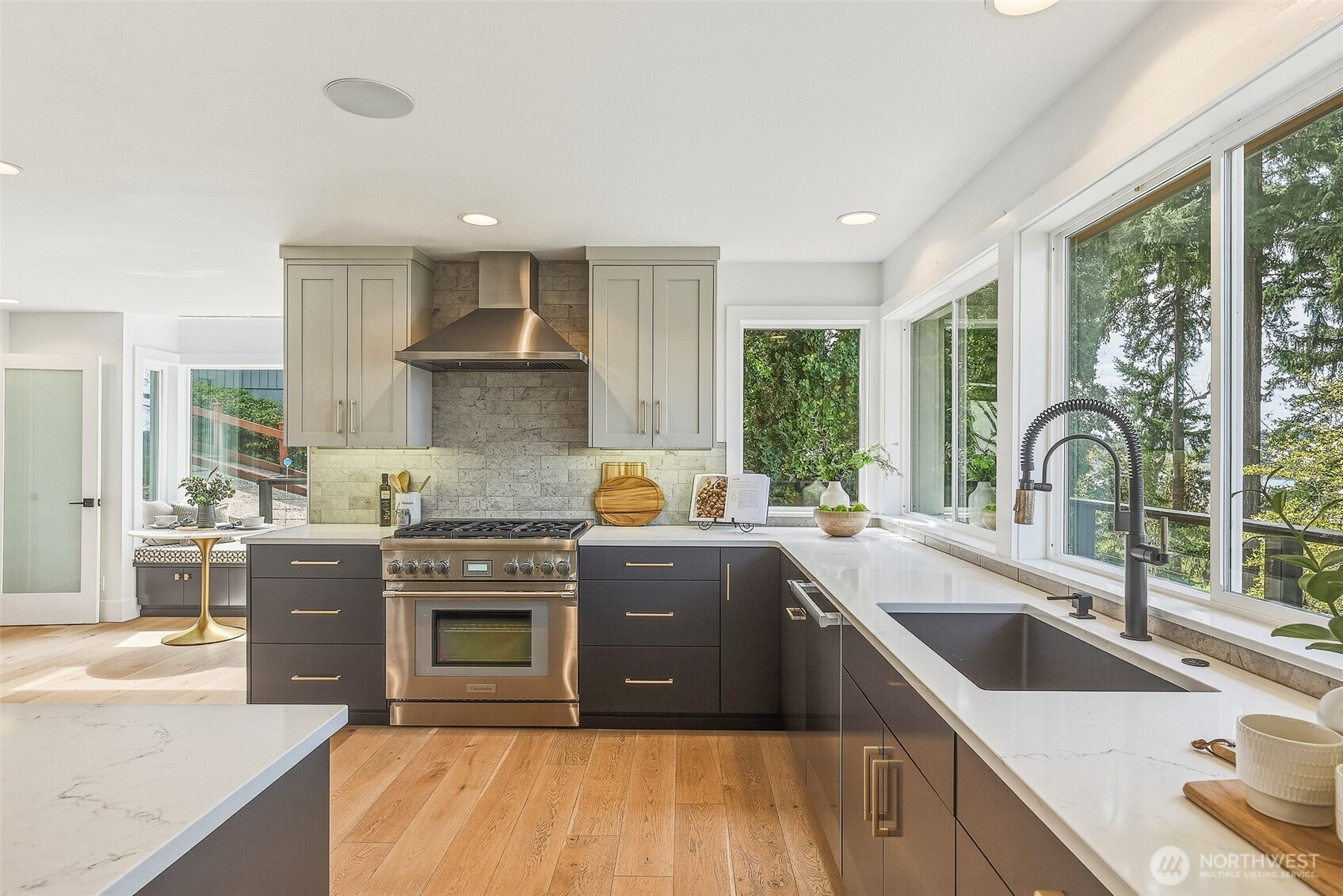 Expansive views from every level define this refined contemporary residence, where architectural lines and elevated finishes create a sense of quiet luxury. An 8-foot entry door opens to vaulted ceilings and a hand-crafted chandelier, anchoring the space with elegance. Walls of glass and oversized picture windows fill the home with natural light and frame the surrounding landscape. Engineered hardwoods flow through living and dining areas into the functional and polished kitchen, featuring Thermador appliances, a smart refrigerator, Wi-Fi compatible 6-burner gas stove and oven, built-in microwave drawer and coffee maker, plus a butler’s pantry. The vaulted primary suite is a true retreat with a sleek 5-pc bath, boasting a dual walk-in shower with rainfall showerheads, heated floors, a freestanding stone tub, and a generous walk-in closet. The great room is designed for entertainment, with a beverage bar, hidden speakers, and access to the lower deck. A view-facing hot tub extends the living experience outdoors. Integrated smart features include pre-wiring for lighting, automated shades, invisible speakers, and a robust network (ready for activation) with security and whole-home Wi-Fi. Outdoor living spaces are nestled among mature landscaping, offering privacy and a peaceful, treehouse-like setting. Northshore schools, including the highly ranked Inglemoor High School known for its International Baccalaureate program. Near Inglewood Country Club with easy access to I-405.