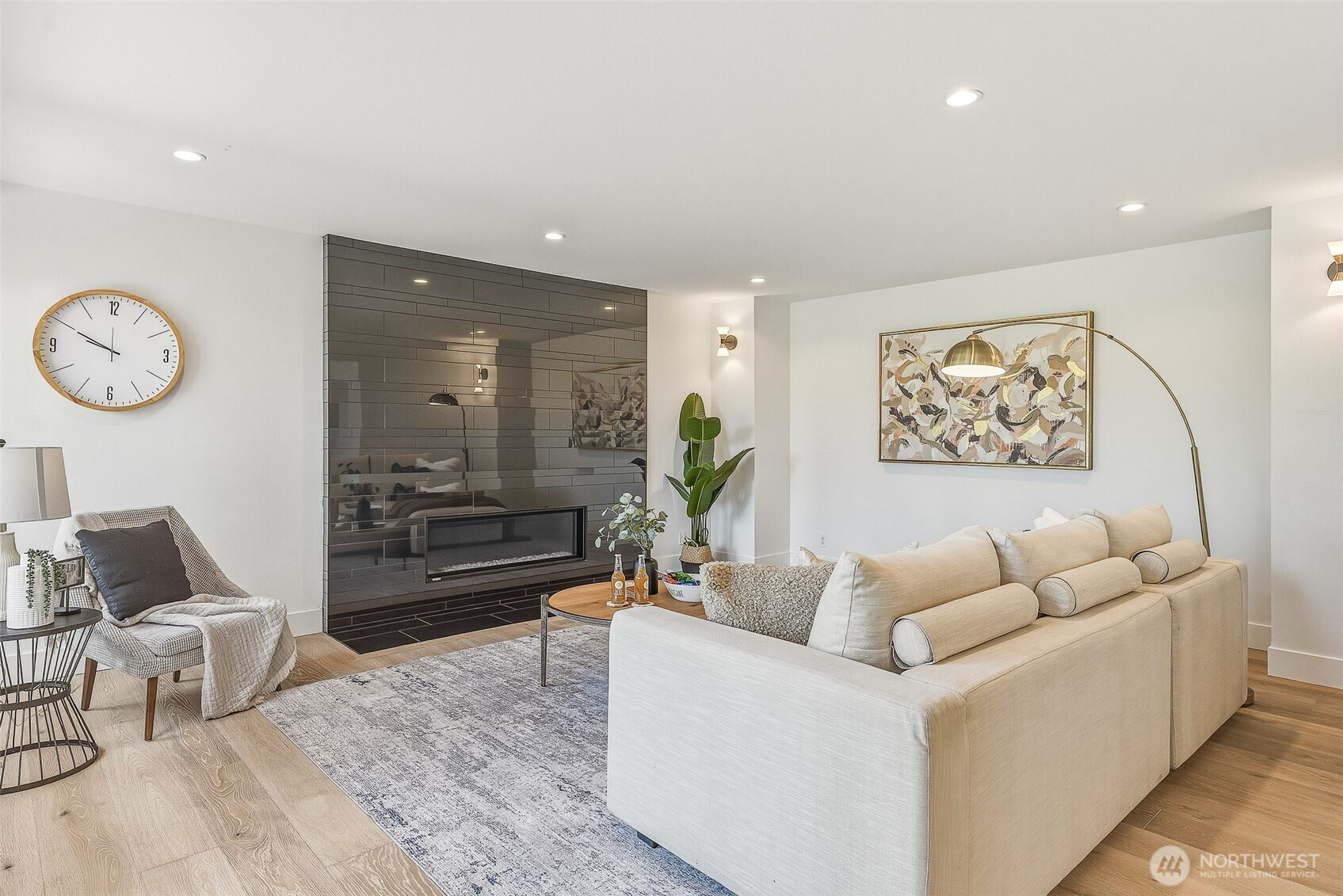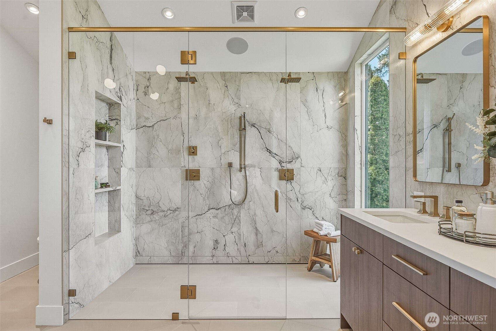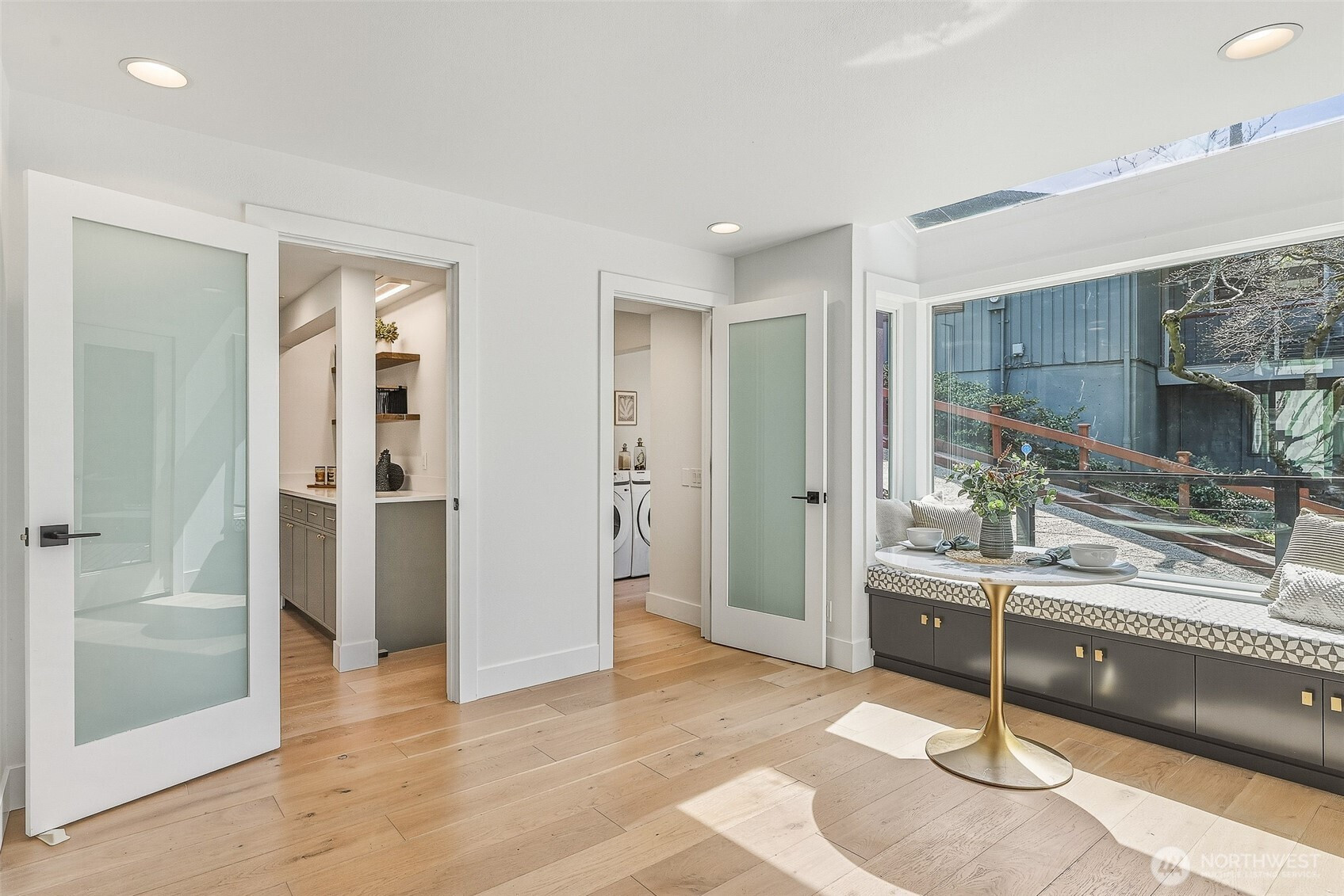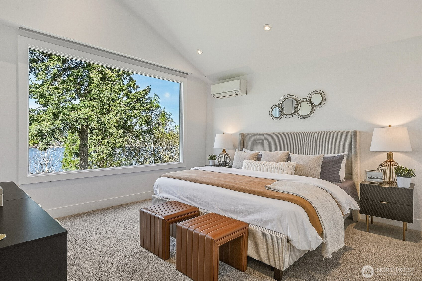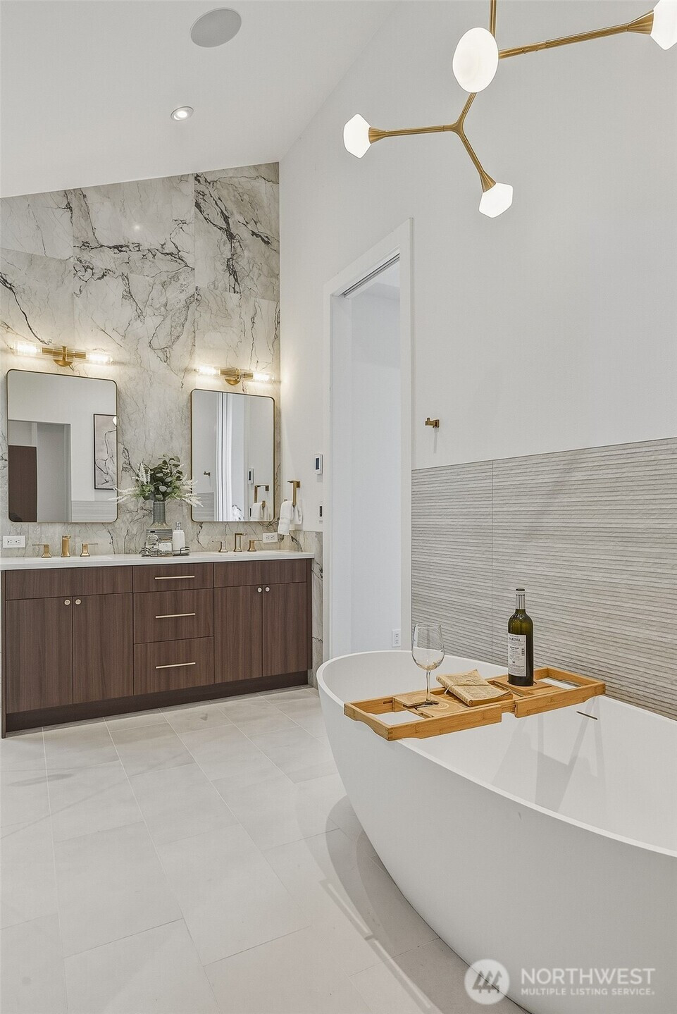 Expansive views from every level define this refined contemporary residence, where architectural lines and elevated finishes create a sense of quiet luxury. An 8-foot entry door opens to vaulted ceilings and a hand-crafted chandelier, anchoring the space with elegance. Walls of glass and oversized picture windows fill the home with natural light and frame the surrounding landscape. Engineered hardwoods flow through living and dining areas into the functional and polished kitchen, featuring Thermador appliances, a smart refrigerator, Wi-Fi compatible 6-burner gas stove and oven, built-in microwave drawer and coffee maker, plus a butler’s pantry. The vaulted primary suite is a true retreat with a sleek 5-pc bath, boasting a dual walk-in shower with rainfall showerheads, heated floors, a freestanding stone tub, and a generous walk-in closet. The great room is designed for entertainment, with a beverage bar, hidden speakers, and access to the lower deck. A view-facing hot tub extends the living experience outdoors. Integrated smart features include pre-wiring for lighting, automated shades, invisible speakers, and a robust network (ready for activation) with security and whole-home Wi-Fi. Outdoor living spaces are nestled among mature landscaping, offering privacy and a peaceful, treehouse-like setting. Northshore schools, including the highly ranked Inglemoor High School known for its International Baccalaureate program. Near Inglewood Country Club with easy access to I-405.