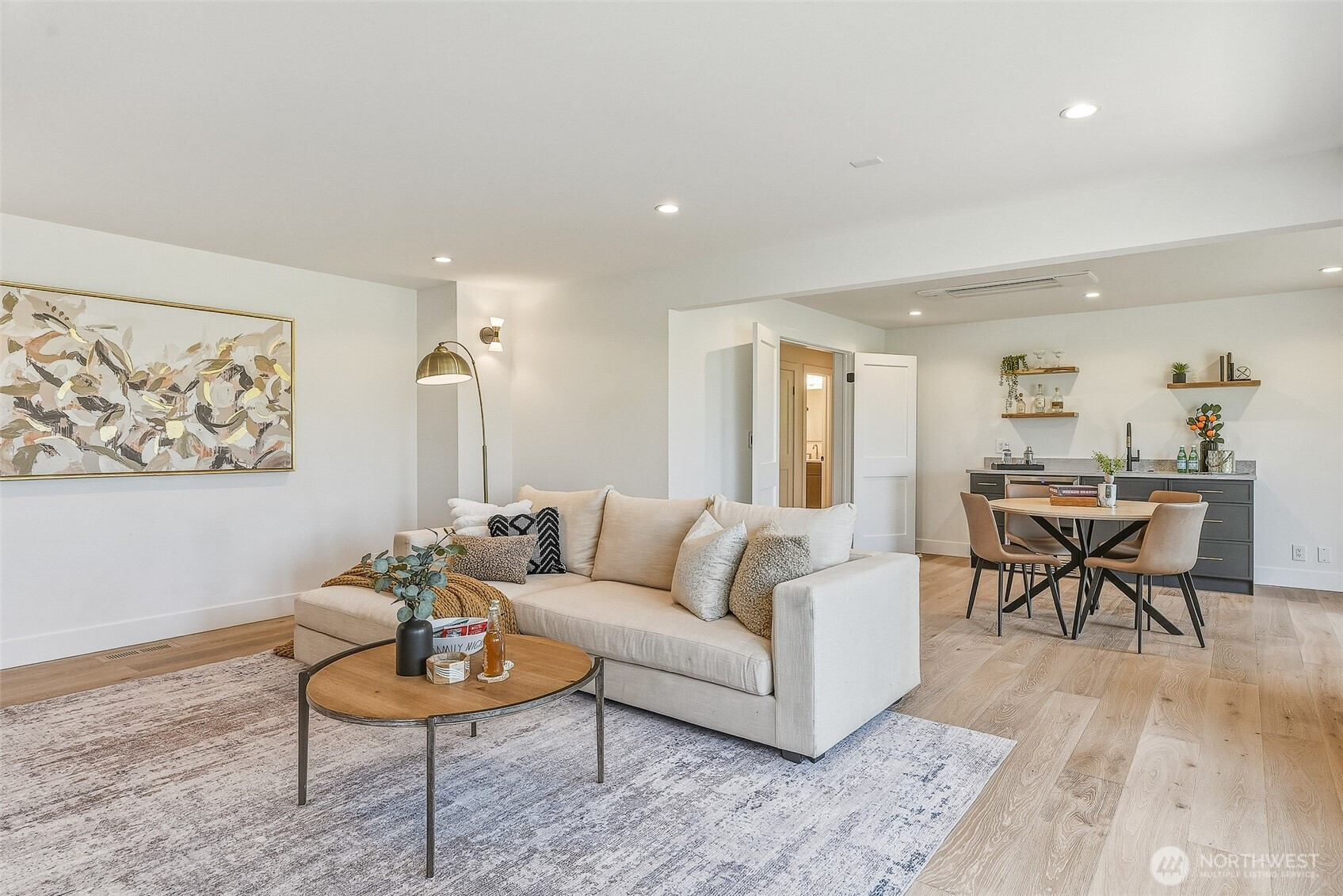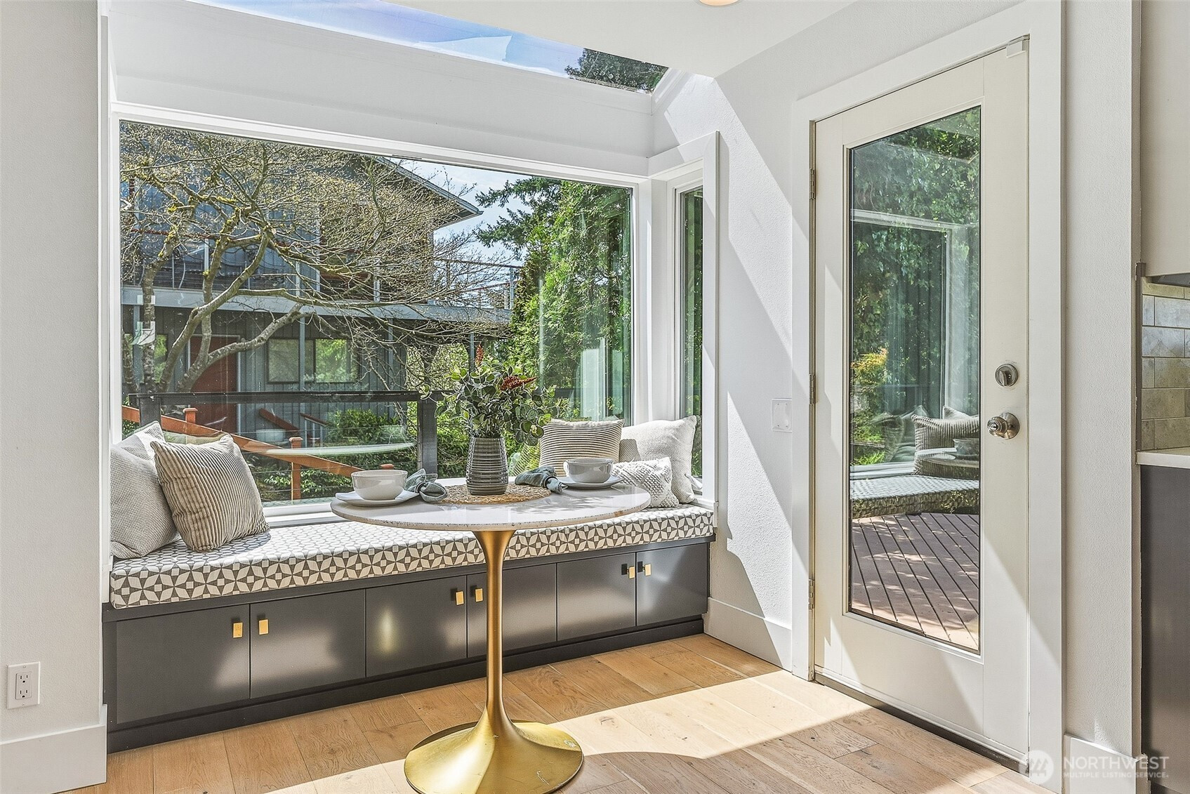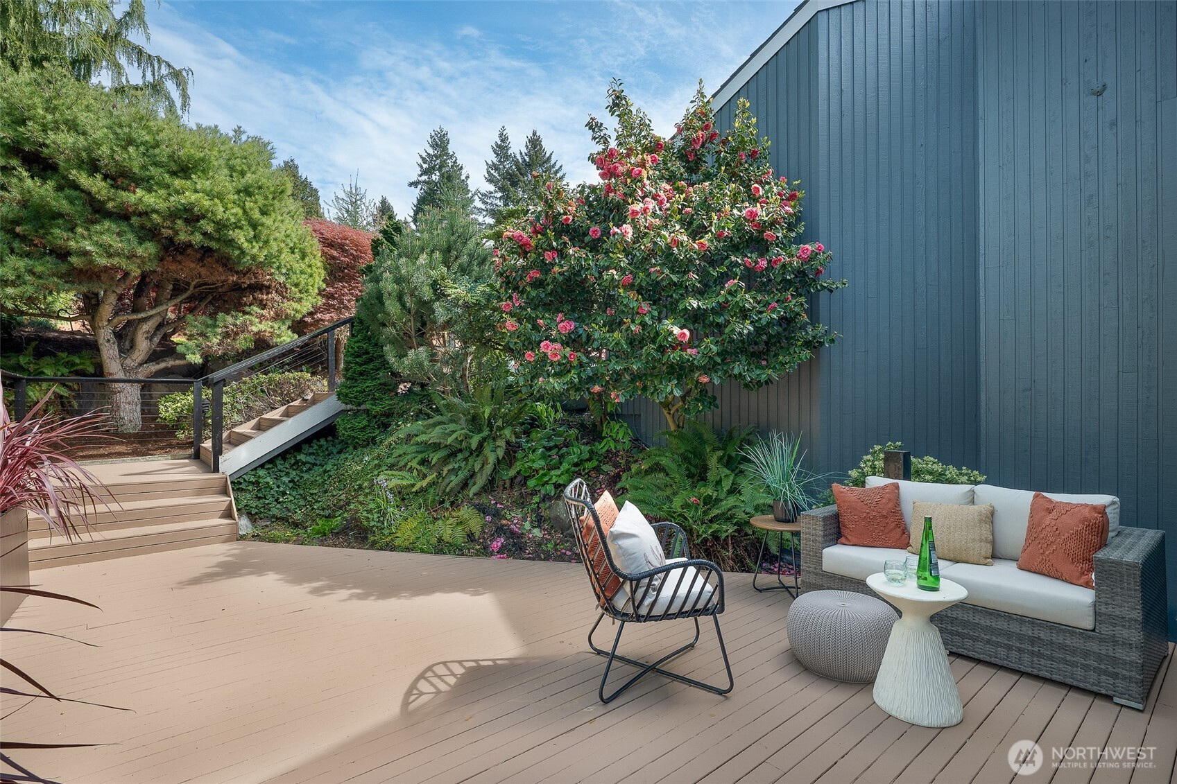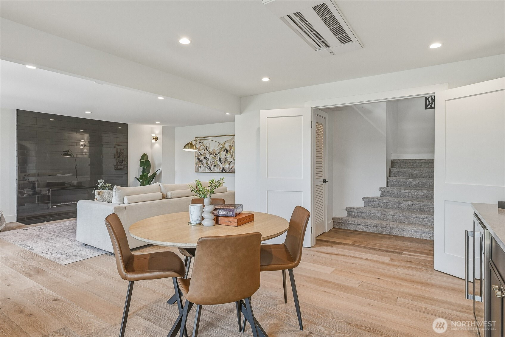 Expansive views from every level define this refined contemporary residence, where architectural lines and elevated finishes create a sense of quiet luxury. An 8-foot entry door opens to vaulted ceilings and a hand-crafted chandelier, anchoring the space with elegance. Walls of glass and oversized picture windows fill the home with natural light and frame the surrounding landscape. Engineered hardwoods flow through living and dining areas into the functional and polished kitchen, featuring Thermador appliances, a smart refrigerator, Wi-Fi compatible 6-burner gas stove and oven, built-in microwave drawer and coffee maker, plus a butler’s pantry. The vaulted primary suite is a true retreat with a sleek 5-pc bath, boasting a dual walk-in shower with rainfall showerheads, heated floors, a freestanding stone tub, and a generous walk-in closet. The great room is designed for entertainment, with a beverage bar, hidden speakers, and access to the lower deck. A view-facing hot tub extends the living experience outdoors. Integrated smart features include pre-wiring for lighting, automated shades, invisible speakers, and a robust network (ready for activation) with security and whole-home Wi-Fi. Outdoor living spaces are nestled among mature landscaping, offering privacy and a peaceful, treehouse-like setting. Northshore schools, including the highly ranked Inglemoor High School known for its International Baccalaureate program. Near Inglewood Country Club with easy access to I-405.