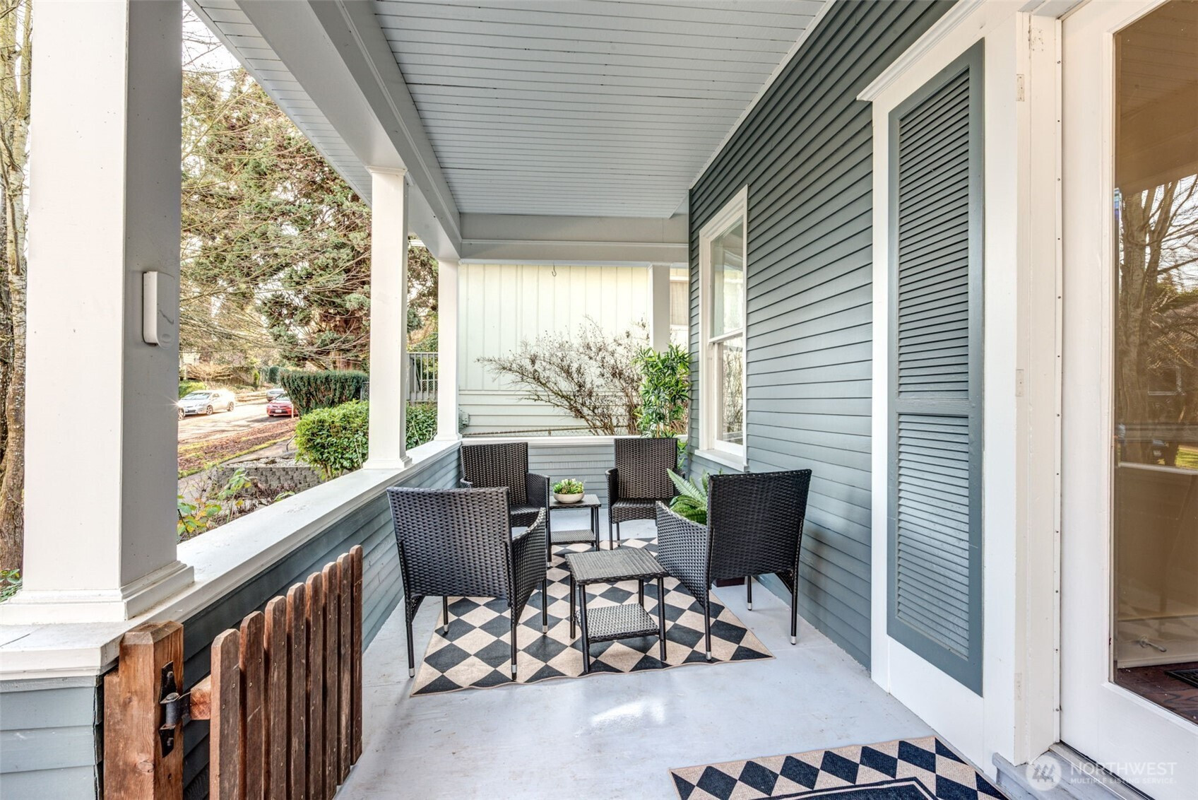 Gracefully positioned in the heart of Madrona, this classic 1901 Craftsman blends timeless architecture with an exceptional Seattle lifestyle. A welcoming covered front porch sets the tone, inviting quiet moments and effortless neighborhood connection. Inside, a spacious foyer with a built-in bench opens to a comfortable living room featuring a gas fireplace, flowing seamlessly into the dining room for refined everyday living and entertaining. The light-filled kitchen is appointed with birch cabinetry, granite countertops, stainless steel appliances, and heated slate flooring. A main-level bedroom opens to a rear deck and a serene backyard with garden space, creating an inviting private retreat. Upstairs, three spacious bedrooms with new carpeting are complemented by a full bath with heated tile floors. Abundant natural light fills the home throughout. Recent updates include a newer roof (2020) and heat pump (2022) providing central A/C. Freshly painted inside and out. A one-car garage with additional driveway parking adds everyday convenience. Ideally located just one block from the vibrant shops, restaurants, and cafés along 34th Avenue and only a half mile from Madrona Beach Park. With a Walk Score of 90, enjoy easy access to neighborhood favorites and nearby green spaces. An enduring residence in one of Seattle’s most sought-after enclaves.