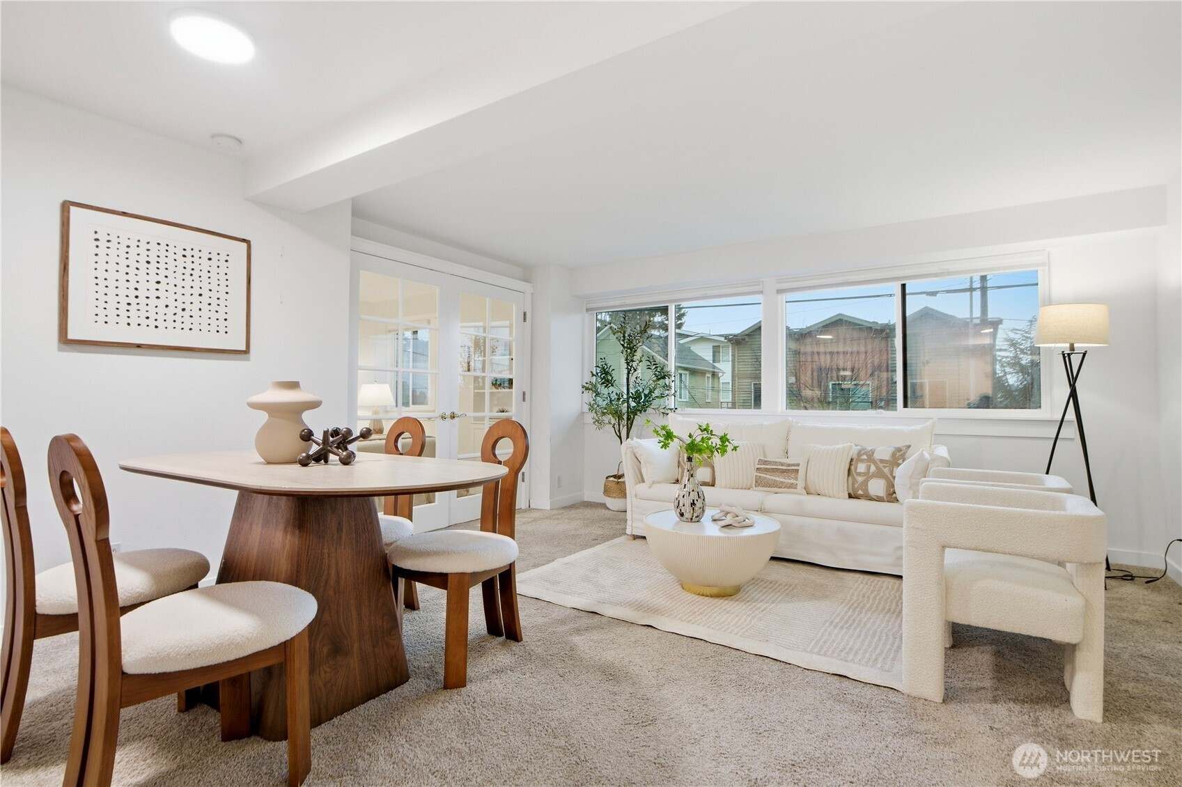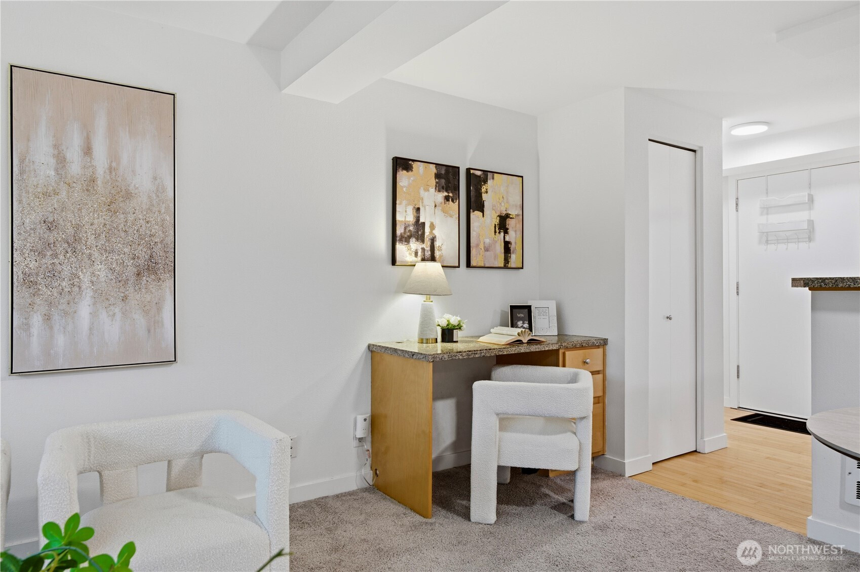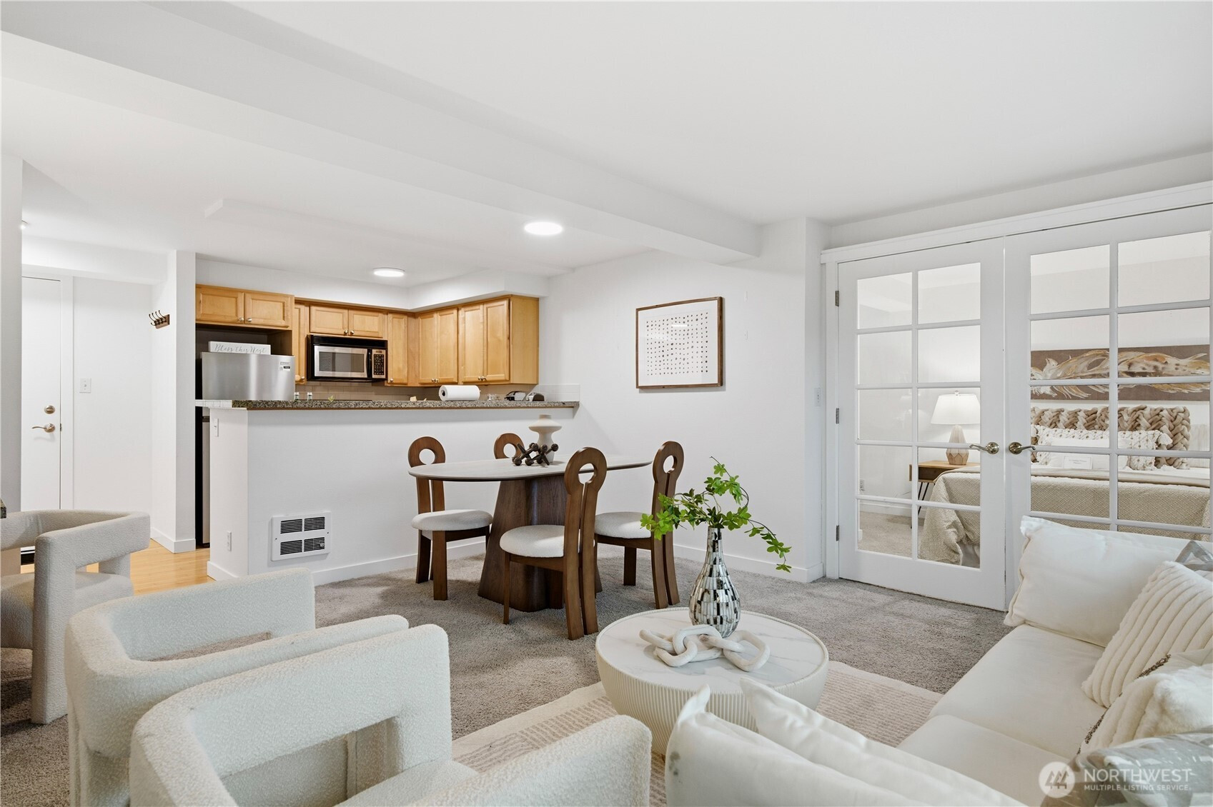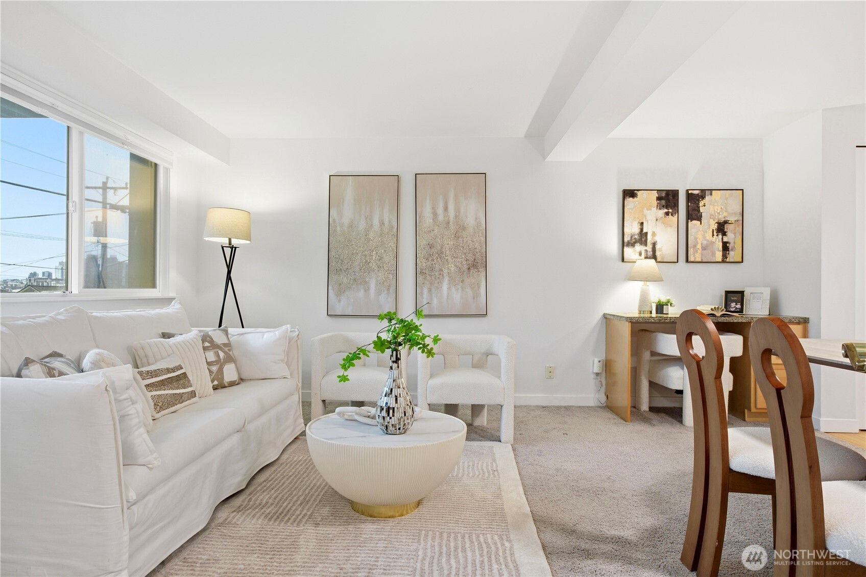 Welcome to your in-city oasis minutes from the Space Needle, Kerry Park, South Lake Union, and Queen Anne Ave. Enjoy downtown Seattle views through a wall of windows and French doors leading to the bedroom with built-ins, ensuite bath, and walk-in closet. Open kitchen features stainless steel appliances, granite counters, and a breakfast bar. Recently updated with new carpet, paint, and LED lighting. Pet-friendly building with no rental cap and dedicated storage. Close to Climate Pledge Arena, McCaw Hall, dining, shopping, and entertainment. A must see!