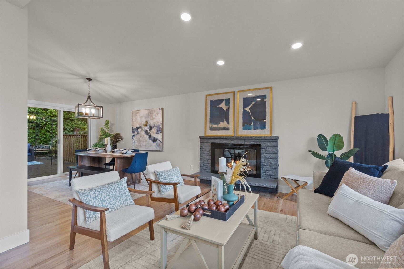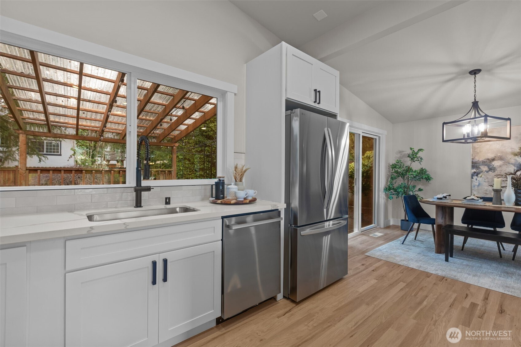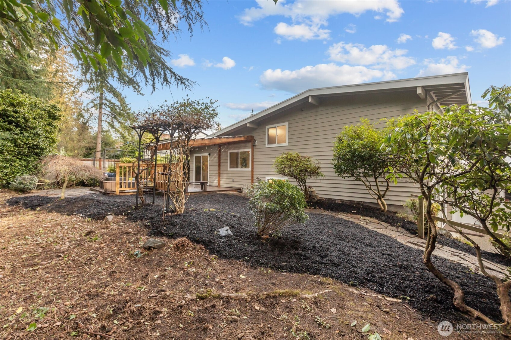 Tri-Level Living Done Right. Beautifully refreshed Northwest Contemporary offering partial Cascade Mountain views and a layout that truly lives well. The heart of the home is the light-filled main living level, where vaulted ceilings and expansive windows capture glimpses of the Cascades. The stone fireplace anchors the living room, creating warmth and architectural character. The fully remodeled kitchen features quartz countertops, new cabinetry, new LG stainless steel appliances, and a generous center island with seating-seamlessly connecting to the dining area with easy access to the deck for effortless indoor-outdoor entertaining. Upstairs, three bedrooms provide privacy and comfort, including a peaceful primary suite with updated 3/4 bath and modern finishes. The additional bedrooms enjoy partial mountain and territorial views and share a remodeled full bath with quartz surfaces and subway tile surround. On the main level, a spacious family room with sliding door access to the private side patio offers flexible living space-ideal for movie nights, guests, hobbies, or multi-generational living. A fourth bedroom & remodeled 3/4 bath complete this level, adding versatility and convenience. Fresh exterior paint, new windows, professional landscaping, and thoughtful updates throughout make this home truly move-in ready-all in a desirable East Bellevue location close to parks, schools, and commuter routes.