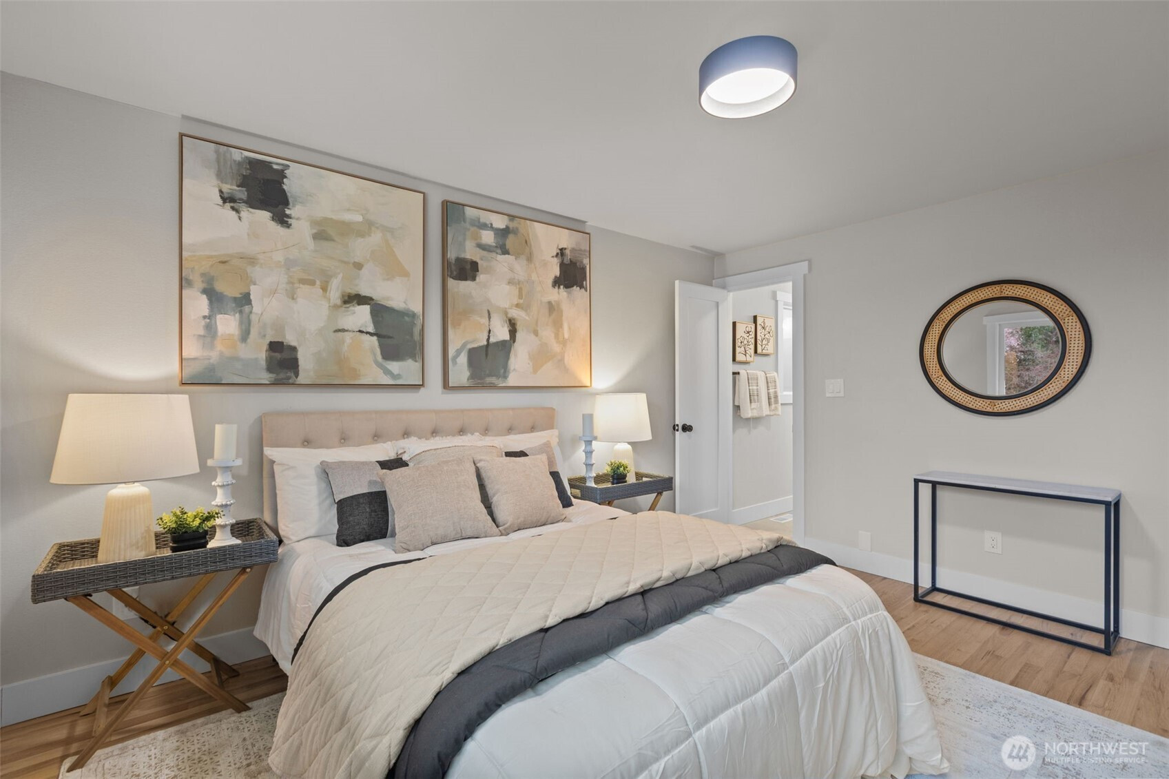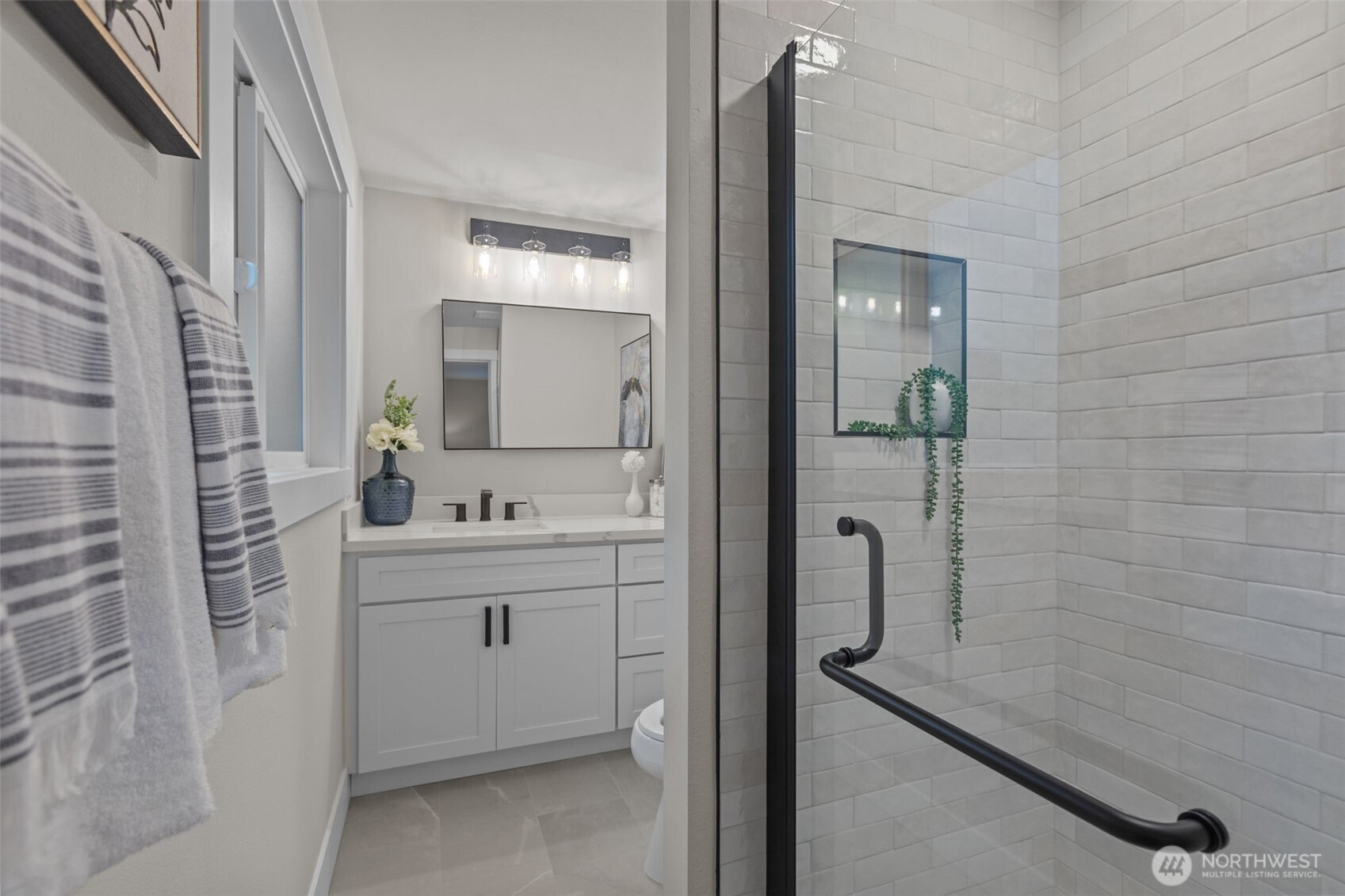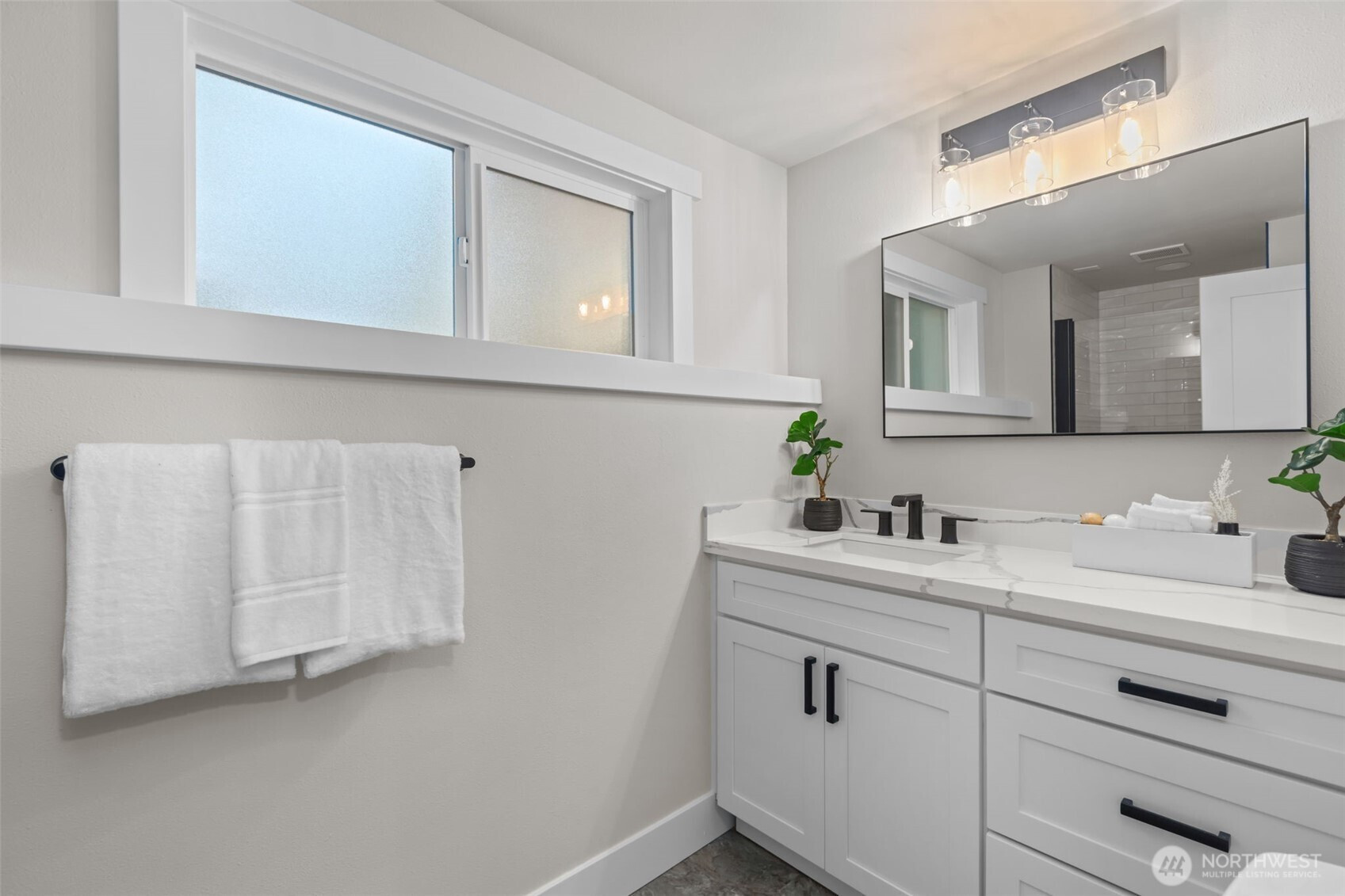 Tri-Level Living Done Right. Beautifully refreshed Northwest Contemporary offering partial Cascade Mountain views and a layout that truly lives well. The heart of the home is the light-filled main living level, where vaulted ceilings and expansive windows capture glimpses of the Cascades. The stone fireplace anchors the living room, creating warmth and architectural character. The fully remodeled kitchen features quartz countertops, new cabinetry, new LG stainless steel appliances, and a generous center island with seating-seamlessly connecting to the dining area with easy access to the deck for effortless indoor-outdoor entertaining. Upstairs, three bedrooms provide privacy and comfort, including a peaceful primary suite with updated 3/4 bath and modern finishes. The additional bedrooms enjoy partial mountain and territorial views and share a remodeled full bath with quartz surfaces and subway tile surround. On the main level, a spacious family room with sliding door access to the private side patio offers flexible living space-ideal for movie nights, guests, hobbies, or multi-generational living. A fourth bedroom & remodeled 3/4 bath complete this level, adding versatility and convenience. Fresh exterior paint, new windows, professional landscaping, and thoughtful updates throughout make this home truly move-in ready-all in a desirable East Bellevue location close to parks, schools, and commuter routes.