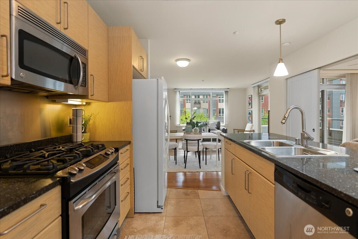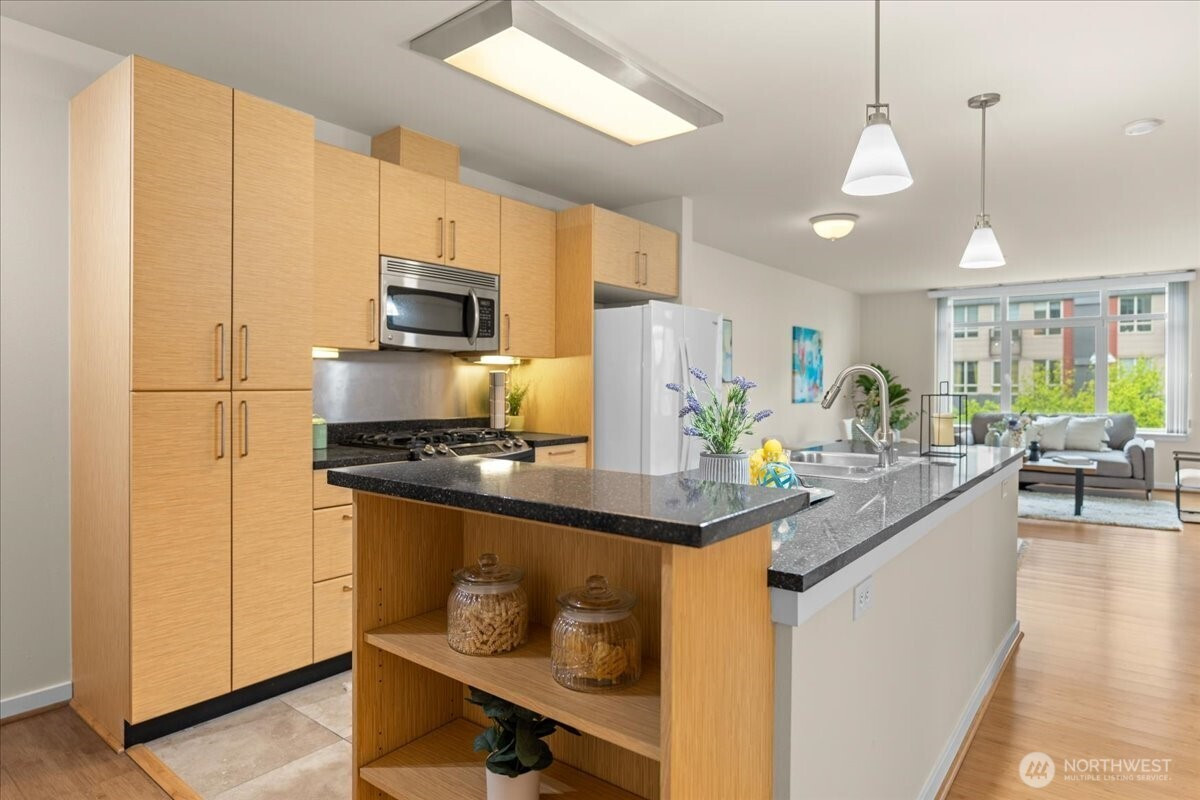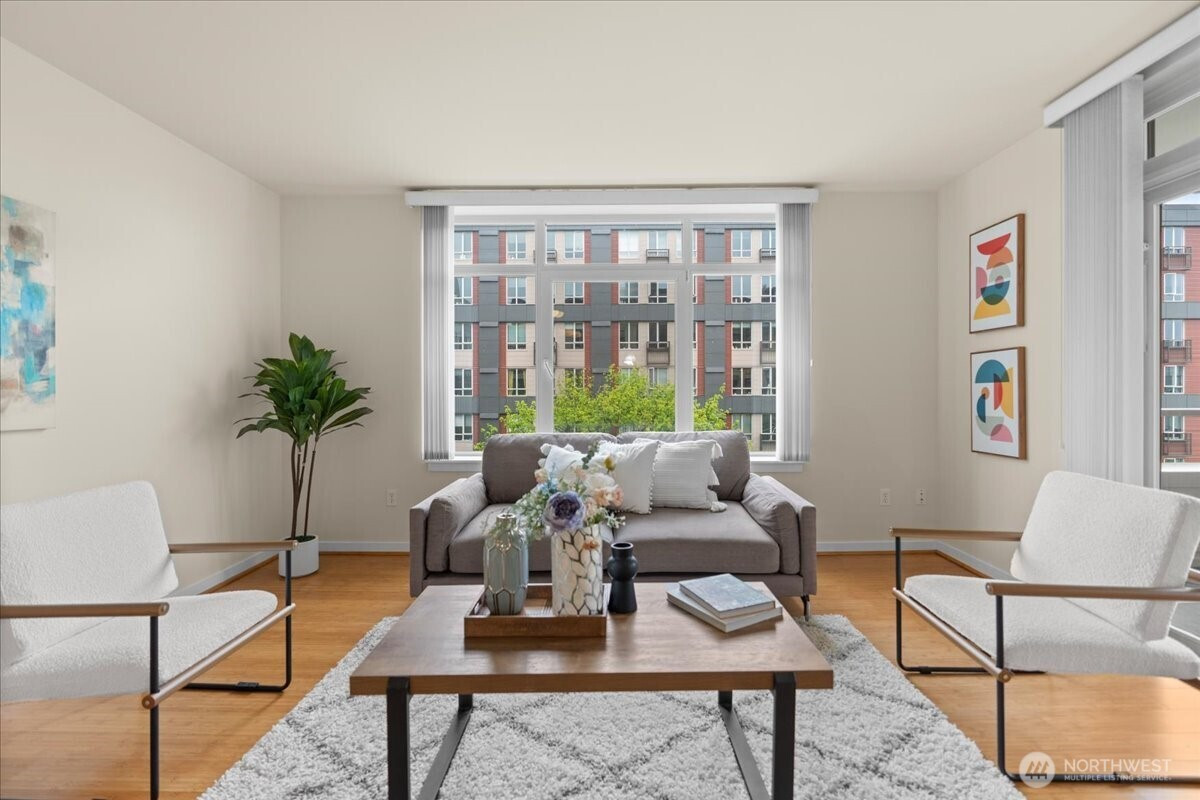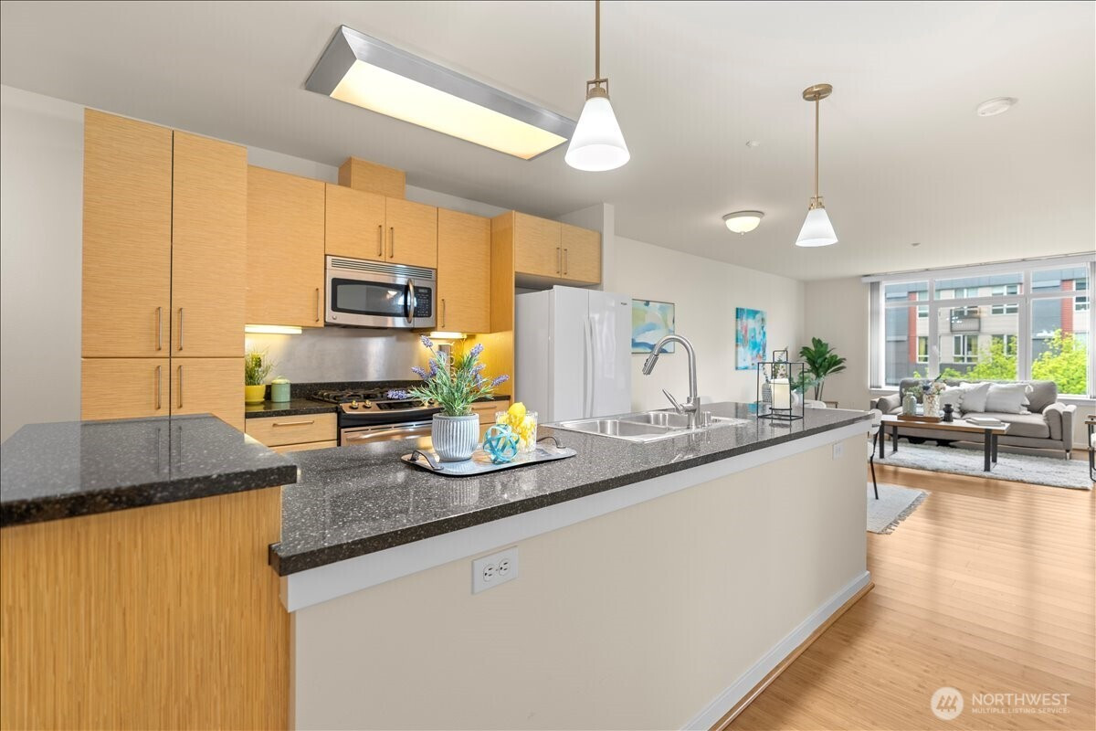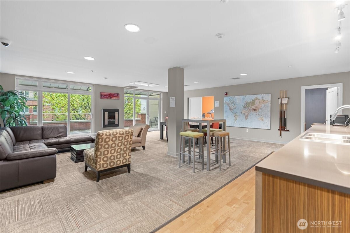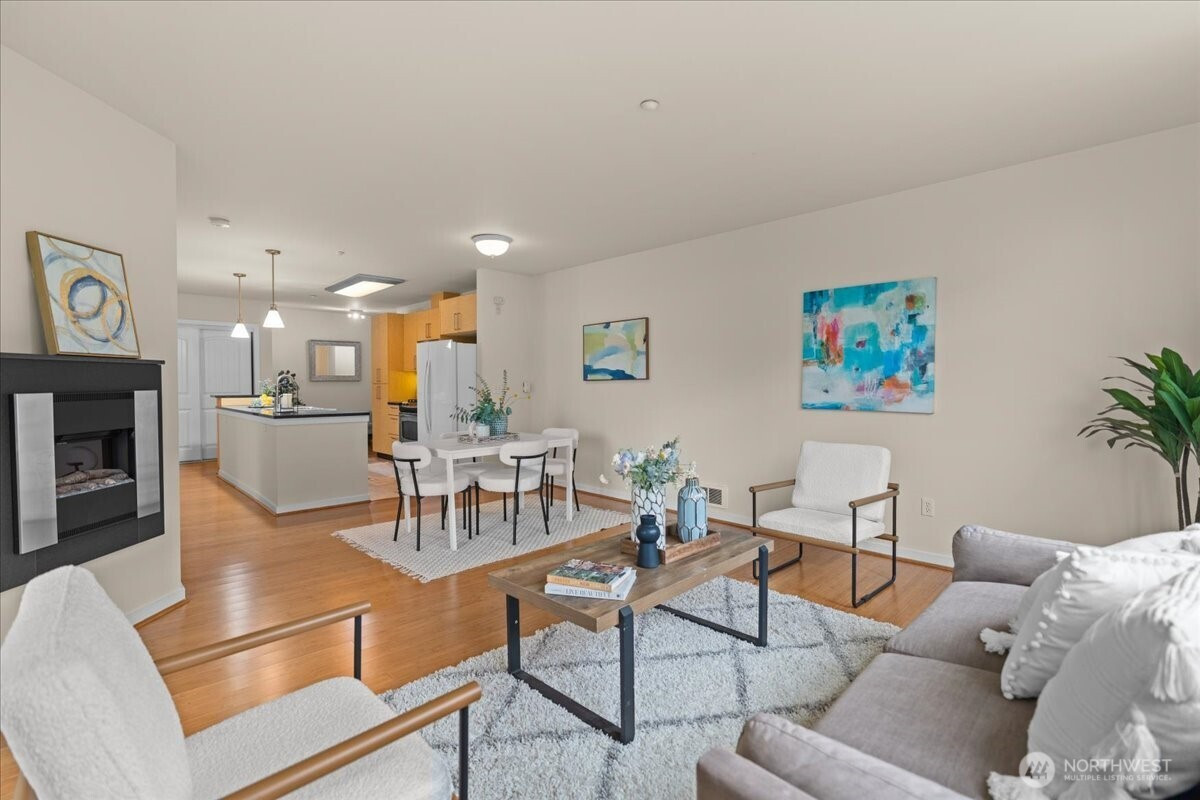 Experience elevated urban living in this light-filled 5th-floor residence at Hjärta—Ballard’s only LEED Silver certified condominium. Built with concrete and steel construction, this spacious 789 sq. ft. home offers exceptional durability, superior sound insulation, and energy efficiency rarely found in traditional wood-frame buildings. The southwest-facing layout fills the home with natural light and features an expansive living area, ideal open concept floor plan with bamboo flooring, cozy fireplace, in-unit washer/dryer, and sliding glass doors on to covered private deck for year round enjoyment. The thoughtfully designed kitchen includes granite countertops, stainless steel appliances, gas range, pantry, and tile finishes, while bathroom is accented with quartz surfaces and modern tile. Hjärta offers outstanding amenities, including a rooftop deck with P-Patch garden and BBQ, an owner’s lounge with pool table, and a fitness center—all designed to enhance everyday living. Built with green materials, low-VOC finishes, and a focus on healthier indoor air quality. Ideally located in the heart of vibrant Ballard, you’re just steps from top dining, shopping, and entertainment. Pet-friendly and investor-friendly with NO rental cap, this home offers exceptional flexibility as a primary residence or investment. HOA dues include water, sewer, gas, and earthquake insurance, providing strong value and peace of mind. Walk Score 97 - Assigned Secured Covered Parking. Welcome Home!