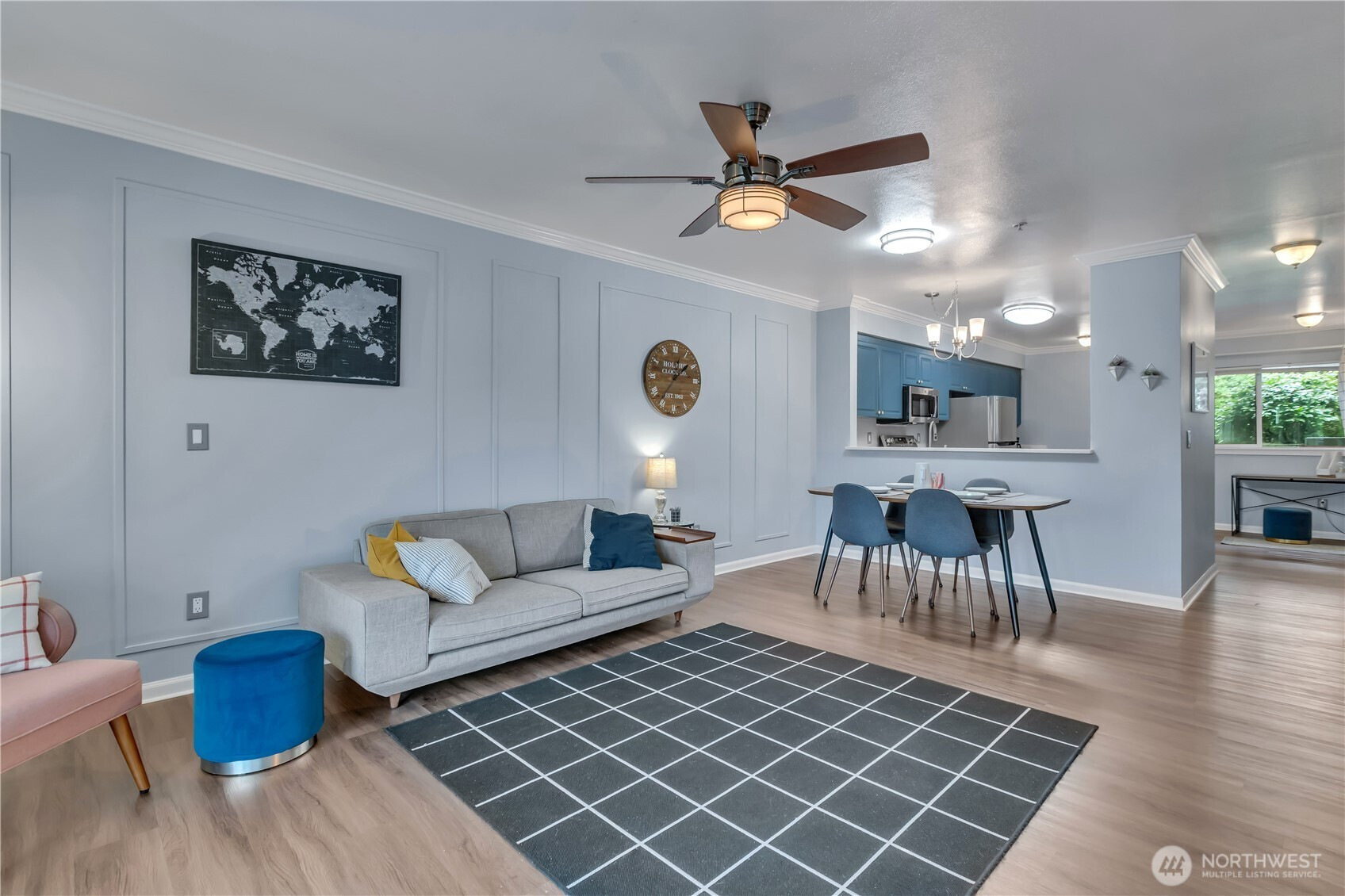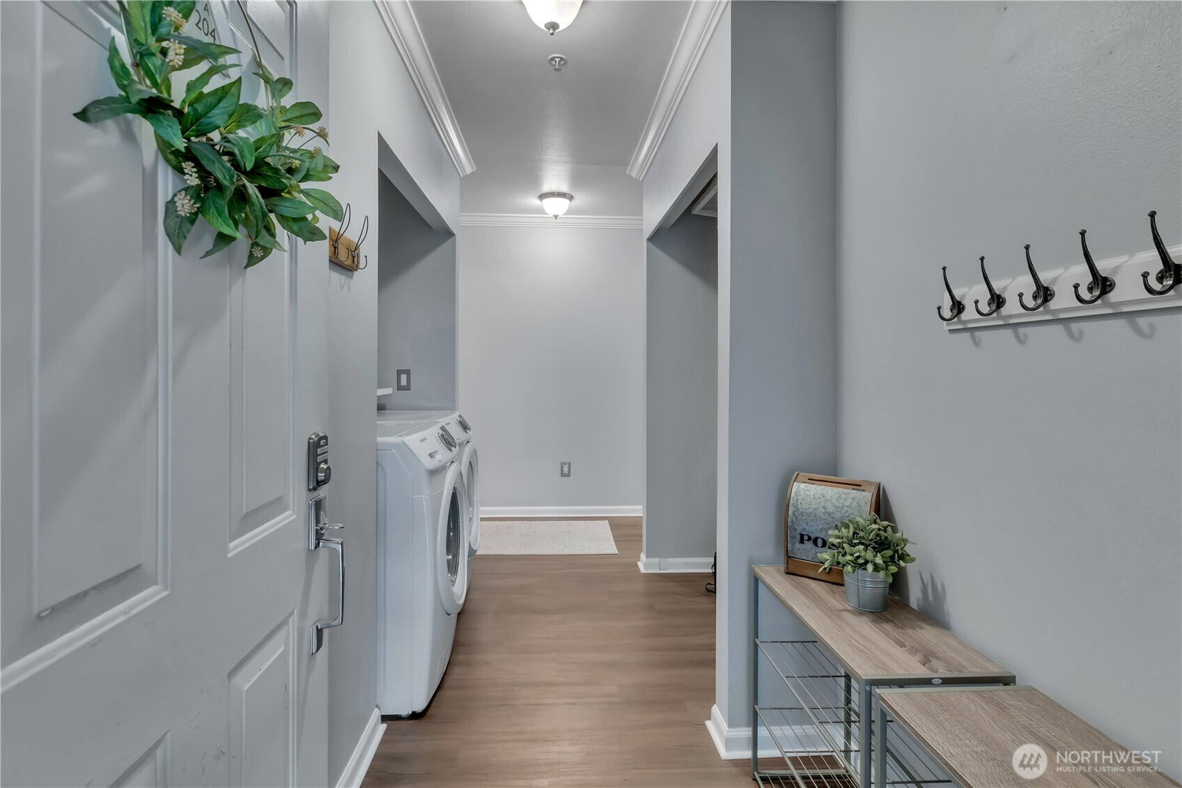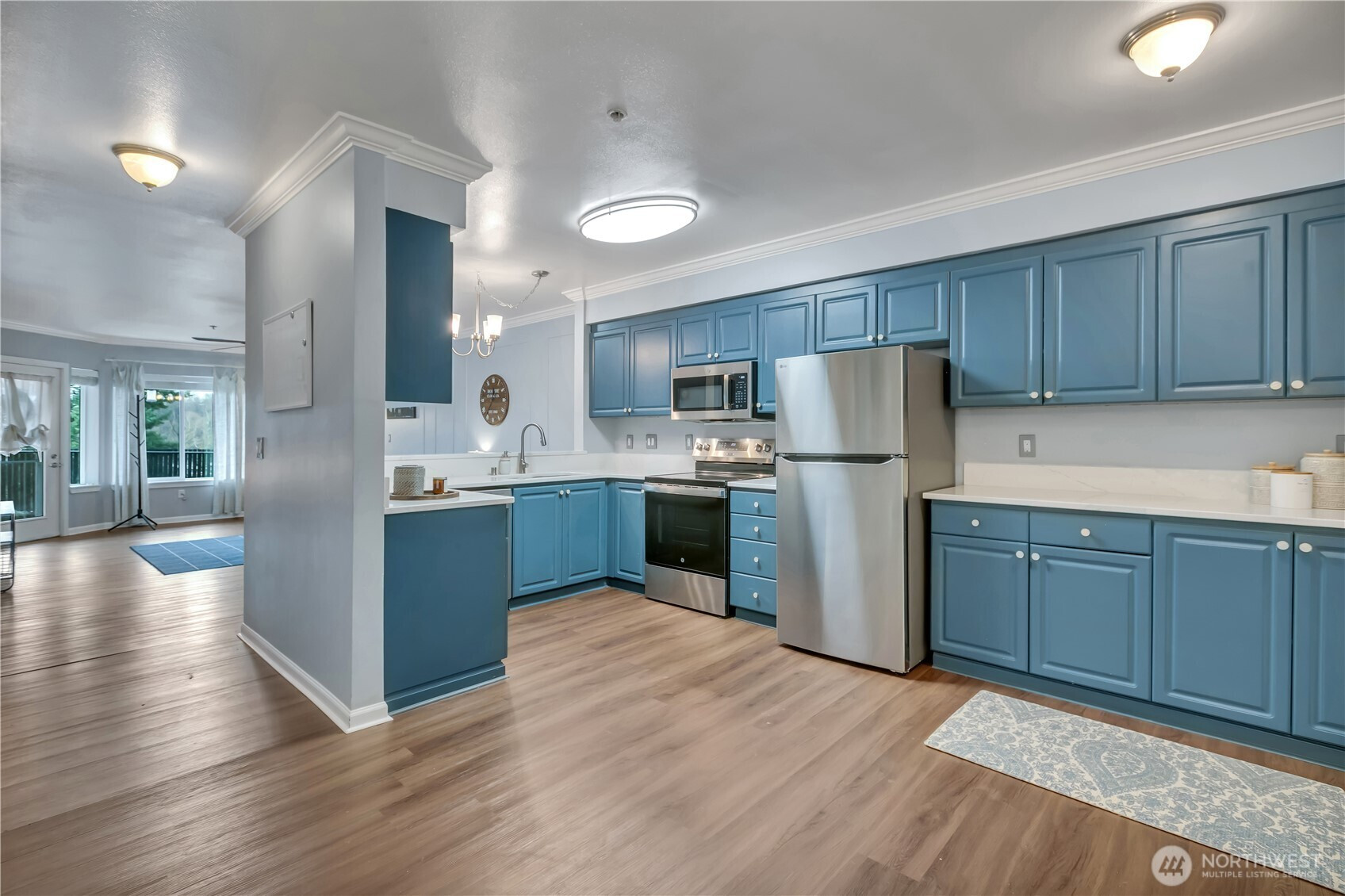 Welcome to The Peaks! This pre-inspected first-floor end unit condo features an open, light-filled layout with beautiful laminate flooring, crown molding, and a clean, modern feel throughout. The spacious kitchen offers quartz countertops, newer stainless steel appliances, ample cabinetry, a high-top breakfast bar, and space for a dining table. The kitchen opens to a large living area with direct access to your fenced, covered patio with private garden/green space. The primary suite is generously sized with multiple closets, a double-sink vanity and ¾ en suite bath, and its own access to the patio. A second bedroom and full guest bathroom offer flexibility for guests or a home office. Additional highlights include secure building entry, two covered parking spaces in the common garage, in-unit full-size washer and dryer, and low HOA dues covering water, sewer, garbage, and yard maintenance. No rental cap and a prime commuter location with easy access to Seattle, Bellevue, SeaTac Airport, and nearby shopping and dining.