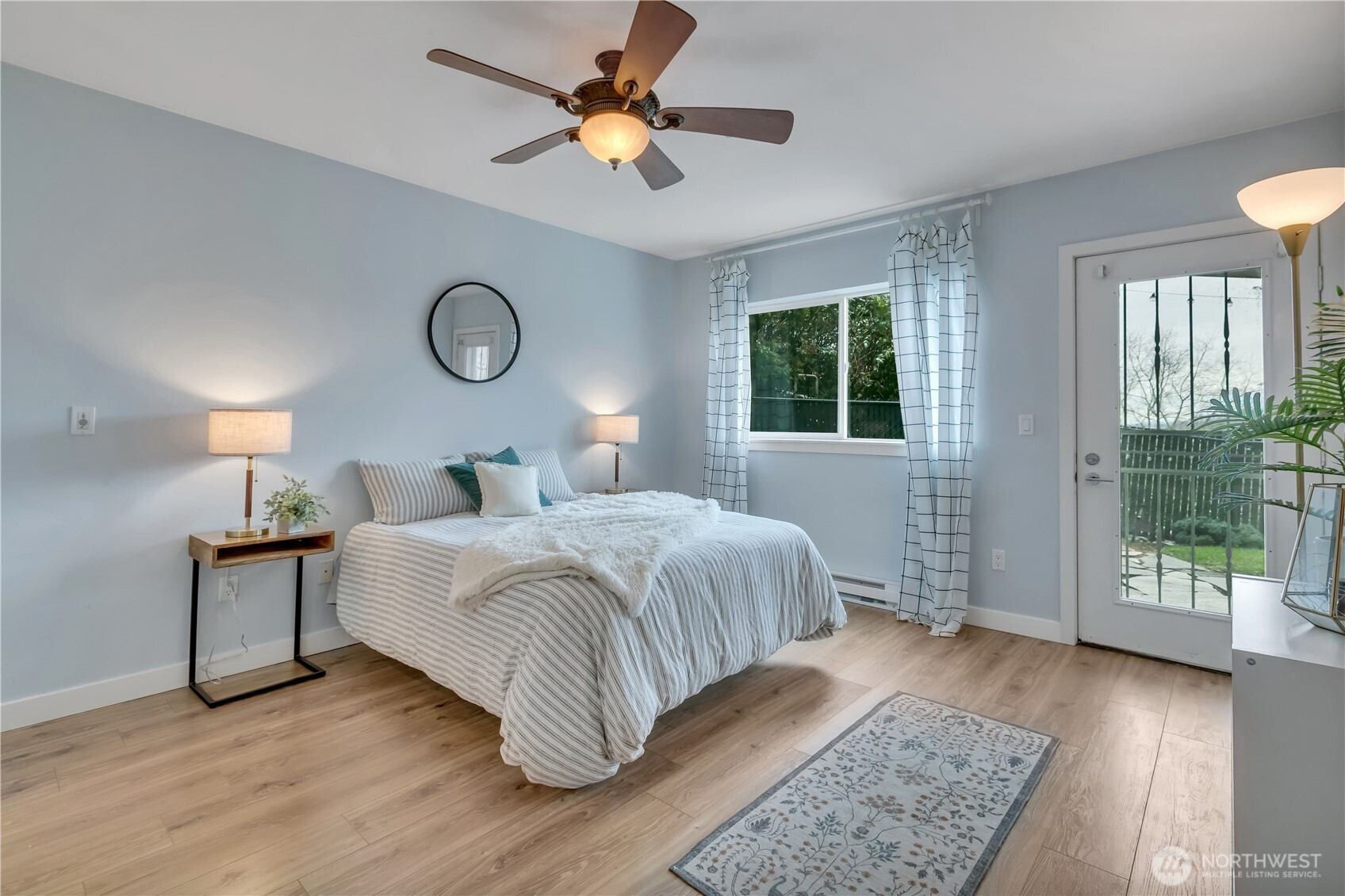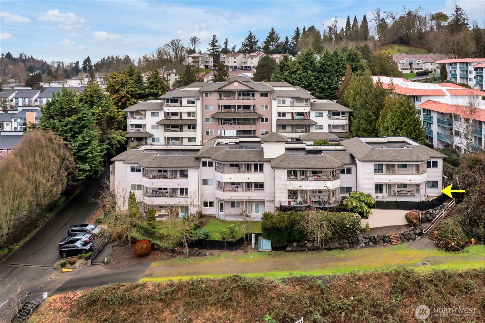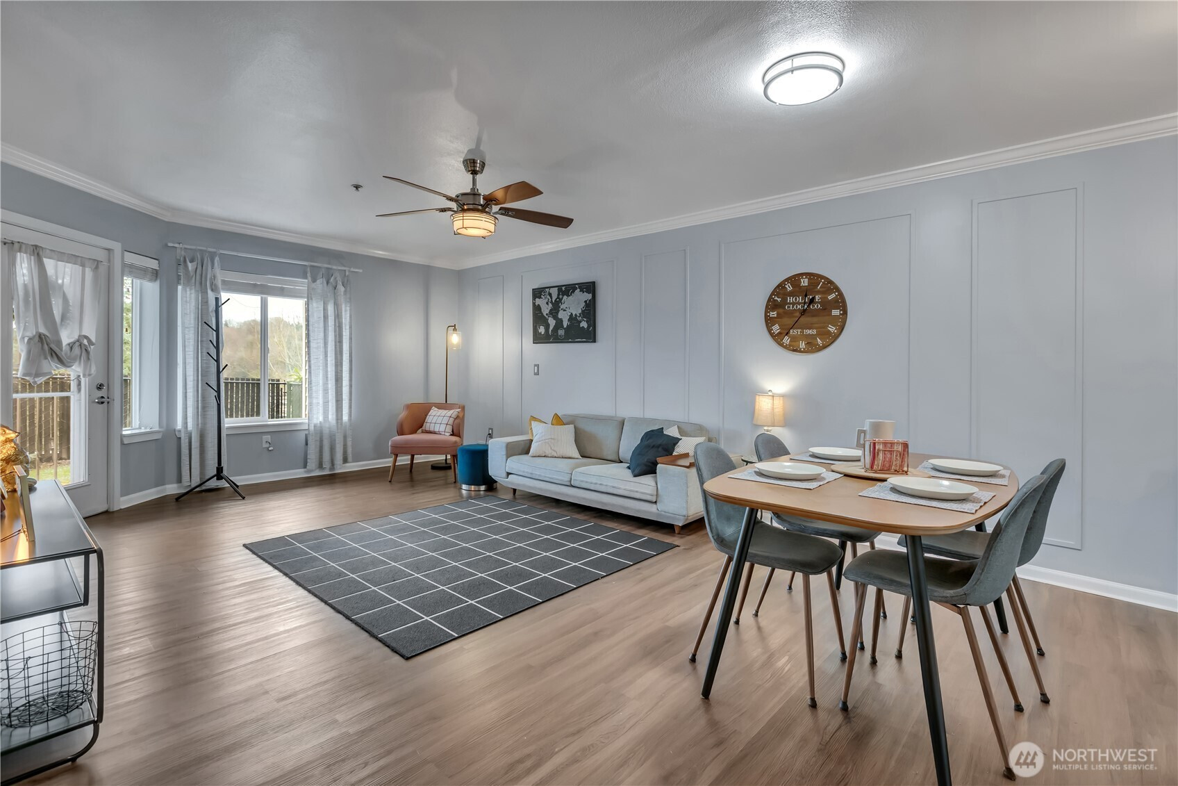 Welcome to The Peaks! This pre-inspected first-floor end unit condo features an open, light-filled layout with beautiful laminate flooring, crown molding, and a clean, modern feel throughout. The spacious kitchen offers quartz countertops, newer stainless steel appliances, ample cabinetry, a high-top breakfast bar, and space for a dining table. The kitchen opens to a large living area with direct access to your fenced, covered patio with private garden/green space. The primary suite is generously sized with multiple closets, a double-sink vanity and ¾ en suite bath, and its own access to the patio. A second bedroom and full guest bathroom offer flexibility for guests or a home office. Additional highlights include secure building entry, two covered parking spaces in the common garage, in-unit full-size washer and dryer, and low HOA dues covering water, sewer, garbage, and yard maintenance. No rental cap and a prime commuter location with easy access to Seattle, Bellevue, SeaTac Airport, and nearby shopping and dining.