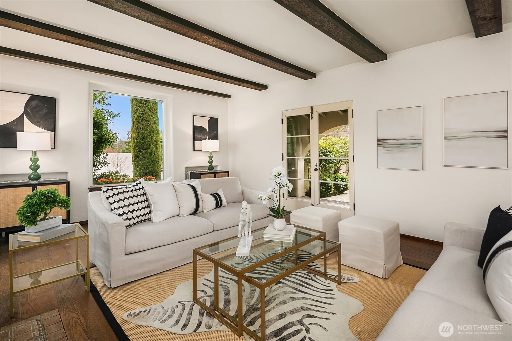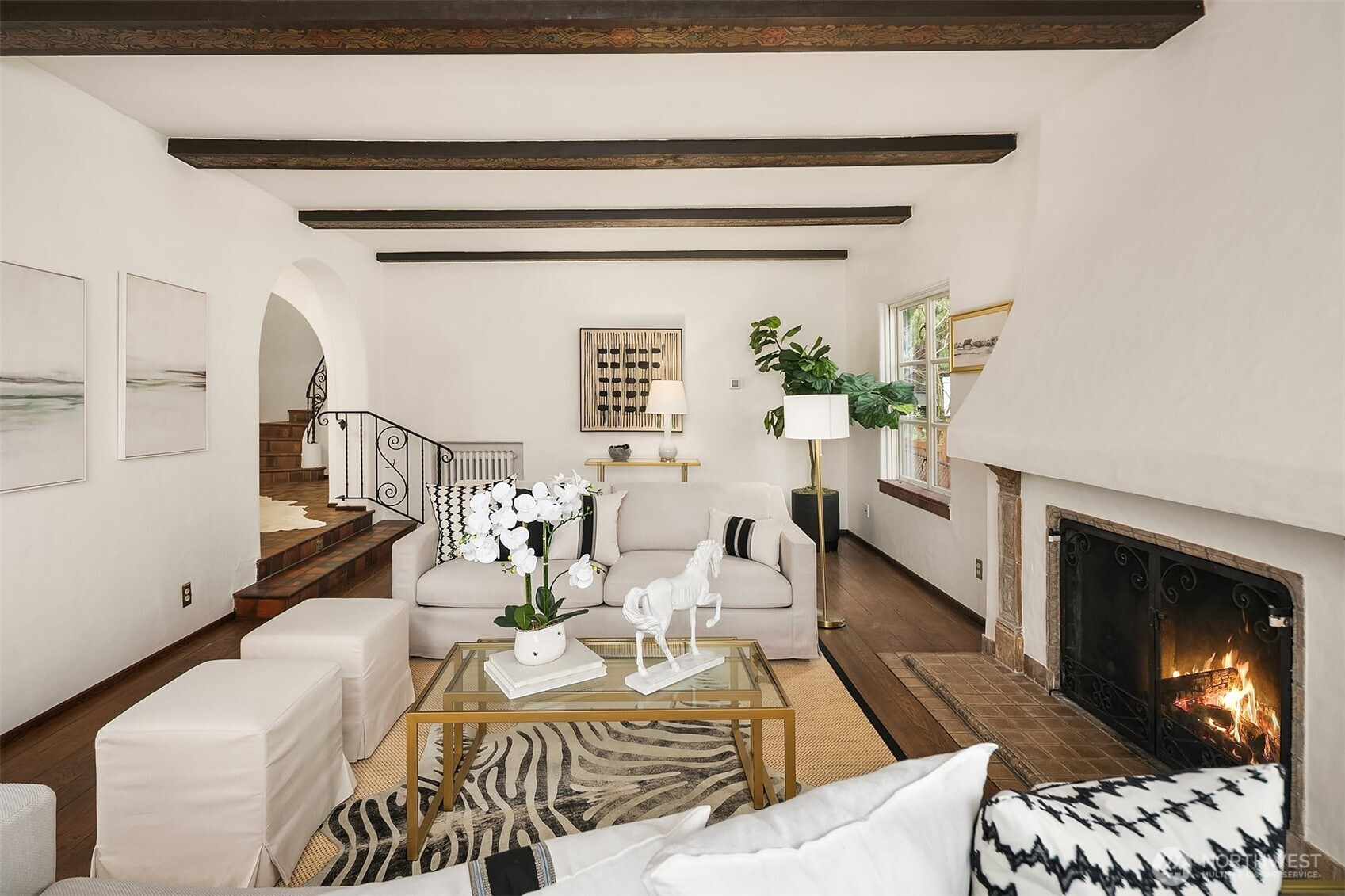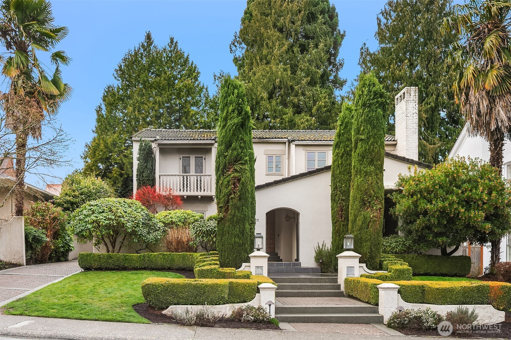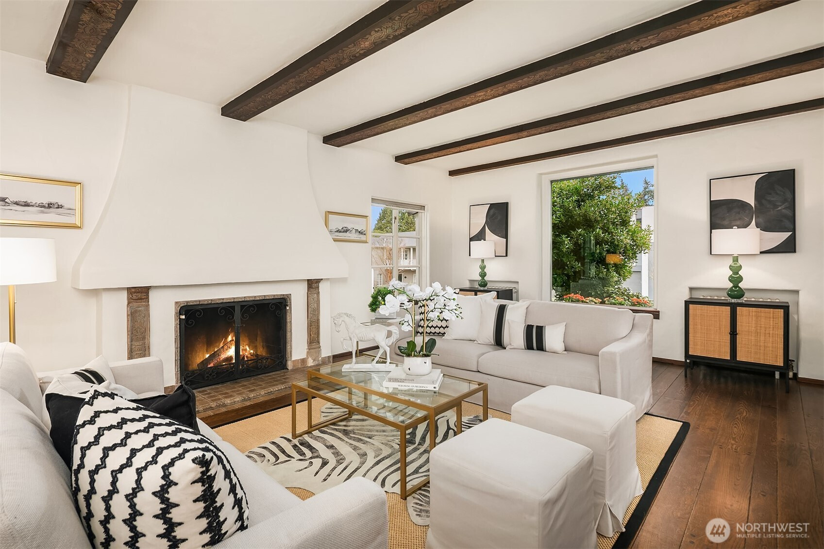 Refined elegance meets timeless architecture in this exceptional Broadmoor residence. Framed by manicured hedges and stately evergreens, the striking façade and gracious entry set the tone for the sophisticated interiors within. Inside, sunlit living spaces blend classic charm with modern comfort. The inviting living room features rich hardwood floors, dramatic exposed beams, and a beautiful fireplace that anchors the space—perfect for cozy evenings or effortless entertaining. Large picture windows bring in natural light and serene garden views, creating a warm and welcoming atmosphere throughout. Designed for both everyday living and hosting, the home offers 4 spacious bedrooms and 3.5 baths, including a thoughtfully finished lower level with a generous rec room—ideal for movie nights, game days, or a private guest retreat. Step outside to enjoy beautifully landscaped grounds and multiple outdoor living areas, perfect for gathering with friends or relaxing in privacy. A detached 2-car garage provides convenience and additional storage. Located in the heart of Broadmoor, this home offers a rare opportunity to enjoy refined living in one of Seattle’s most coveted neighborhoods.