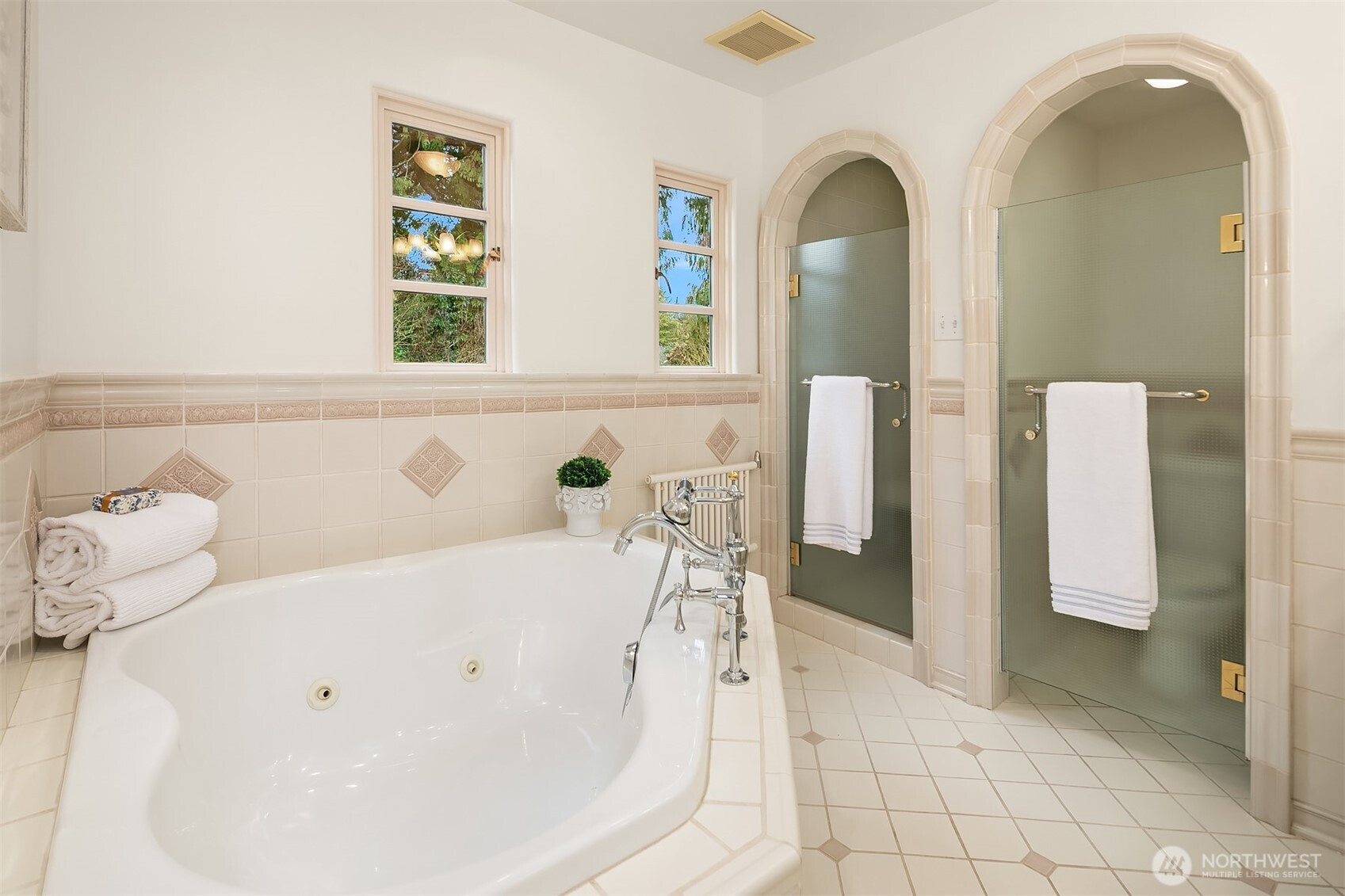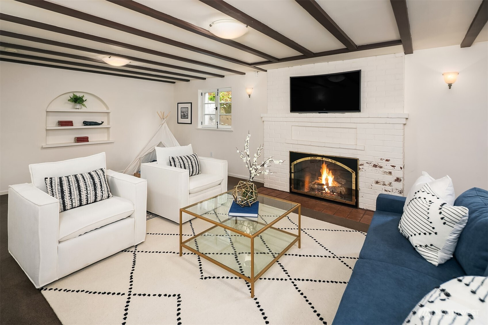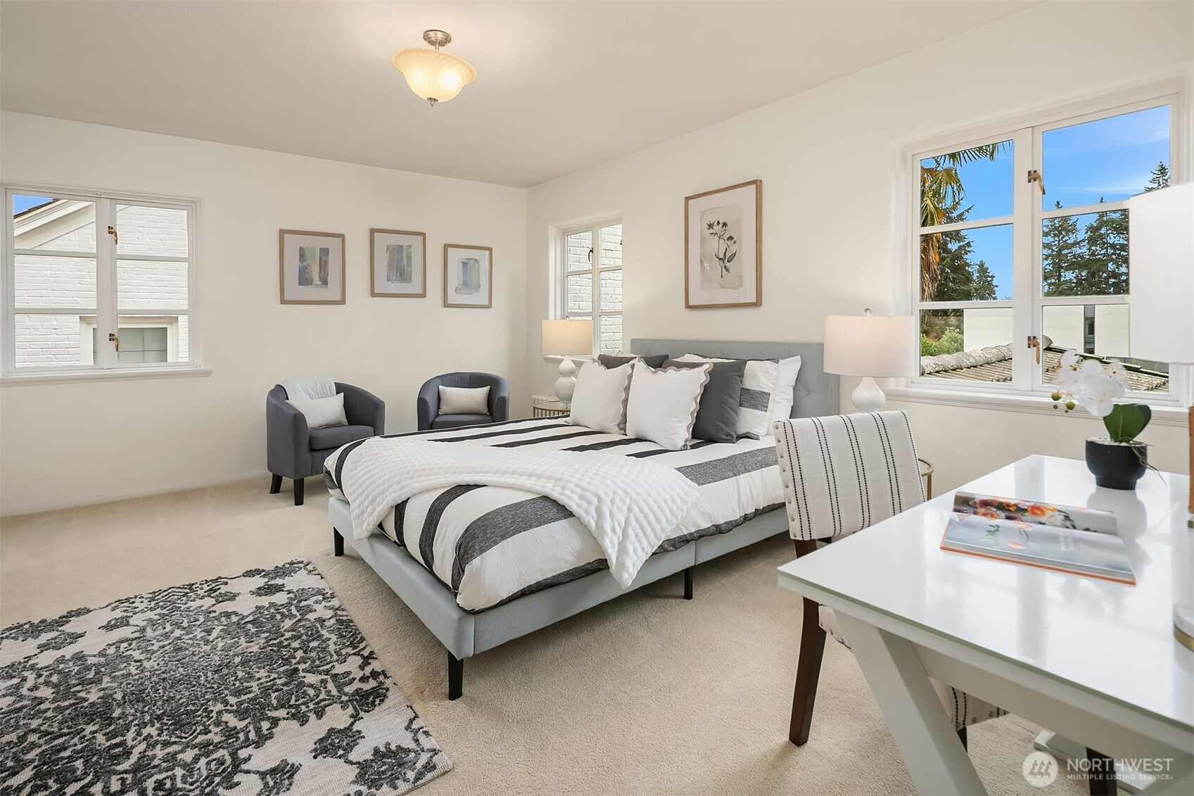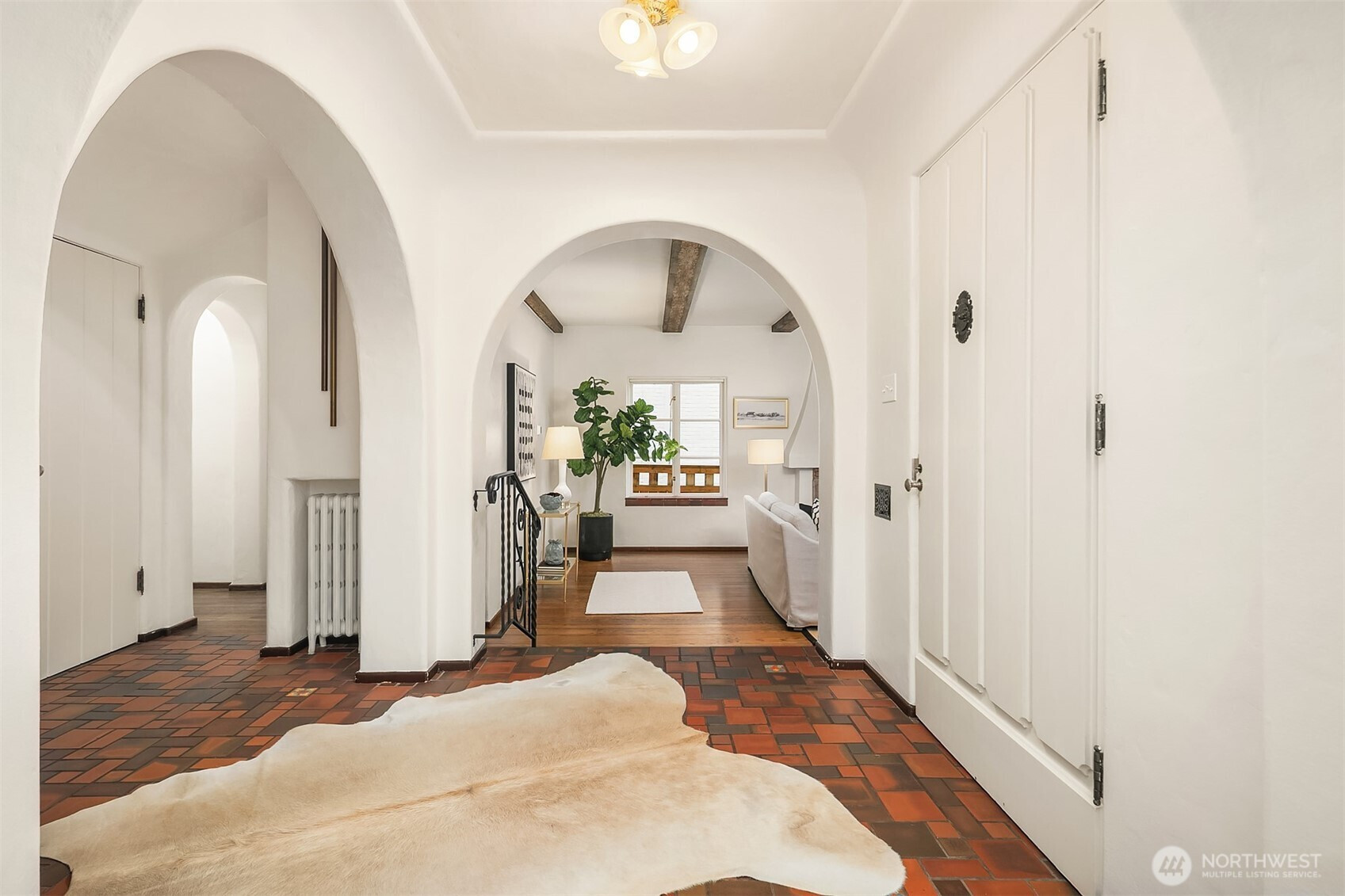 Refined elegance meets timeless architecture in this exceptional Broadmoor residence. Framed by manicured hedges and stately evergreens, the striking façade and gracious entry set the tone for the sophisticated interiors within. Inside, sunlit living spaces blend classic charm with modern comfort. The inviting living room features rich hardwood floors, dramatic exposed beams, and a beautiful fireplace that anchors the space—perfect for cozy evenings or effortless entertaining. Large picture windows bring in natural light and serene garden views, creating a warm and welcoming atmosphere throughout. Designed for both everyday living and hosting, the home offers 4 spacious bedrooms and 3.5 baths, including a thoughtfully finished lower level with a generous rec room—ideal for movie nights, game days, or a private guest retreat. Step outside to enjoy beautifully landscaped grounds and multiple outdoor living areas, perfect for gathering with friends or relaxing in privacy. A detached 2-car garage provides convenience and additional storage. Located in the heart of Broadmoor, this home offers a rare opportunity to enjoy refined living in one of Seattle’s most coveted neighborhoods.