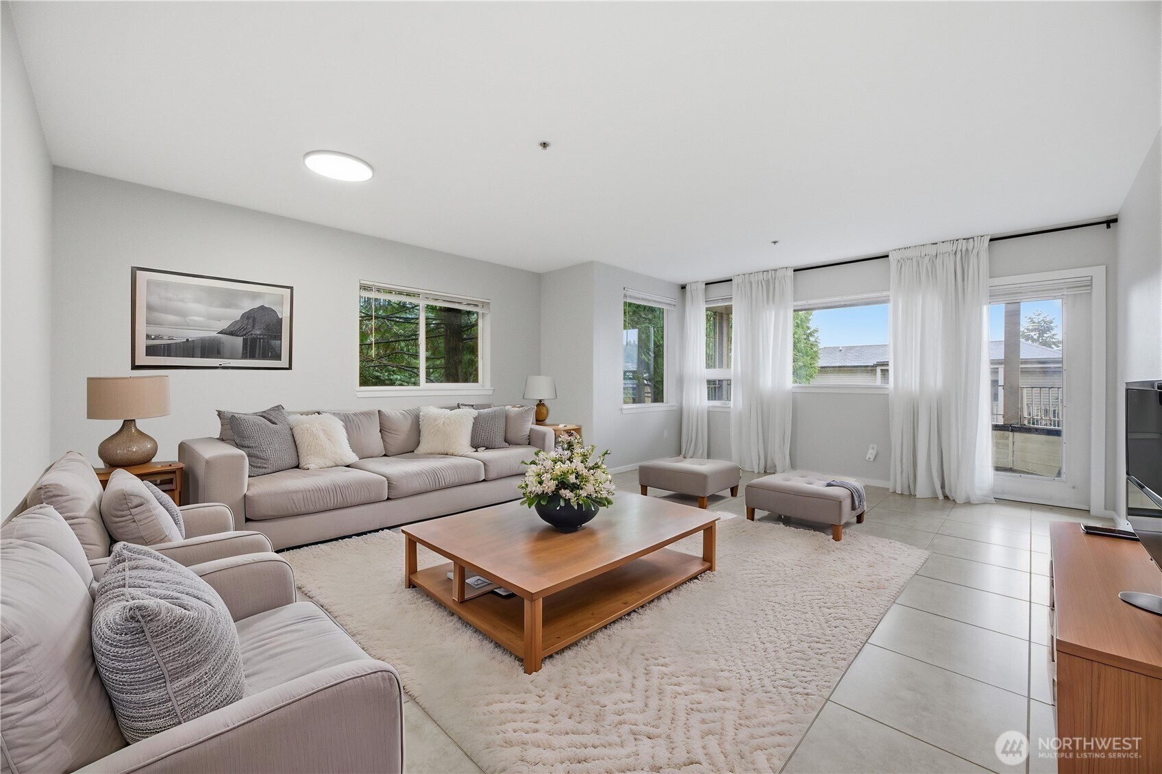 Commuter’s dream! Welcome to this light-filled 2-bedroom, 1.75-bath condo. Move-in ready with a fresh coat of paint. The kitchen shines as the heart of the home with stainless steel appliances, granite countertops, a high-top breakfast bar, and bright light-tone cabinetry. Just off the kitchen, a convenient full bath. A spacious living area showcases durable tile flooring and large windows which let in an abundance of natural light to the home. Through the living room you will find access to the to a private patio which is perfect for relaxing and enjoying outdoor space. The primary suite includes an en-suite 3/4 bath with dual vanity and large step-in shower. Positioned at the front of the home, the second bedroom is thoughtfully separated for added privacy. The desirable corner unit has only two neighboring units—one to the right and one above—with a secured storage room located directly below. The in-unit washer and dryer provide everyday convenience. Enjoy peace of mind with two covered, secured parking spots and lobby entry. This location offers easy access to three main freeways, SeaTac Airport, and nearby shopping and dining at the Southcenter Mall.