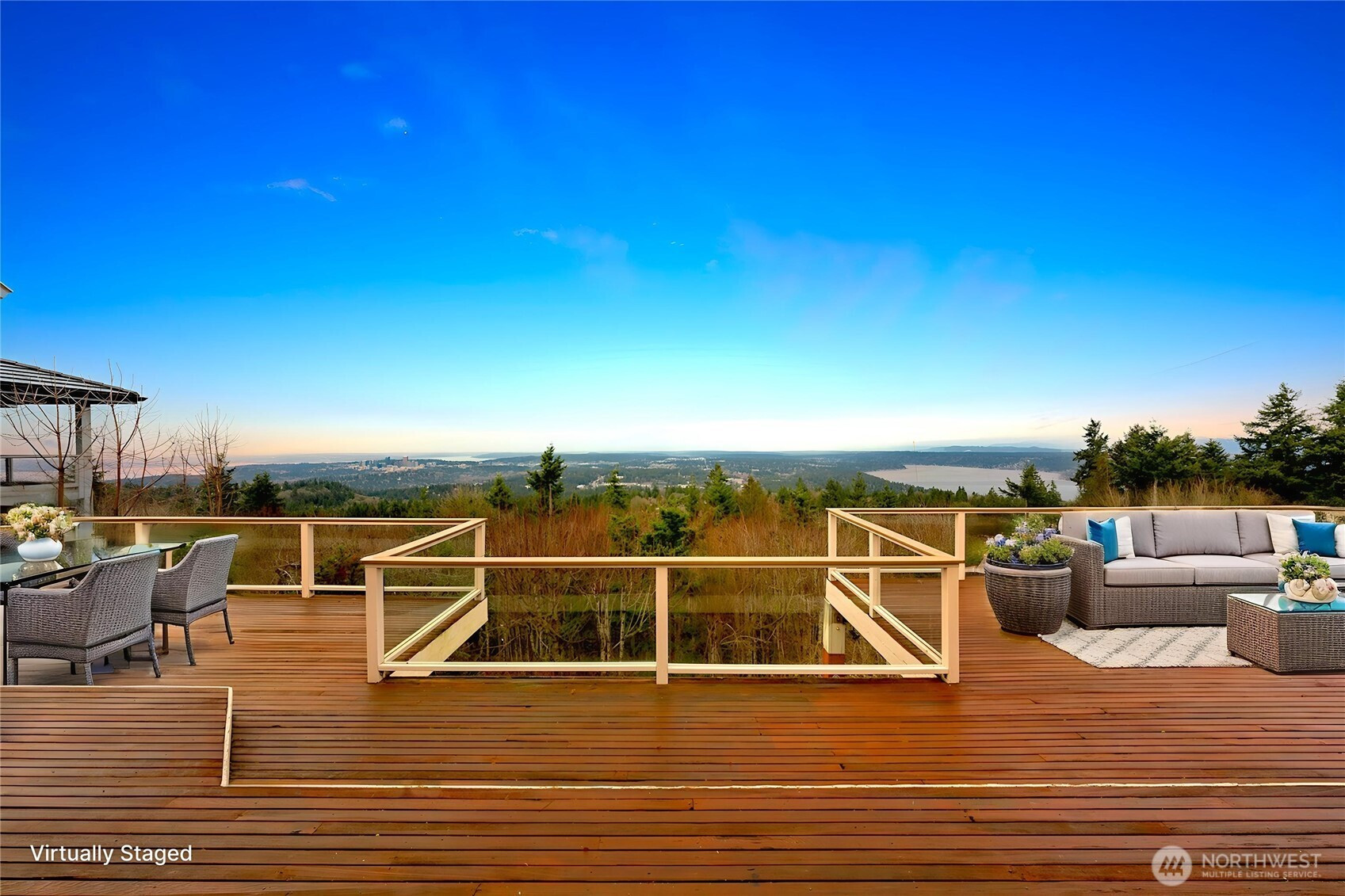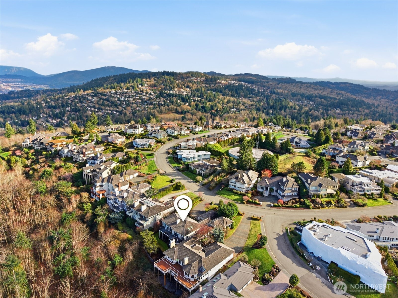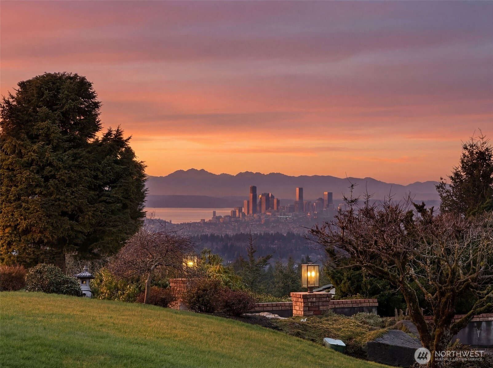 Commanding one of The Summit’s most spectacular outlooks, this custom Chaffey-built residence spans over 1/2 acre backed by greenspace - over 180° views from the Seattle skyline, Lake Washington to the Bellevue skyline, Lake Sammamish, Mt. Baker, the Cascades and the Olympics. Fireworks, luminous sunsets and ever-changing skies become part of daily life, with Mt. Rainier greeting you coming and going. A courtyard entry with fountain and mature Japanese maples sets a serene, estate-like tone. Inside, walls of windows and French doors open to a full-width view deck for effortless indoor-outdoor living. Formal living and dining rooms flow to a cozy family room with fireplace and custom built-ins with leaded-glass accents. A heated greenhouse, a ~400 SF private-wing office/media room, and the grand lower-level flex room with fireplace add exceptional versatility. The chef’s kitchen showcases extremely rare Madagascar Labradorite slab counters, Viking appliances, and a custom 60” Vent-A-Hood. An elegant wet bar—anchored by Sub-Zero—elevates every gathering. At the heart, find the compass rosette inlay of Brazilian heartwood in the hardwoods. The luxe primary suite with fireplace, five-piece bath, and walk-in closet, opens to the deck for fresh air and grand views. 3 gracious lower bedrooms with walk-in closets, exceptional storage, & 3-car garage complete the home. Enjoy 24/7 security, guardhouse entry, clubhouse, pool, tennis & pickleball, trails and prestigious Bellevue schools!