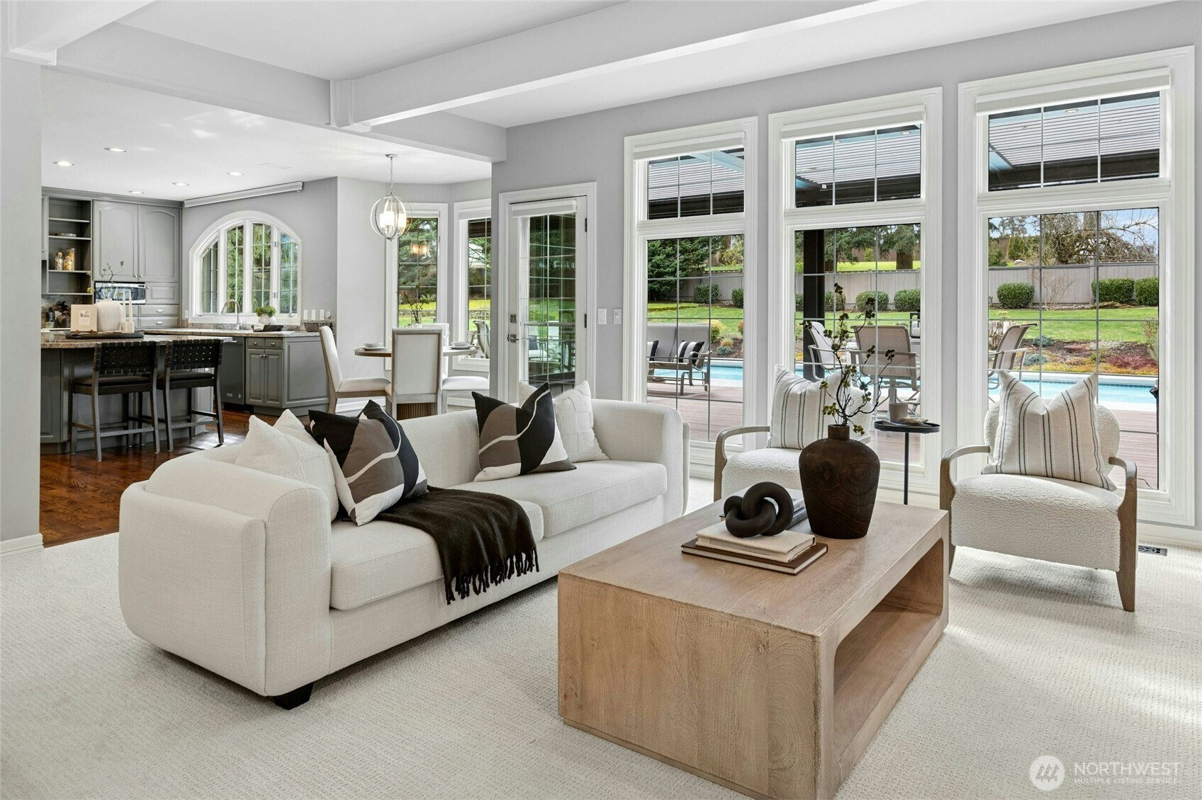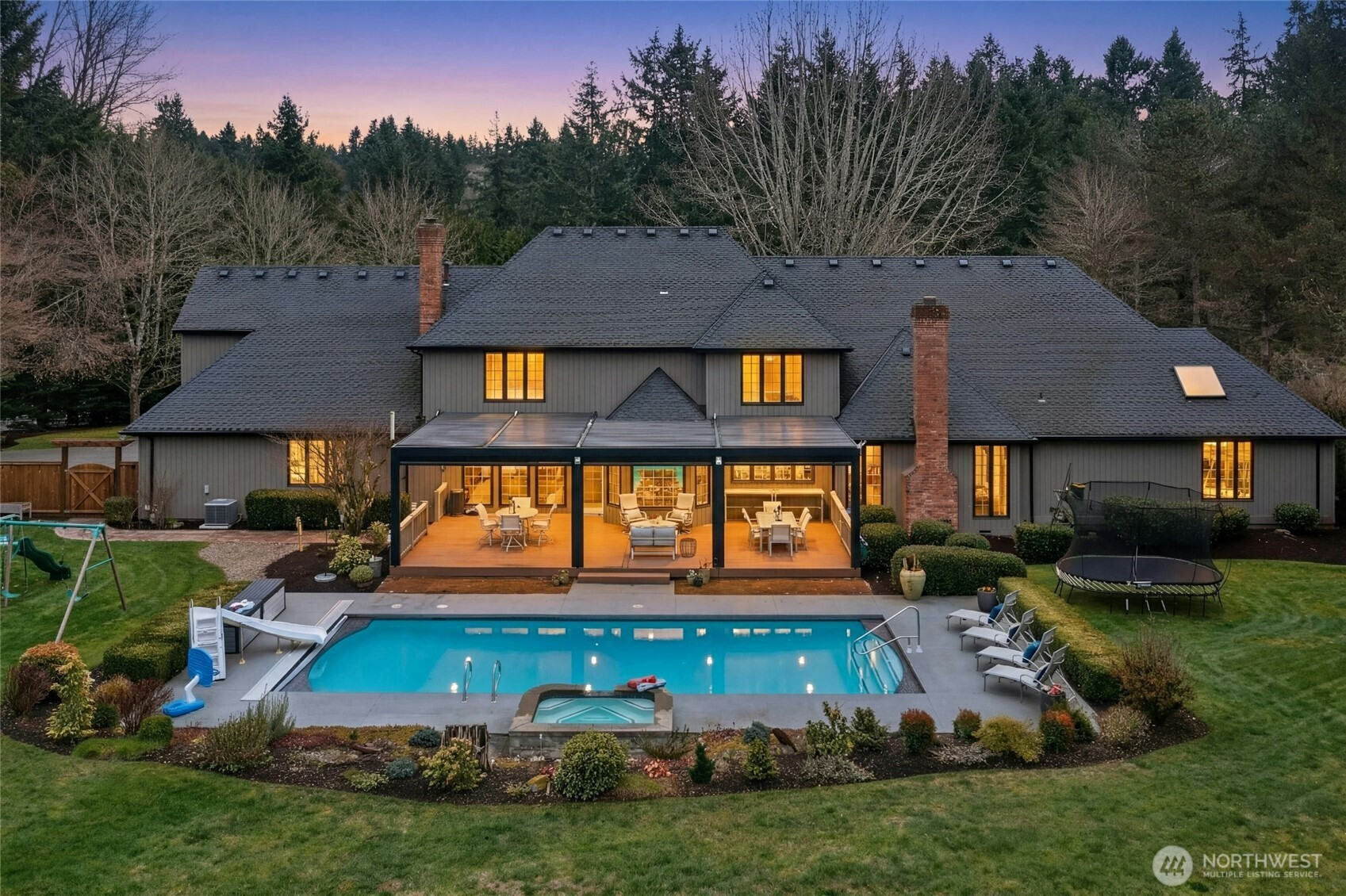 Country living. City style. A legacy property on Hollywood Hill, this impeccably upgraded, restored and meticulously maintained 5,311 sq ft estate sits stately on 2.0 private acres in the heart of Woodinville Wine Country. A grand, light-filled entrance welcomes you with sweeping views through expansive windows to the breathtaking backyard oasis, creating an unforgettable first impression. Entertain effortlessly with generous space for a statement dining table before flowing into the heart of the home—a chef’s kitchen anchored by a massive island designed to gather everyone together, plus an adjacent catering room with a second refrigerator for seamless events. The main-level primary en suite offers refined comfort and privacy, while upstairs features a junior en suite and two additional bedrooms sharing a dual-sink full bath. Step outside to your resort-caliber retreat with a PergolaX system for year-round enjoyment, expansive deck, pool with slide, hot tub, and lush fully fenced grounds. Two offices, two bonus rooms, 4-car garage, RV/boat parking, NO HOA. Easy Eastside commute and exceptional Northshore Schools. A rarely available Hollywood Hill offering.
