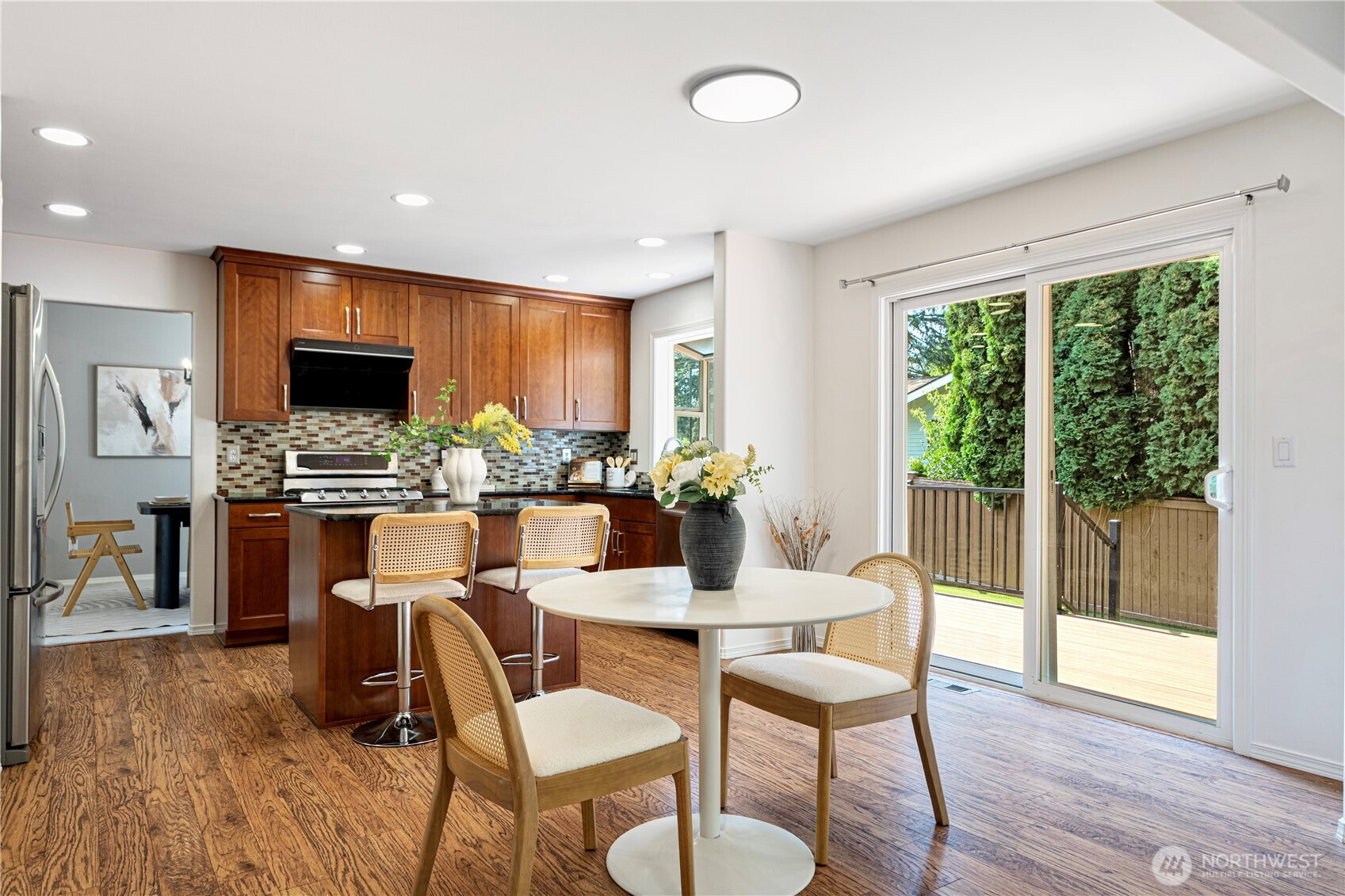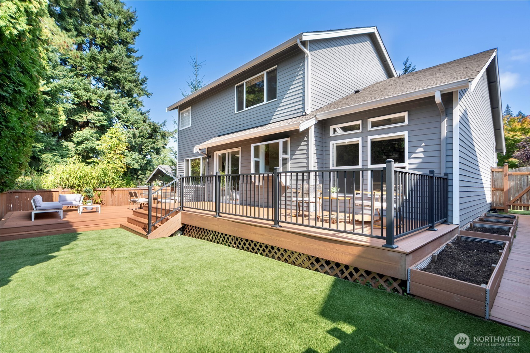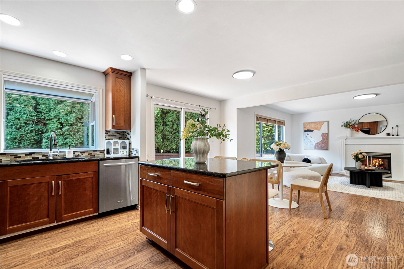 Welcome to this stunning Craftsman-style gem in sought-after Kenmore! The inviting entry showcases vaulted ceilings and abundant natural light. The living room with a cozy gas fireplace flows seamlessly to the dining area. Chef’s kitchen features wood cabinetry, granite countertops, and stainless steel appliances. A main-level bedroom and a bath with shower provide a perfect space for guests/ home office. Upstairs includes two additional bedrooms, a full hallway bath, and a generously sized primary suite with walk-in closet and spa-like bath. The fully fenced backyard offers a spacious patio, luxury turf, and garden beds upgraded in 2022. Nestled on a quiet cul-de-sac, close to parks, shopping, and Hwy 522—you don't want to miss this one!