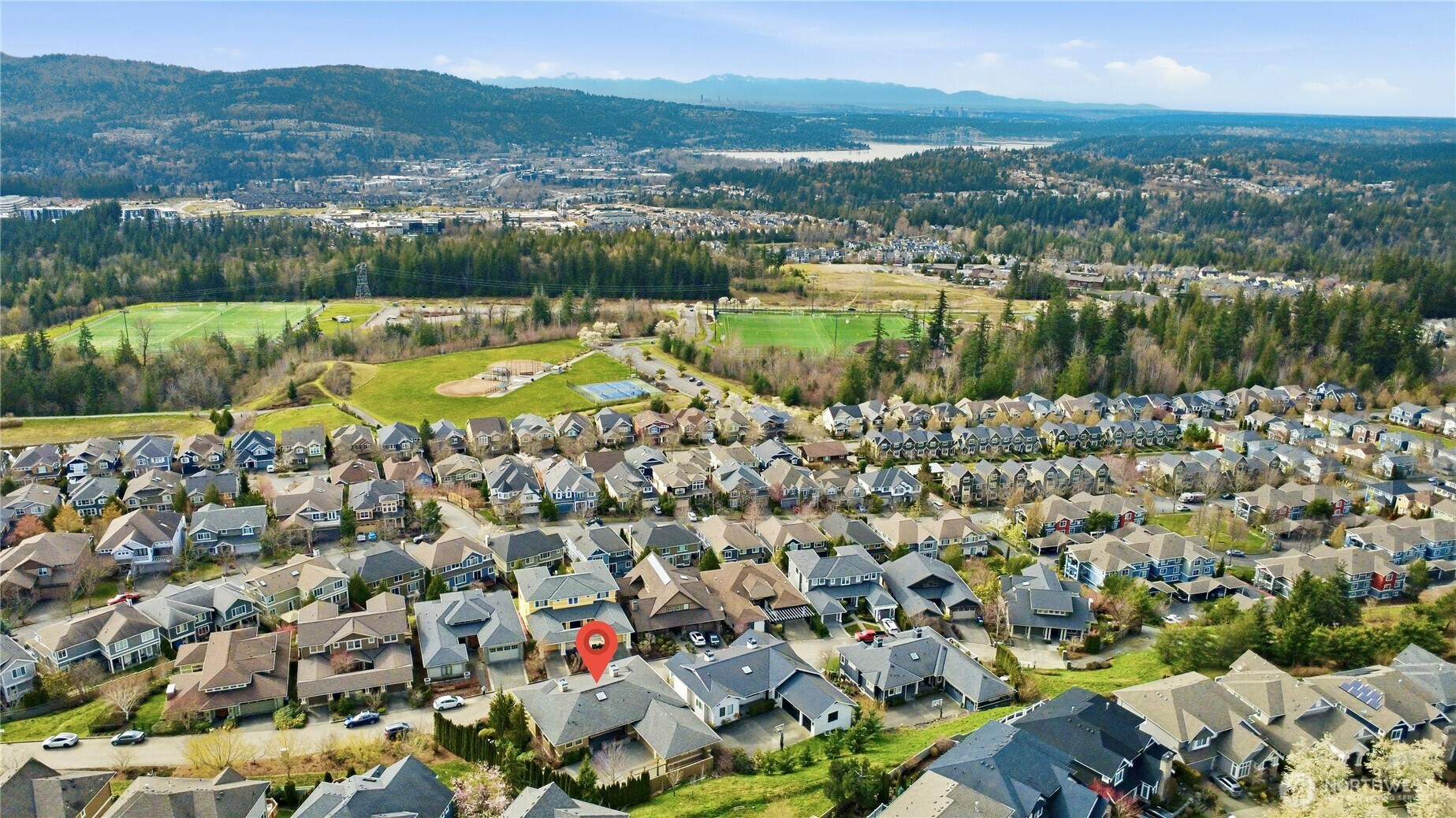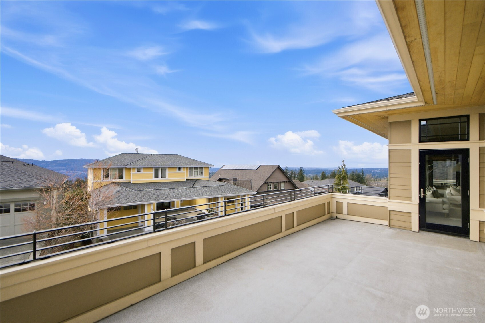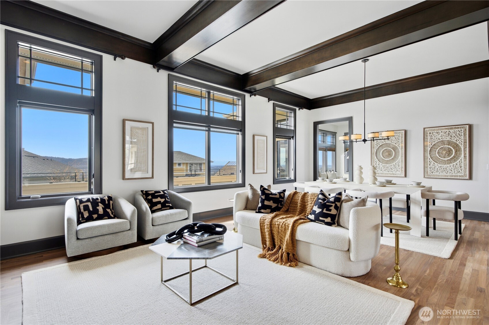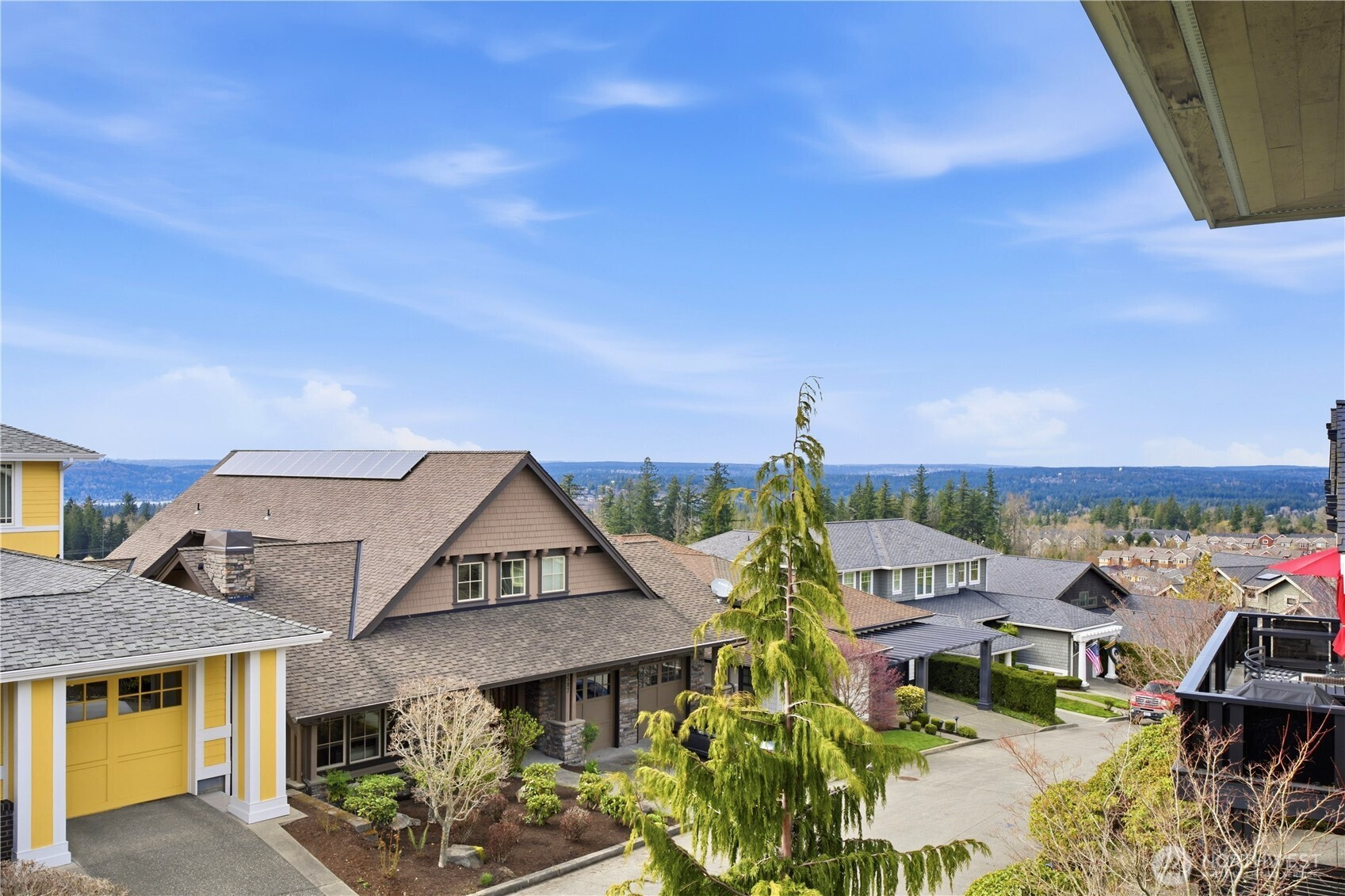 Exceptional Frank Lloyd Wright inspired home bordered by refined landscaping. Experience elevated living in this exquisite Issaquah Highlands retreat. Tucked away on a peaceful cul-de-sac, this home blends timeless elegance with modern sophistication, offering sweeping views and unmatched privacy. Soaring high ceilings, fabulous open-plan living room filled with natual lights extends to stunning view deck great for entertaining. Distinctive detailing & palette with Brazilian walnut hardwoods & contrasting charcoal gray millwork. New refinished flooring & new carpet. Gourmet kitchen: slab granite, Viking graphite gray appliances, walk-in pantry. Gorgeous primary suite w/sitting area & deck access. Lower level features 2 bedroom ensuites, spacious Bonus room/4th bedroom, wine cellar, office. Expansive driveway, 3-car garage, EV charger ready. Dog run w/turf. Nearby trails/parks. This is where luxury meets lifestyle.