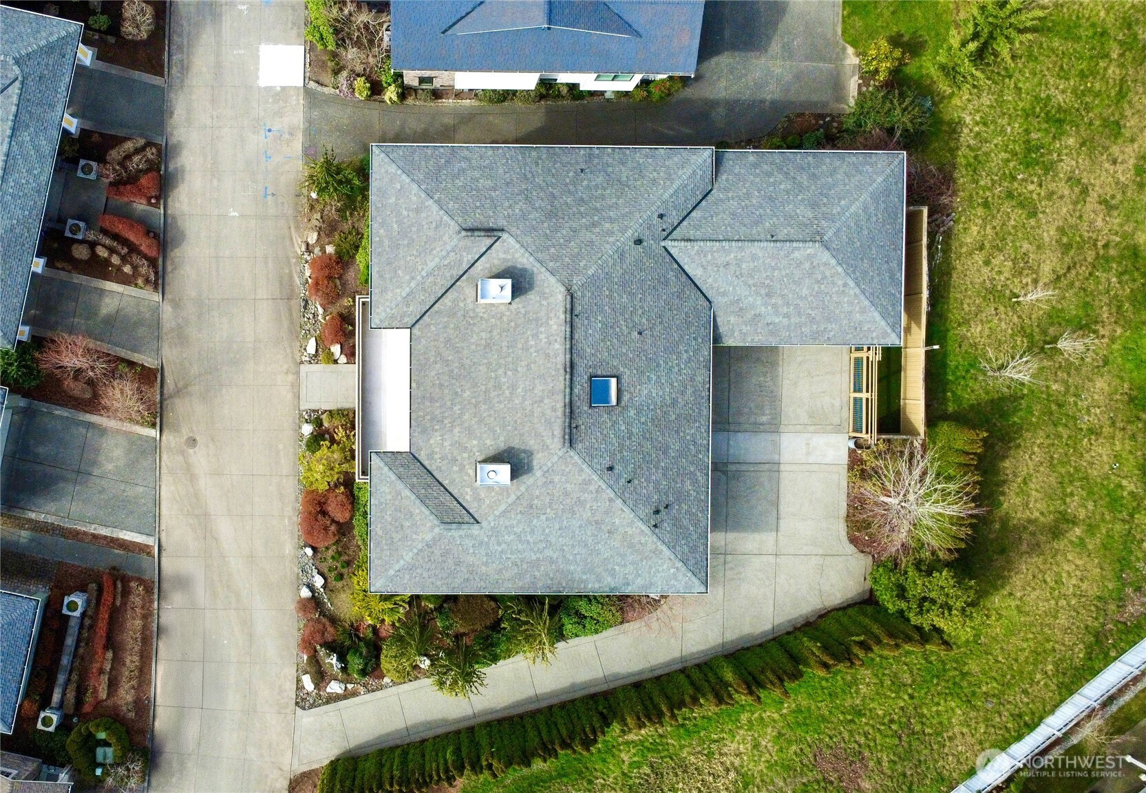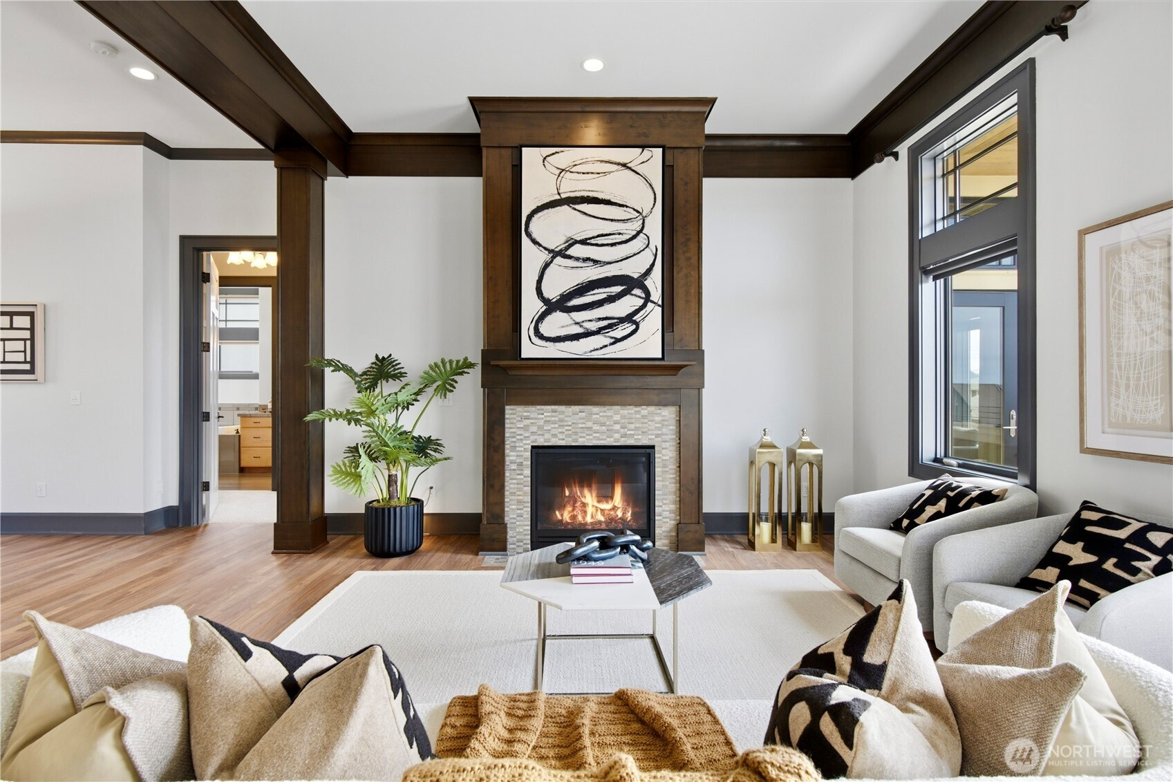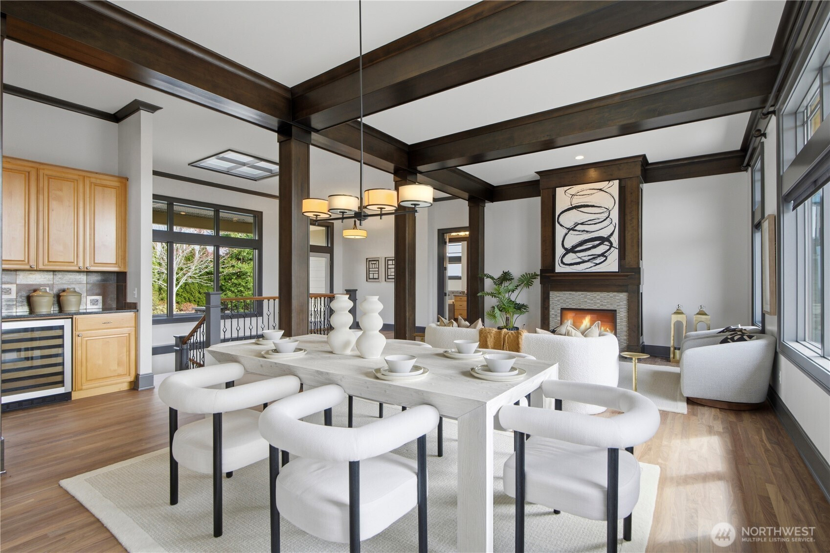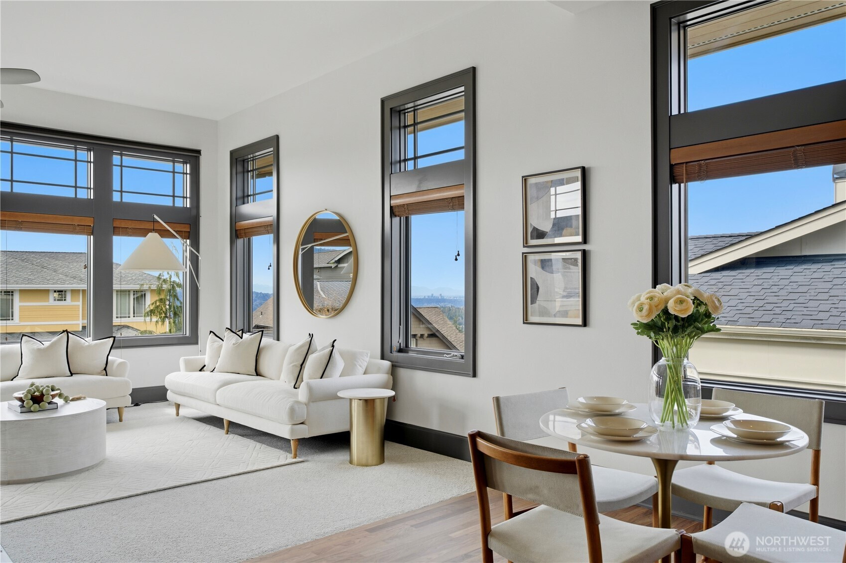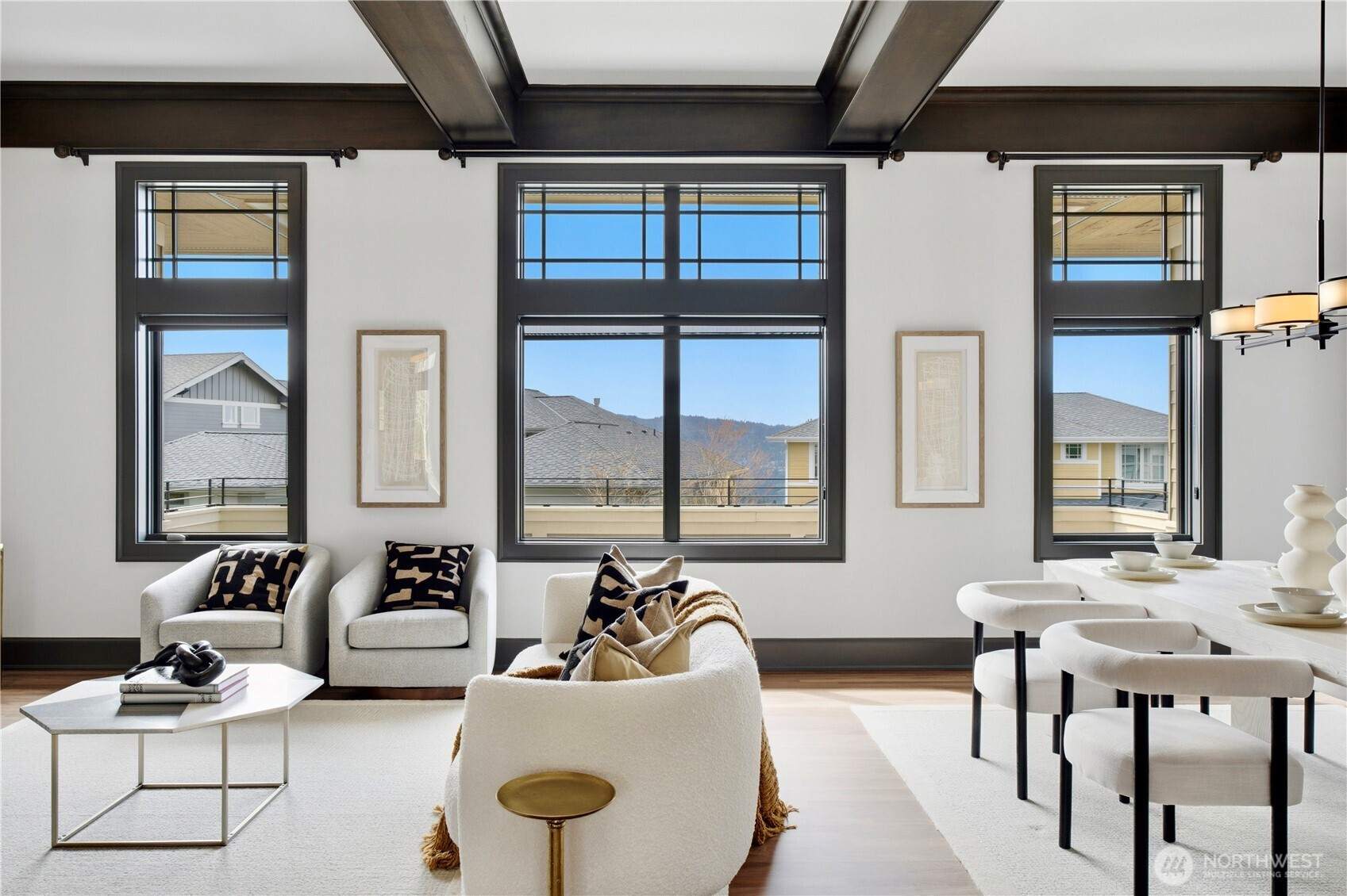 Exceptional Frank Lloyd Wright inspired home bordered by refined landscaping. Experience elevated living in this exquisite Issaquah Highlands retreat. Tucked away on a peaceful cul-de-sac, this home blends timeless elegance with modern sophistication, offering sweeping views and unmatched privacy. Soaring high ceilings, fabulous open-plan living room filled with natual lights extends to stunning view deck great for entertaining. Distinctive detailing & palette with Brazilian walnut hardwoods & contrasting charcoal gray millwork. New refinished flooring & new carpet. Gourmet kitchen: slab granite, Viking graphite gray appliances, walk-in pantry. Gorgeous primary suite w/sitting area & deck access. Lower level features 2 bedroom ensuites, spacious Bonus room/4th bedroom, wine cellar, office. Expansive driveway, 3-car garage, EV charger ready. Dog run w/turf. Nearby trails/parks. This is where luxury meets lifestyle.