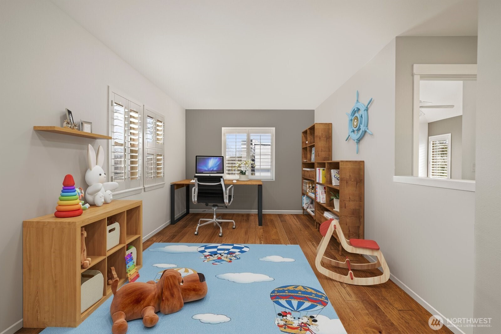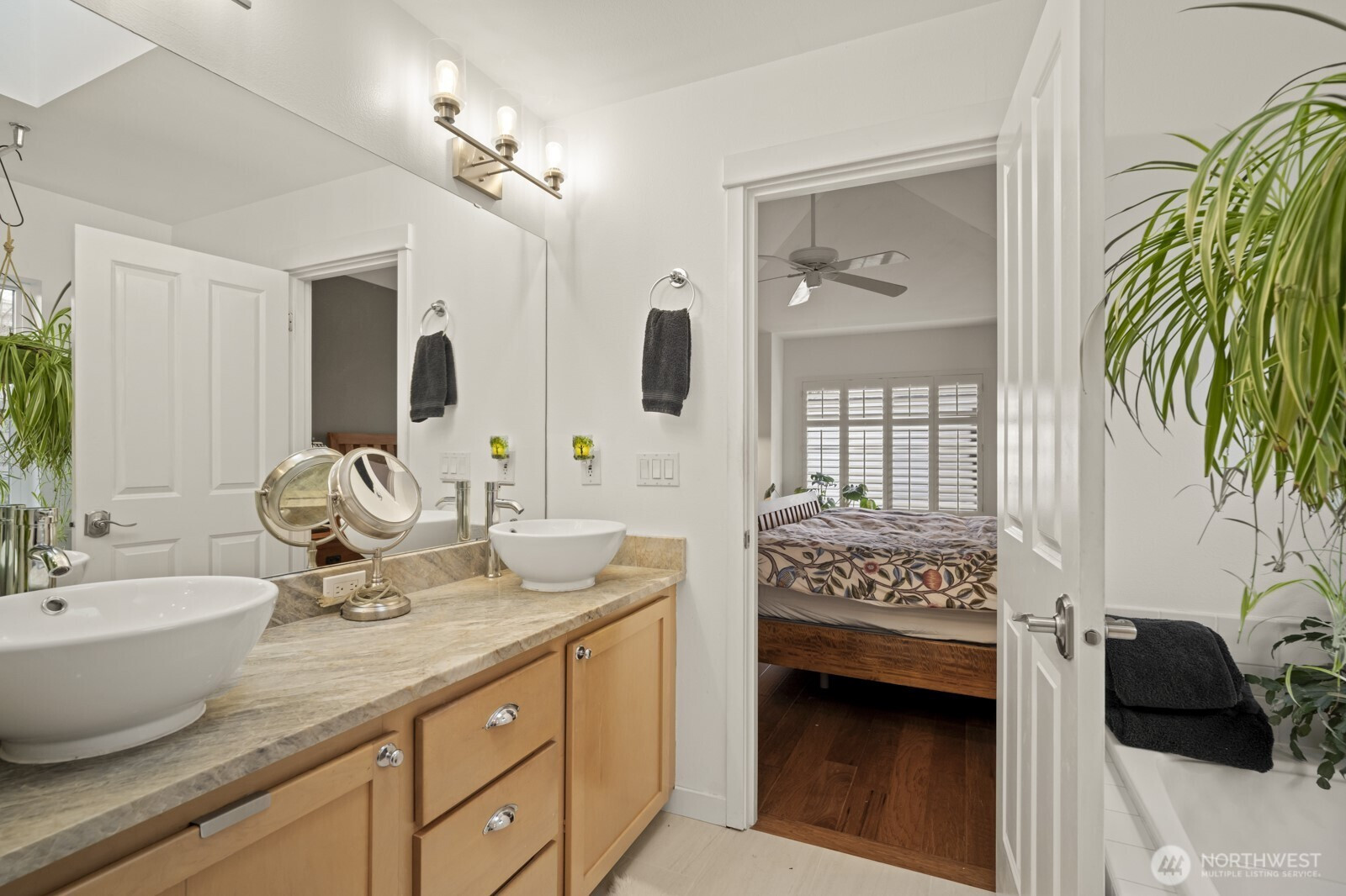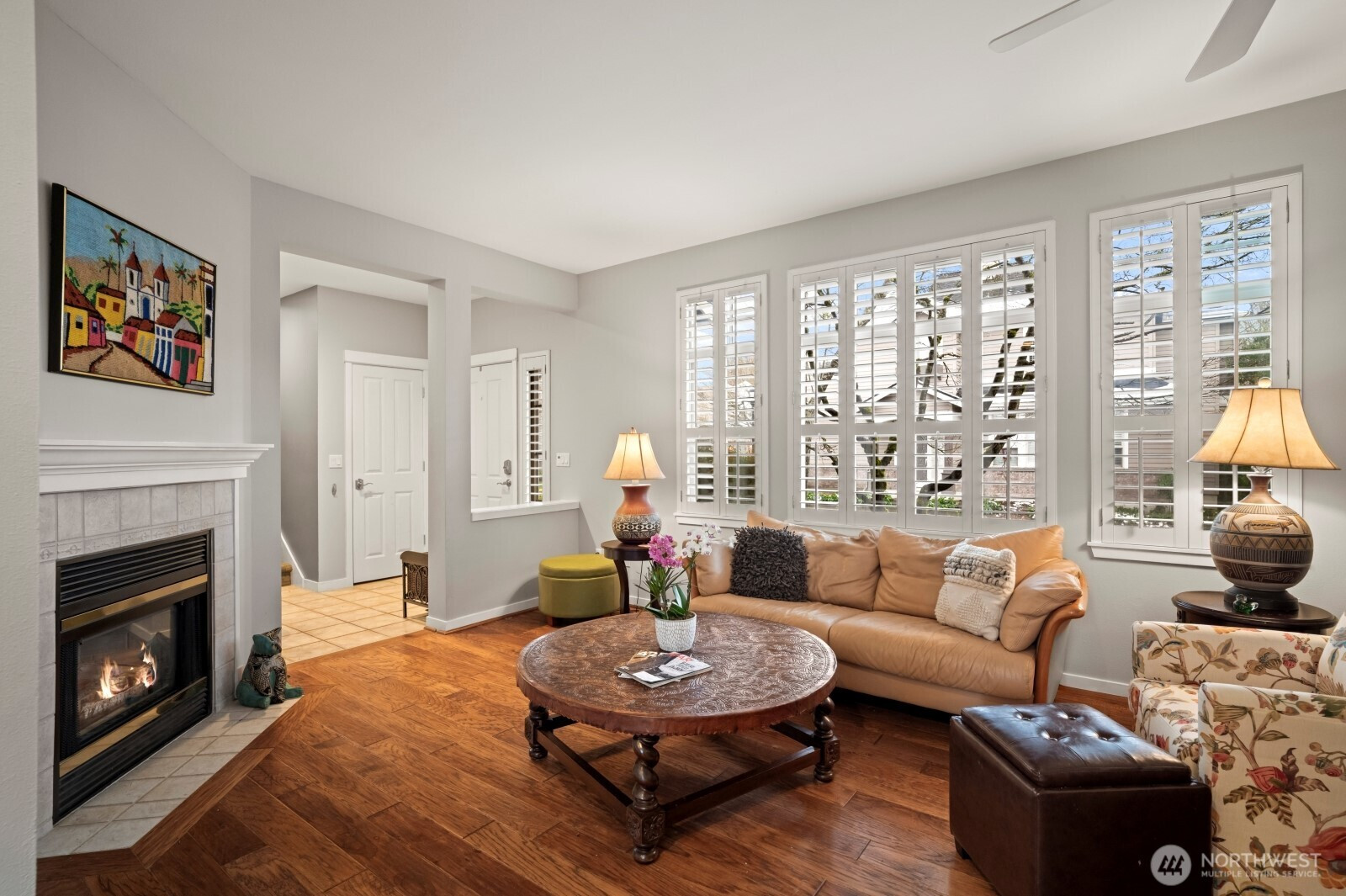 Sought after Windwood Village at Bella Bottega! This detached townhome lives like a single-family home—without the exterior maintenance—walk to shops, restaurants the movie theater and just steps to the Sammamish River Trail. Offering 1,866* sq ft, this home features 3 bedrooms plus a flexible bonus space ideal for a home office and/or media room. A charming Craftsman exterior and covered front porch create a warm welcome. Inside, the tiled foyer opens to a bright great room with engineered hardwood floors, ceiling fan, cozy gas fireplace, transom and shuttered windows. The open layout flows into the dining area and kitchen with slab granite counters, warm wood cabinetry, tiled full height backsplash, breakfast bar, pantry and stainless steel appliances including a new dishwasher, recessed refrigerator and gas range/oven. Sliding doors off the kitchen lead to a private backyard patio, perfect for morning coffee or afternoon respite. Upstairs includes three bedrooms, two updated baths, and a bonus/flex space. The vaulted primary suite offers a ceiling fan and an updated five-piece bath with soaking tub, tiled shower, 12x24 tile floors, and dual vanities with floating vessel sinks. 2 additional bedrooms—one with a queen sized Murphy bed—share a full bath also updated with new lighting and vessel sink. Highlights include: new furnace (2024), 2-car garage with overhead storage, 9-ft ceilings, white shutters on all windows and engineered hardwood floors throughout. Pre-inspected!