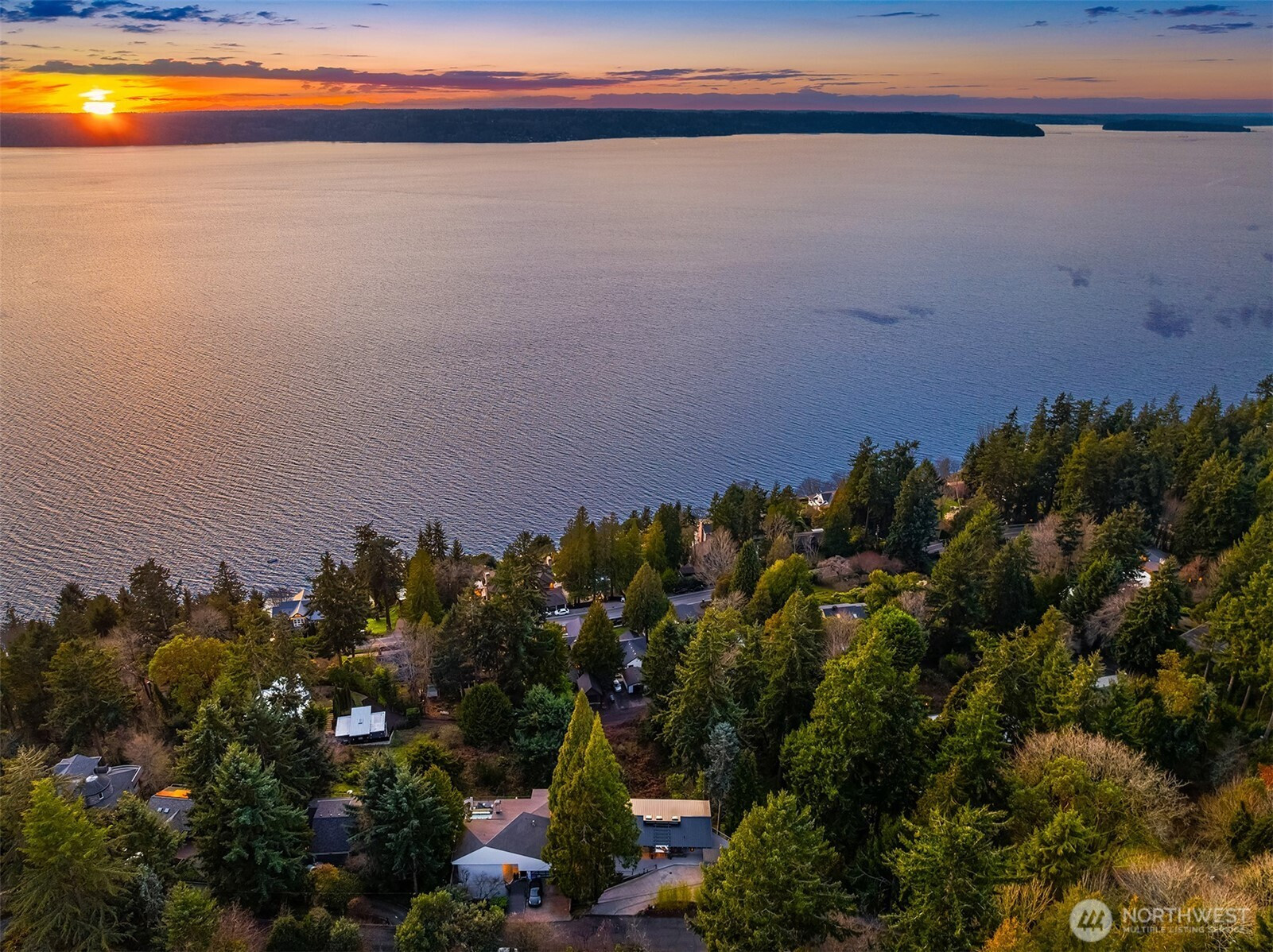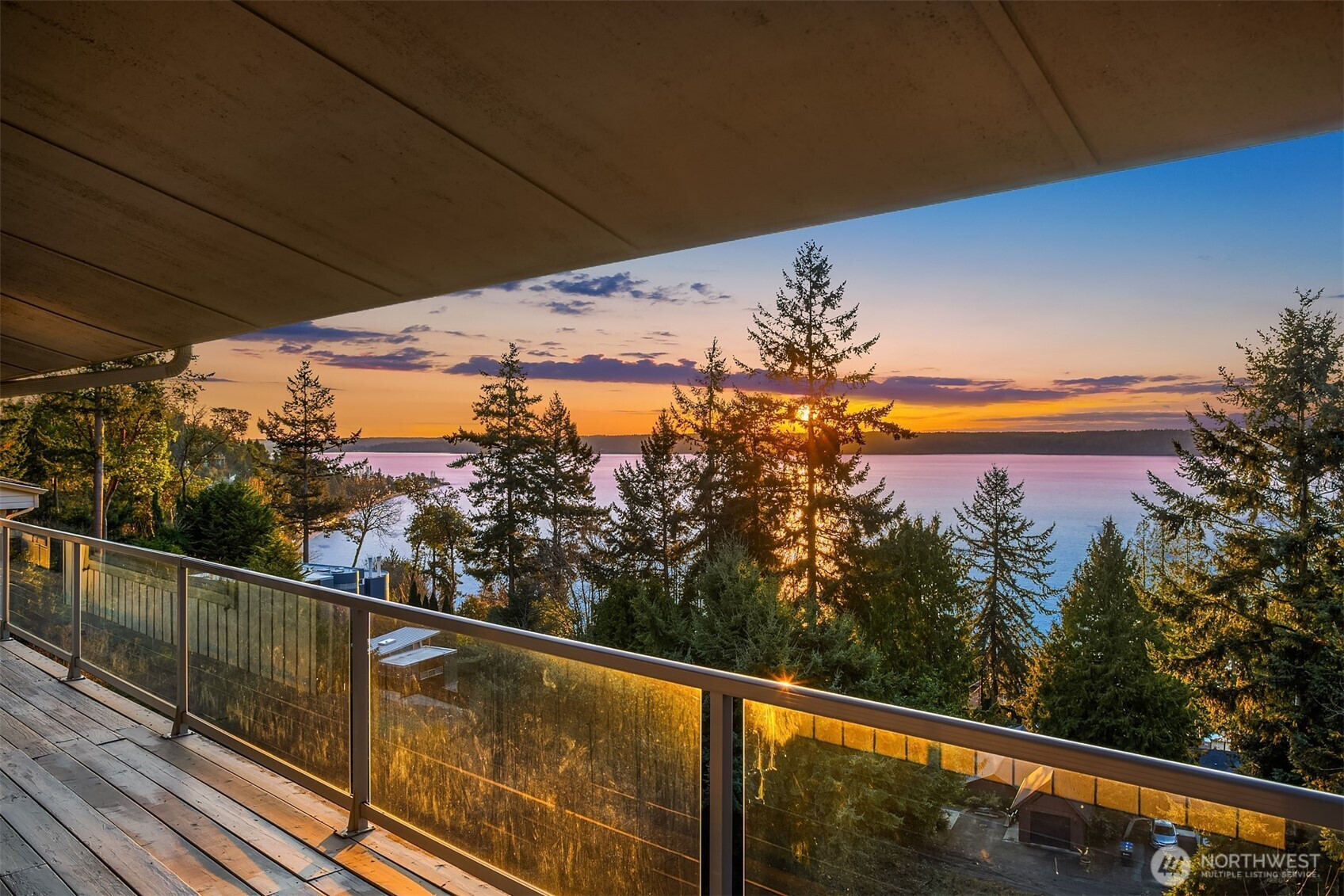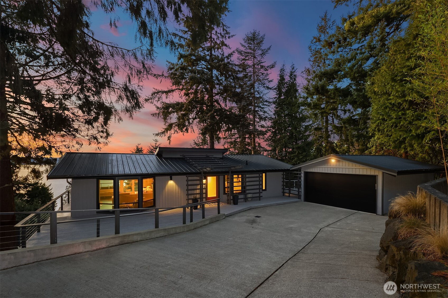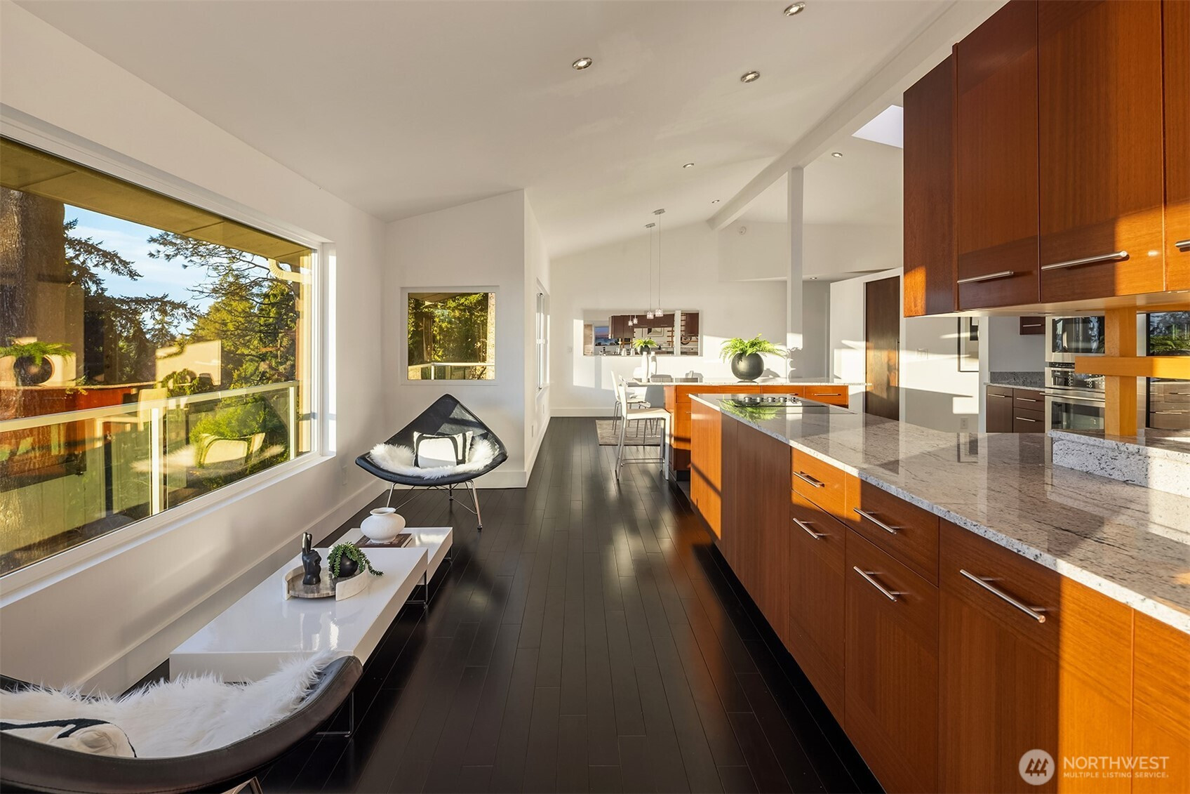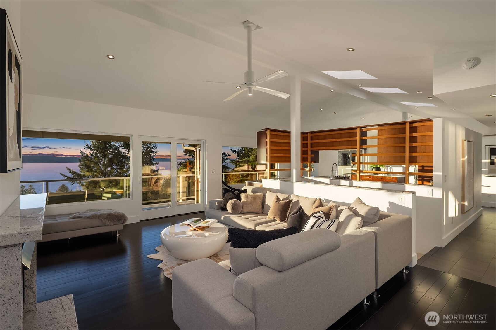 Perched on the quiet western slope of Three Tree Point, this fully reimagined mid-century retreat captures sweeping Puget Sound and Cascade Mountain views from nearly every room. Surrounded by trees for exceptional seclusion, the home blends sleek modern design with effortless comfort. The open, light-filled main level showcases vaulted ceilings, skylights, radiant heated tile floors, custom smoothed walls, and expansive windows framing the water. The entertainer’s kitchen features a large peninsula, eat-in island, glass-front Sub-Zero refrigerator, double wall ovens, walk-in pantry, and views from the cooktop. Dining space and a stylish powder bath complete the level. All three bedrooms are positioned together downstairs. The spacious primary suite offers stunning views, deck access, and a spa-inspired bath with soaking tub, dual-head shower, and custom walk-in closet. Two additional bedrooms and a full bath complete this floor. A versatile 600 sq ft lower level with private exterior access offers ideal ADU or multi-generational potential, currently built out with additional living space, fitness area, and wine storage. Enjoy over 1,500 sq ft of wraparound deck space. Set on a generous 19,000 sq ft lot with potential to build, plus a 2024 metal roof, foam insulation, detached 2-car garage, and ample driveway parking, this is turnkey view living at its finest.