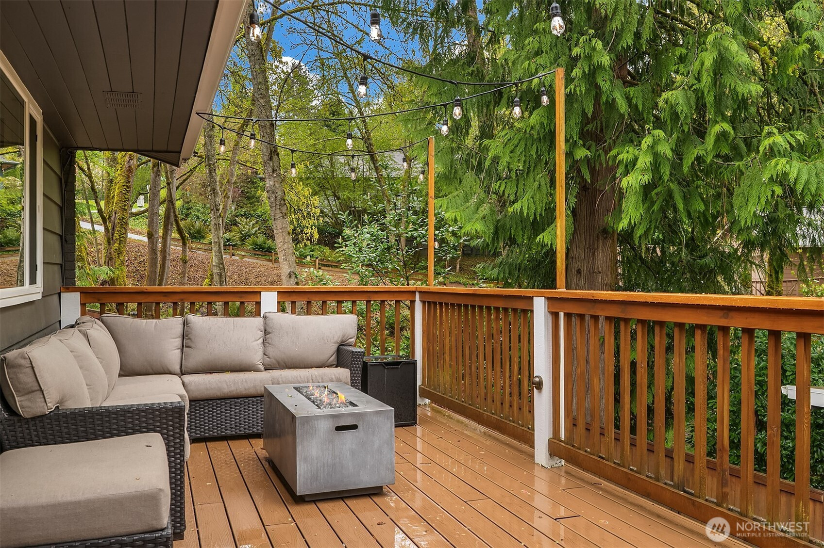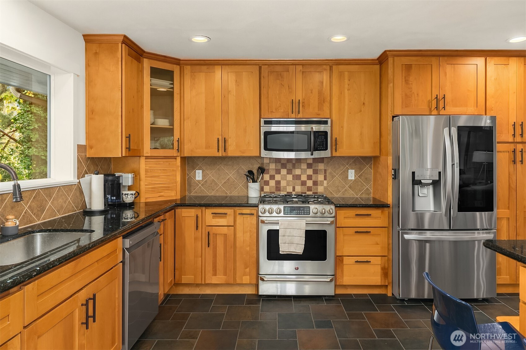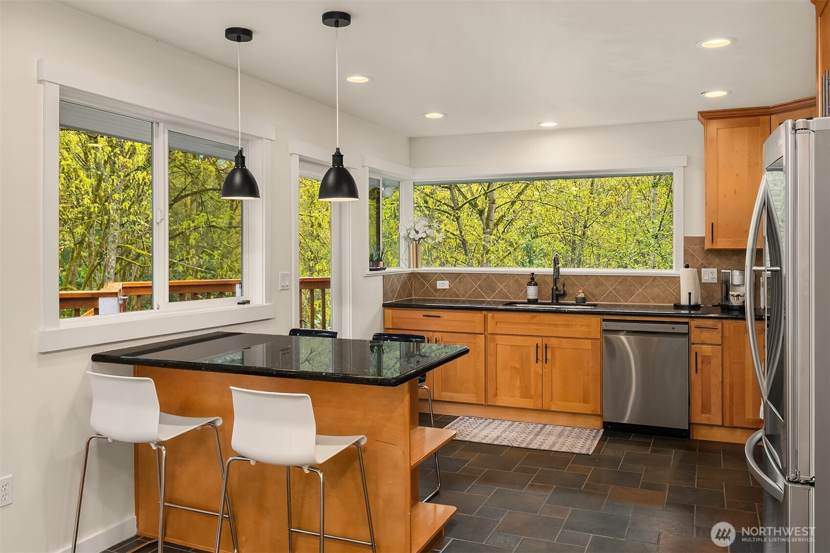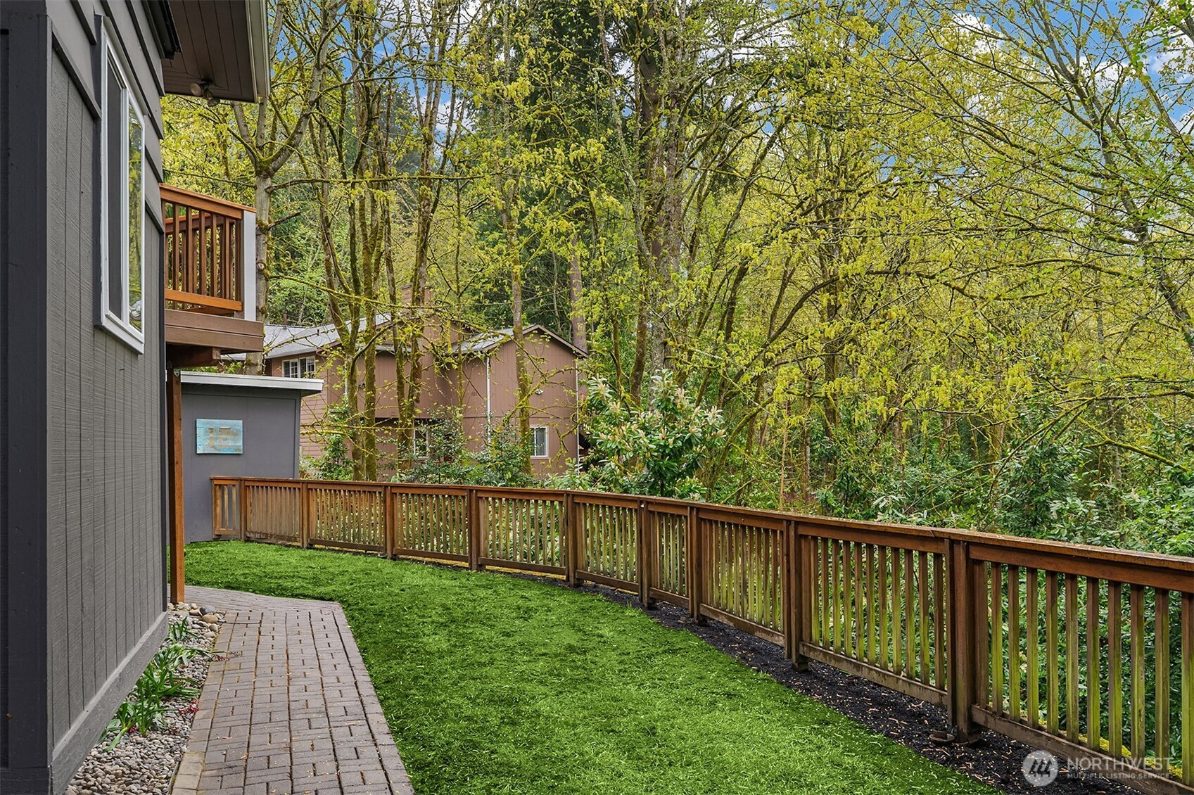 Tucked away in a quiet setting in the Moorlands neighborhood, this refreshed and refined home offers a rare blend of privacy, comfort, and everyday livability. Backing to a protected greenbelt with serene territorial views, the property creates a peaceful retreat where you can truly unwind. The main floor features an expansive chef’s kitchen with large island, newer appliances, and ample space to gather, cook, and connect. Off the kitchen, the light-filled living room with wood-burning fireplace flows seamlessly onto a spacious deck—perfect for indoor-outdoor living and taking in the tree-lined backdrop. With vaulted ceilings, the main level offers two well-appointed beds and a full bath, with remodeled finishes adding a modern feel. New hardwood floors enhance the warmth and continuity throughout. On the lower level, a generous family room with custom built-ins leads to the fully fenced yard, creating an ideal setup for relaxing and entertaining. This level also includes an additional bed, a den/home office, and another bath—perfect for guests or remote work. Outside, the home continues to shine with a fully fenced yard, sprinkler system, and mature landscaping—designed for easy maintenance and year-round enjoyment. Enjoy off-street parking and a garage with EV charger. With its private setting, functional layout, and updates, this home offers a lifestyle defined by comfort, flexibility, and connection to nature—just minutes from local amenities, parks, and commuter routes.
