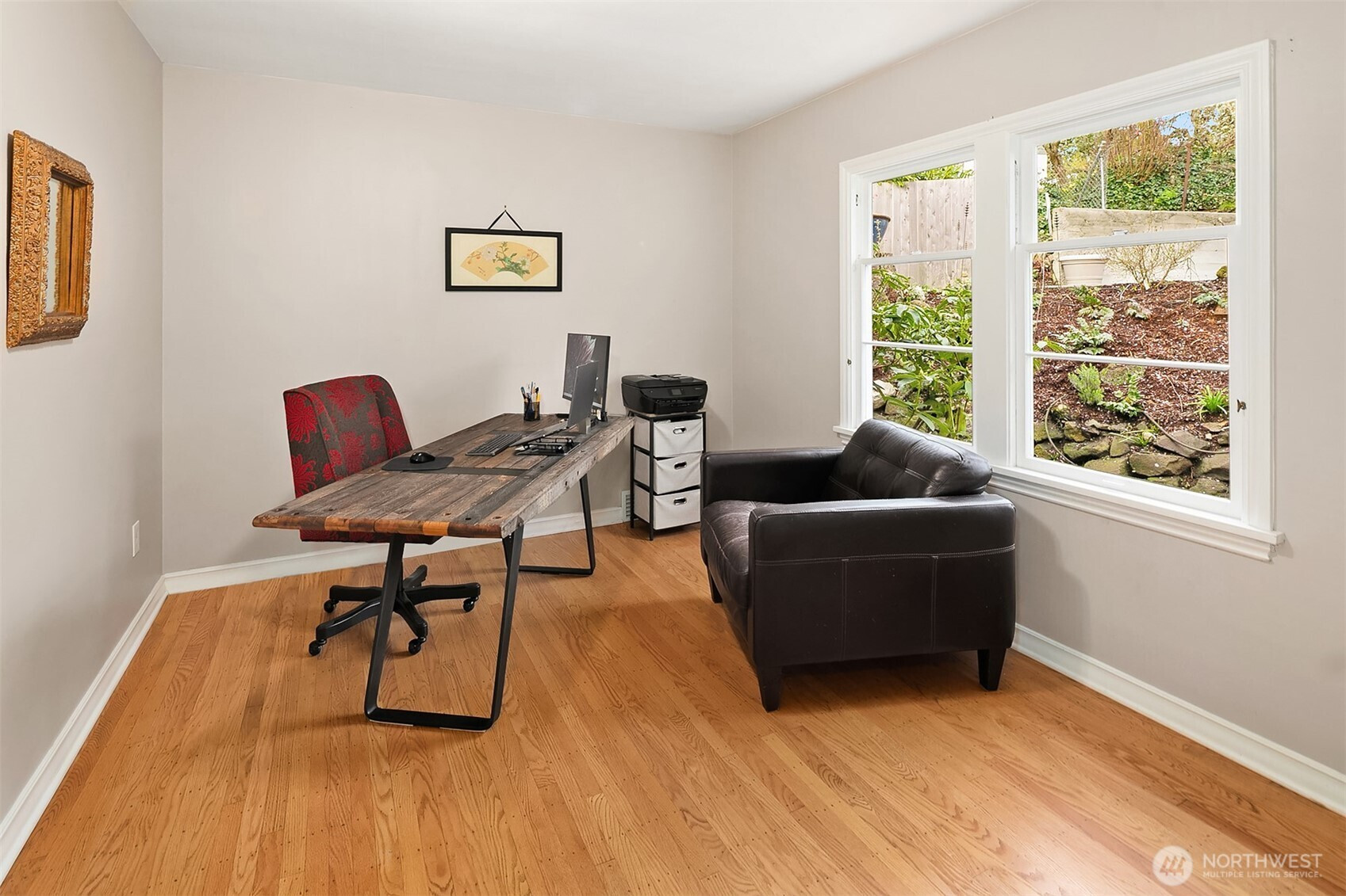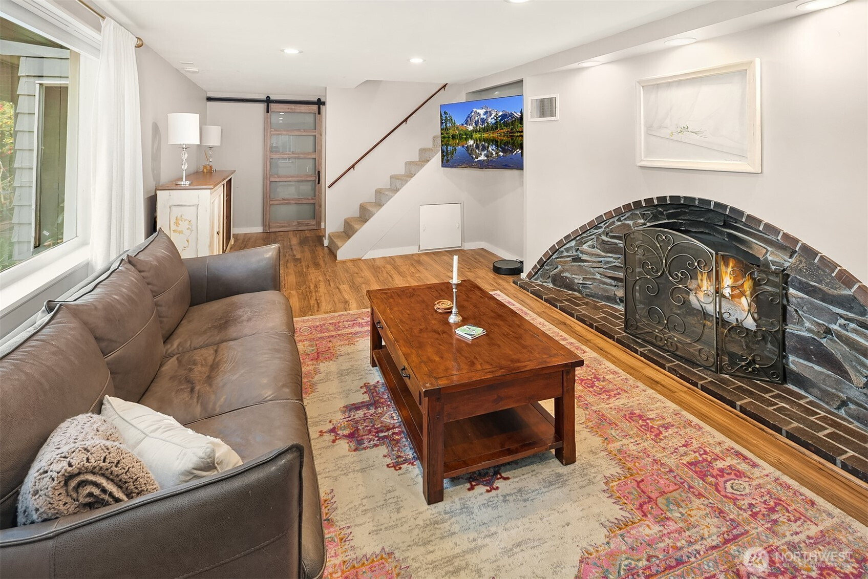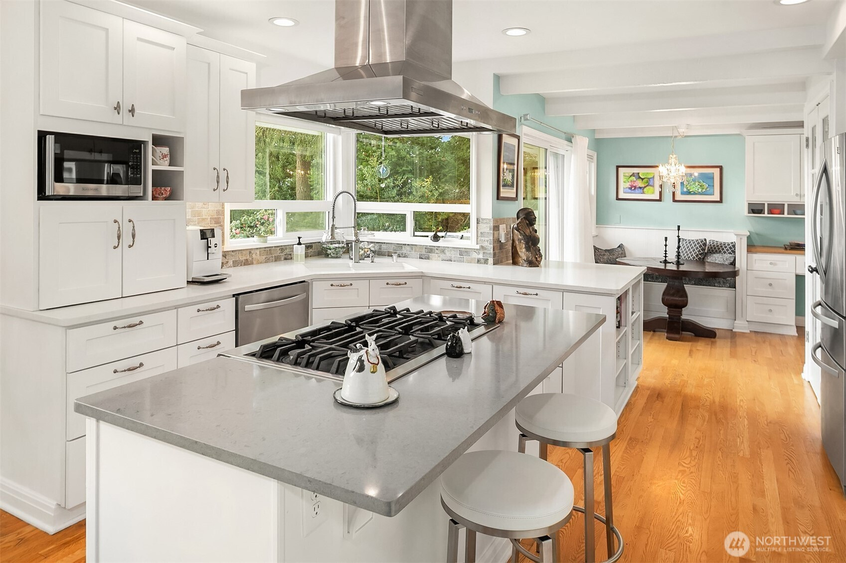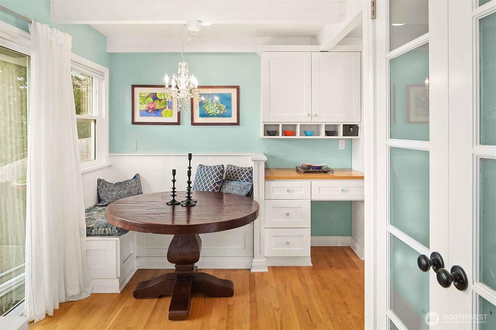 Tucked high among the aromatic evergreens of Three Tree Point lies a treetop refuge that feels suspended between earth and sky. Built in 1939, its architecture is a charming blend of traditional, craftsman and mid-century—like a home that has collected eras the way travelers collect stories. Here, the boundary between home and nature blurs. Eagles drift past the windows, and seabirds trace arcs against a backdrop of mountains and shimmering water. From the bay windows and deck, the sun melts into the horizon, the trees catching the light and scattering it in streaks of orange, pink and red. The surrounding landscape feels both wild and lovingly tended. Fig and apple trees mingle with raspberries, elderberries, and clusters of champagne grapes—a quiet garden orchestra that hums with life. Reaching the home requires following a private drive that feels like a gentle retreat from the world. Yet, surprisingly, shops, restaurants, and the airport are close enough to be convenient but far enough to leave the tranquility untouched. Inside, the home bursts with character. Built-in shelving and cabinetry curve into the walls, waiting to hold books, art and keepsakes. Downstairs, a unique arched cove-style fireplace anchors the main room, radiating a warmth that feels both literal and nostalgic. This is more than a house; it’s a perch above the shore, a front-row seat to the quiet theater of sky, sea and forest. A timeless retreat where modern life pauses—and nature takes center stage.