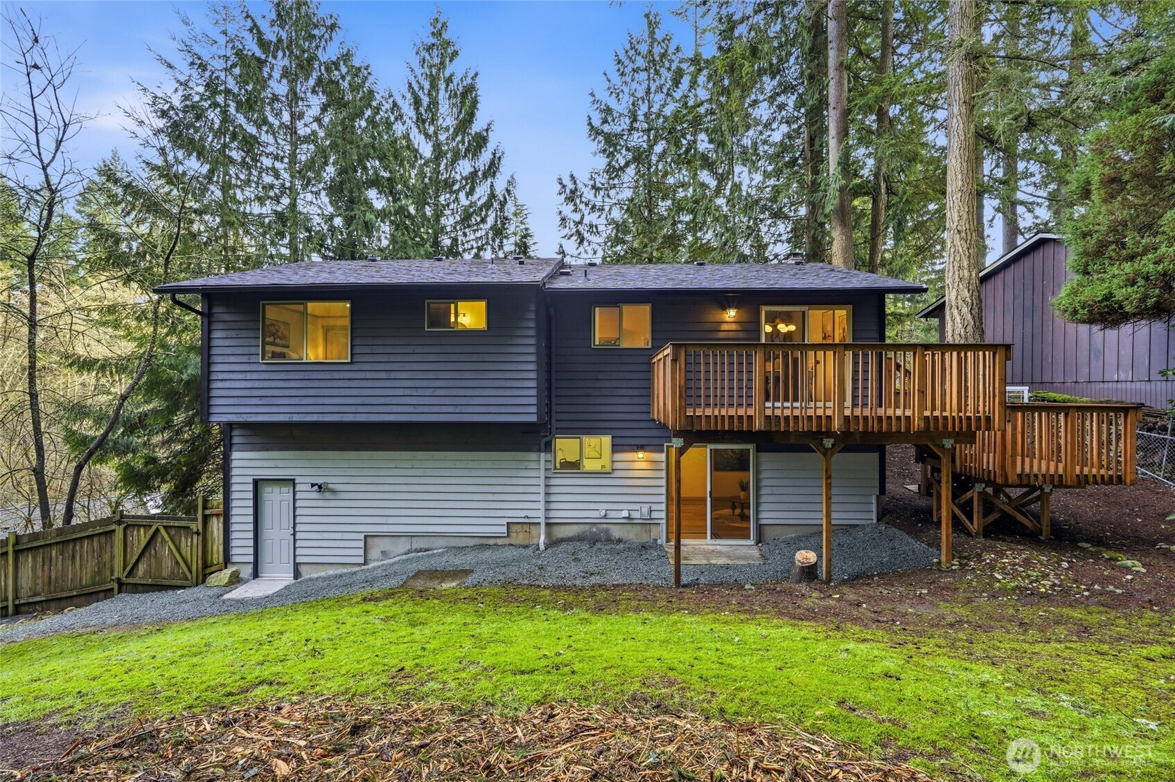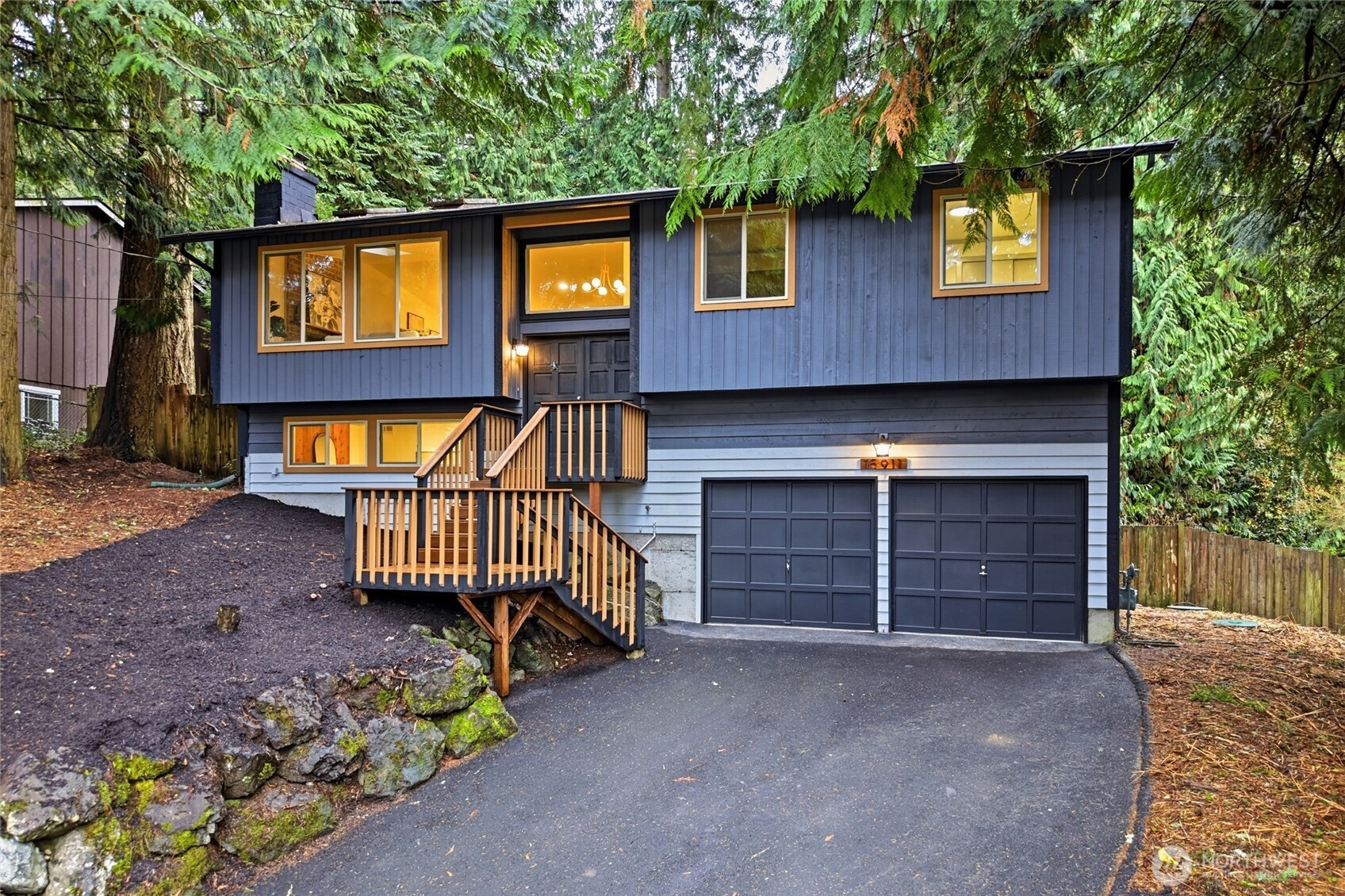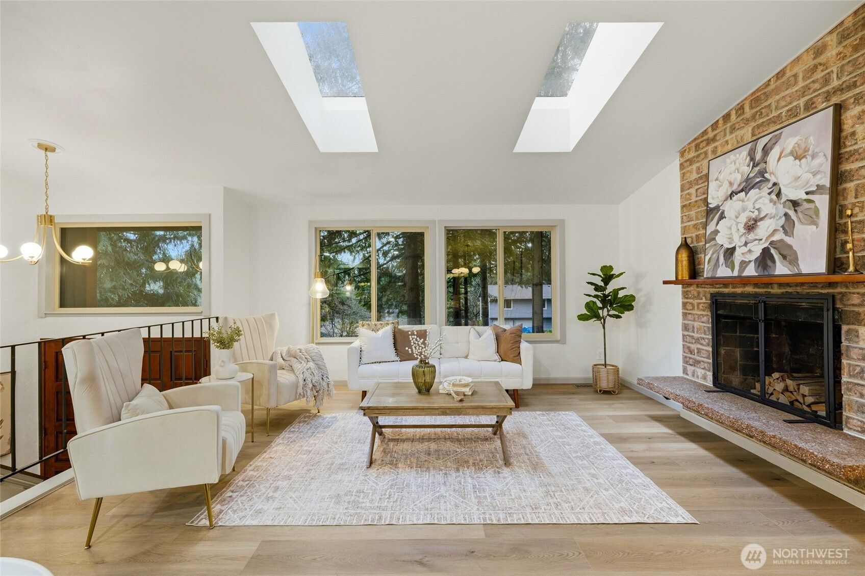 Elegantly updated 3-bedroom, 3-bath home with bonus room & office, blending modern style with everyday functionality. The open-concept living areas feature vaulted ceilings, skylights, two wood-burning fireplaces, creating bright & inviting spaces. The entertainer’s kitchen offers artisanal timber cabinetry, granite countertops, new appliances, & workstation sink. Enjoy LVP flooring throughout the main living areas, new carpet in bedrooms & office, fresh interior paint, & new shaker-style doors & trim. Primary suite includes a ¾ bath with custom tile & closet organizer. Main bath features a soaking tub with tile surround. New roof, exterior paint, rebuilt cedar & composition decks. Secluded cul-de-sac location near Woodinville Town Center.