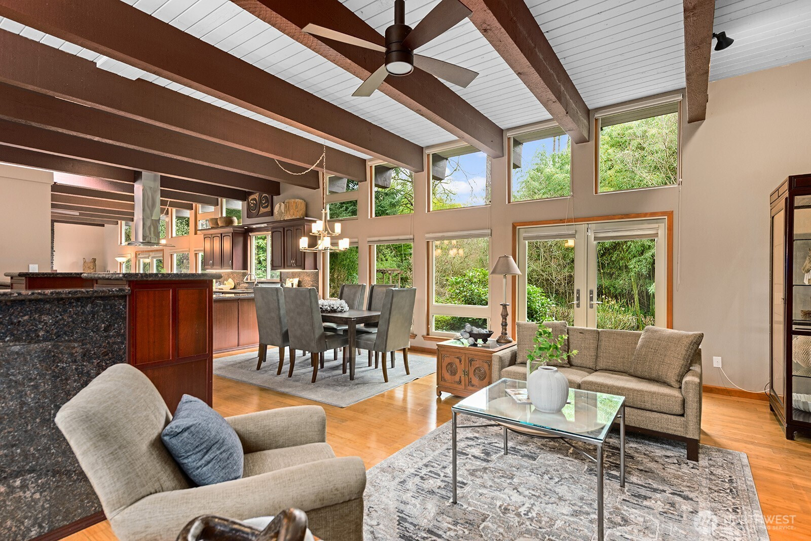 Stunning Mid-Century Modern masterpiece in Bellevue’s sought-after Newport Shores community, this one is truly special. Set on a rare half-acre lot, this architecturally distinctive 3-bedroom, 2.5-bath home offers an exceptionally unique Pacific Northwest experience of native landscaping and your own personal stretch of Coal Creek. Designed for both everyday living and entertaining, this one-level home features a fully open-concept living area with soaring ceilings, abundant natural light, and a wall of glass that blends seamlessly to the serene outdoors. A gorgeous cherry wood and granite kitchen with an induction cooktop makes up the heart of the space anchored on each end by impressive fireplaces. A spacious primary offers its own retreat with a private patio and custom natural stone walk-in shower. A three-car garage and semi-circular driveway provide ample parking and convenience. Pre-inspected and meticulously maintained, recent updates include a TPO roof, furnace, and tankless water heater. Residents of coveted Newport Shores enjoy amenities including a pool, athletic courts, and clubhouse plus easy access to a nearby marina, beaches, and trails. Ideally situated at the I-405 and I-90 interchange, minutes from the South Bellevue Sound Transit station, and within the award-winning Bellevue School District for Newport High School, the location is unsurpassed. Discover the perfect balance of nature, architecture, and community in this Newport Shores gem.