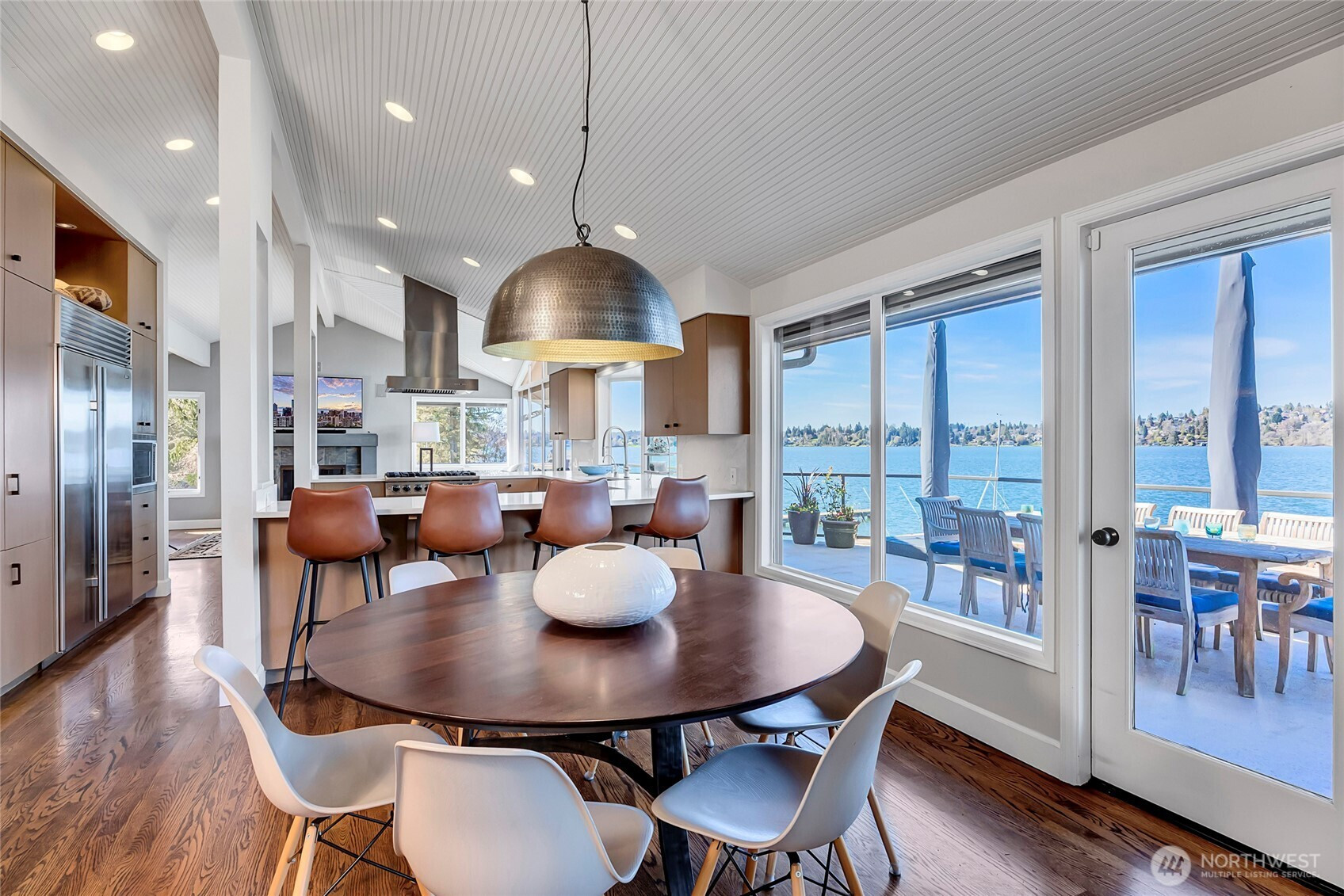 Get ready for summer at the lake! Located on coveted Meadow Lane on the west side of Mercer Island, this rare no bank Lake Washington waterfront home offers 95 feet of private shoreline, a private dock and an additional 1/8 interest in shared community waterfront. Rarely do west side Mercer Island waterfront homes become available on this quiet lane, and true no bank access to Lake Washington is even more uncommon. Sweeping 180 degree west facing views stretch across Lake Washington toward Seward Park, delivering stunning sunsets and front row seats to year round lake activity. Vaulted ceilings and expansive windows capture the water from the main living areas, while the remodeled kitchen opens to the family room and generous living and dining spaces, creating an ideal circular floor plan for both intimate gatherings and larger Seafair celebrations. Multiple view decks extend from the kitchen, family and living rooms, perfectly positioned for entertaining. Enjoy the quiet courtyard w/fountain that provides a peaceful retreat. True work from home office offers privacy and functionality. The primary suite on the main level features a spacious bath, private deck and more lake views. Spacious bonus room above the garage has flexible space for a media room, guest retreat or artist/craft studio. 3 additional, generously sized, bedrooms and a large recreation room complete the lower level. A rare opportunity to own west side Mercer Island no bank waterfront on Lake Washington.