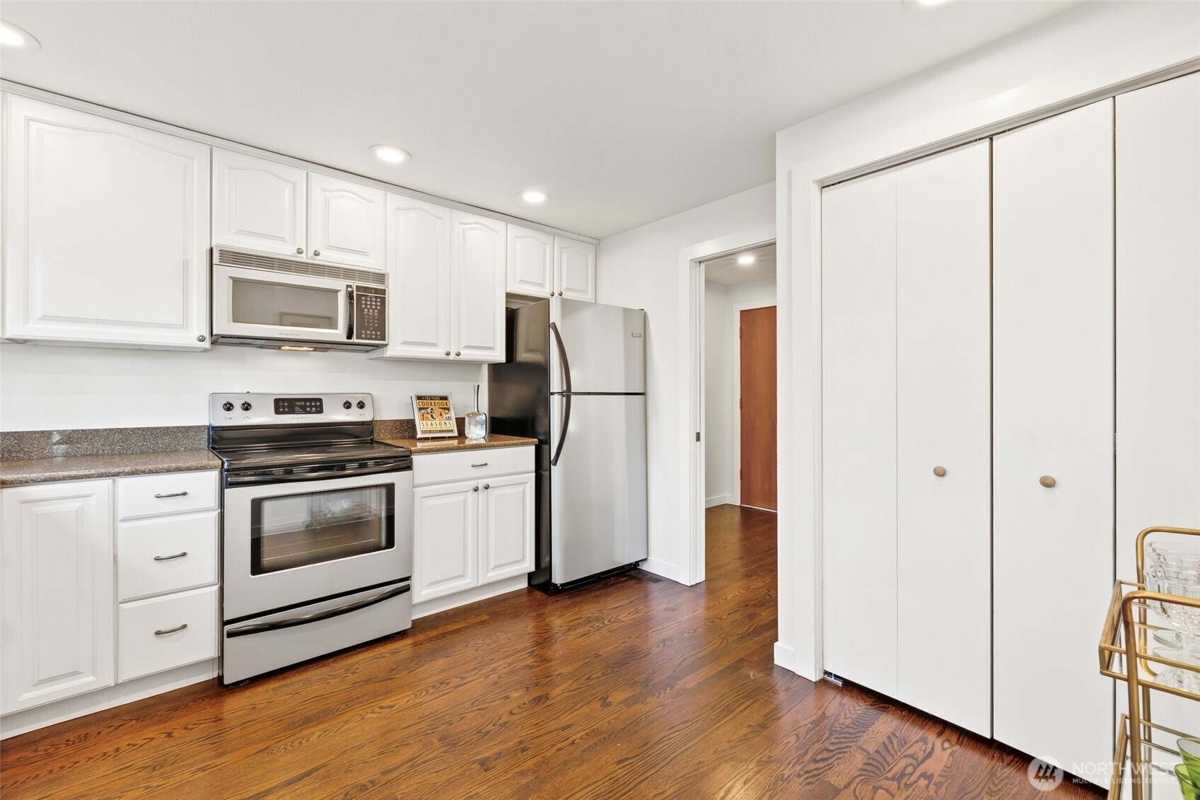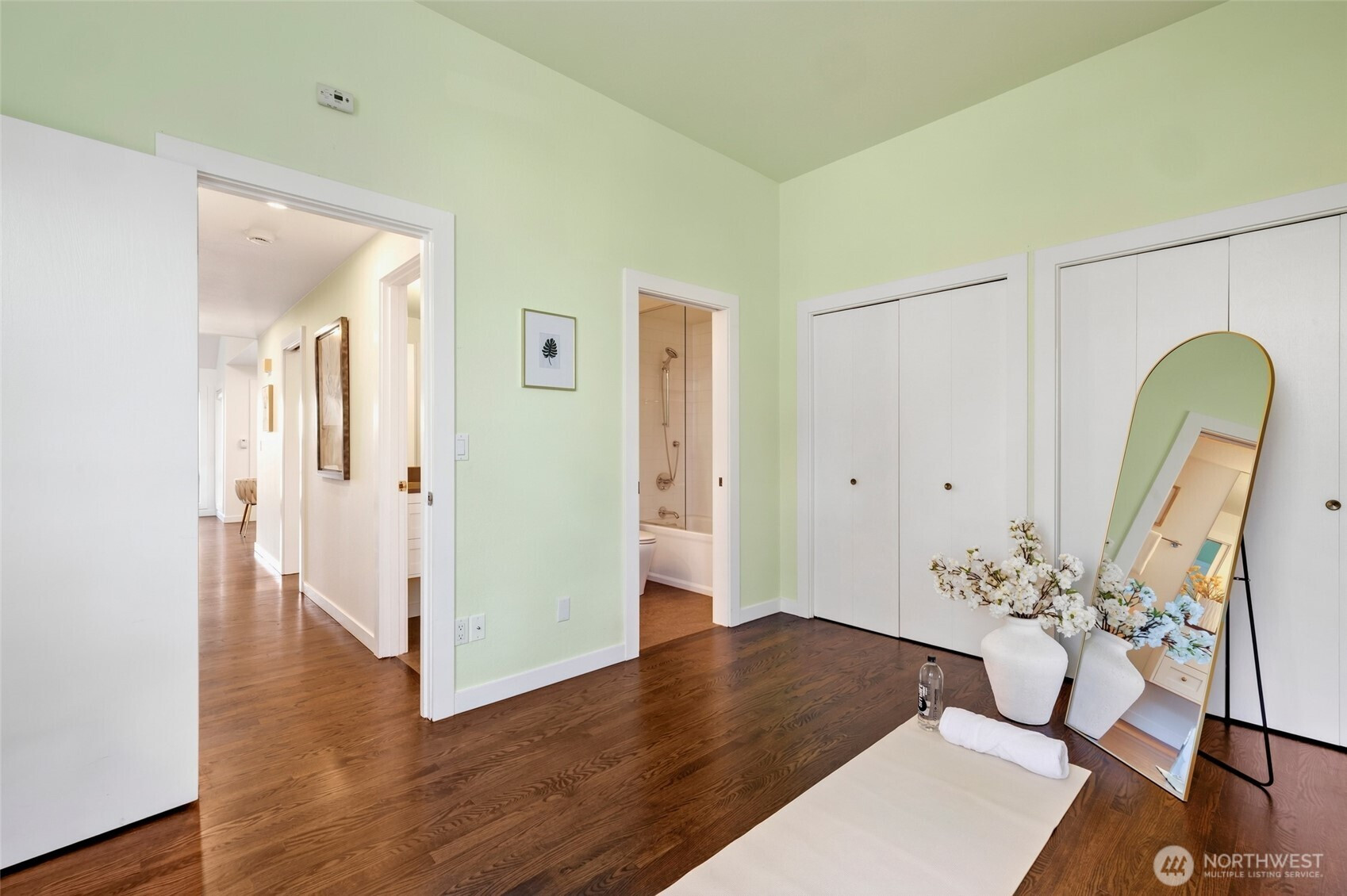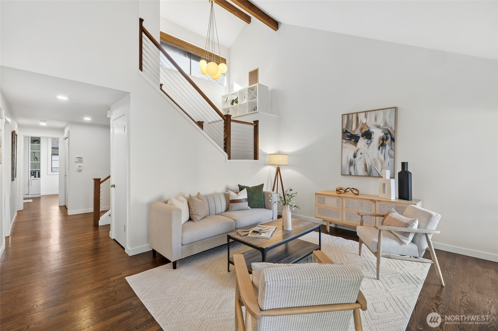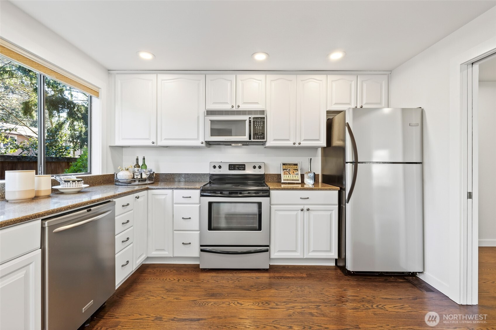 Experience a lock-and-leave lifestyle in this sun-drenched Craftsman townhouse, nestled within the serene Inglebrook community. Sharing only a garage wall, this 2BR/2BA residence lives like a single-family home, offering rare privacy and a sprawling floor plan just 12 blocks from Microsoft. Stepping inside, you are greeted by an open, airy layout featuring soaring vaulted ceilings, elegant oak hardwood floors throughout, and a large living room anchored by a cozy gas fireplace. Renovated kitchen boasting granite countertops, hardwood cabinetry, and a spacious dining area. A main-floor bedroom with a Murphy bed sits next to a full bathroom, easily converting into a gym or home office. The second floor is dedicated to the primary suite, featuring a steam shower retreat. Both bathrooms are beautifully updated with contemporary floating cabinets, sleek quartz counters and designer glass shower door. HOA dues covers everything from siding replacement, exterior painting, roof/skylight/gutter replacement (2019) to landscaping, driveway upkeep, & master insurance w/earthquake coverage. Key highlights include fresh interior paint, central A/C, a new water heater (2026), and a 2-car garage with 2 driveway spaces plus 2 guest parking nearby. Step outside to a generous private backyard—a rare find that is perfect for pets, gardening, and outdoor enjoyment. Community amenity includes club house, athletic court and gym. Mins to Crossroad mall, and easy access to 520 and I-405.