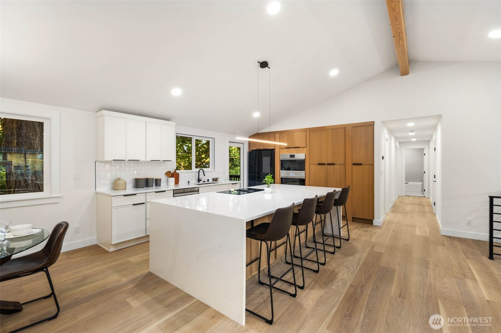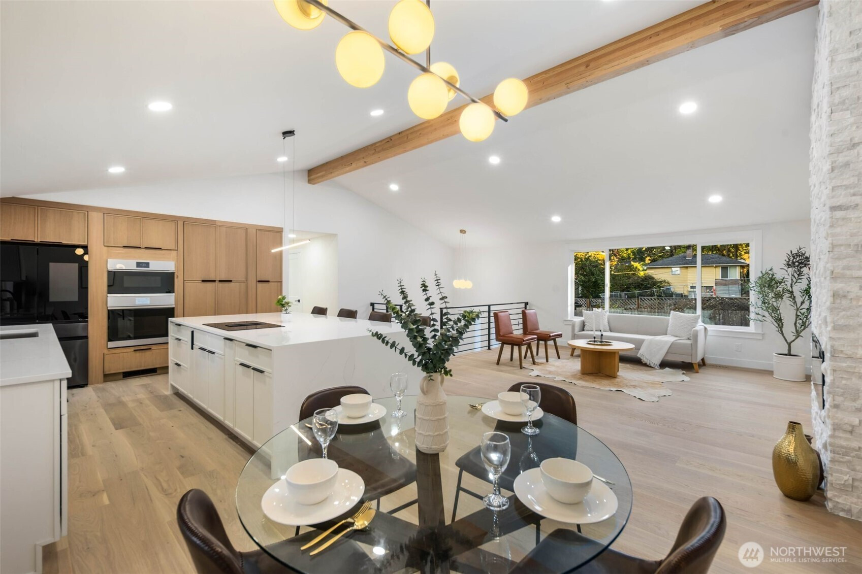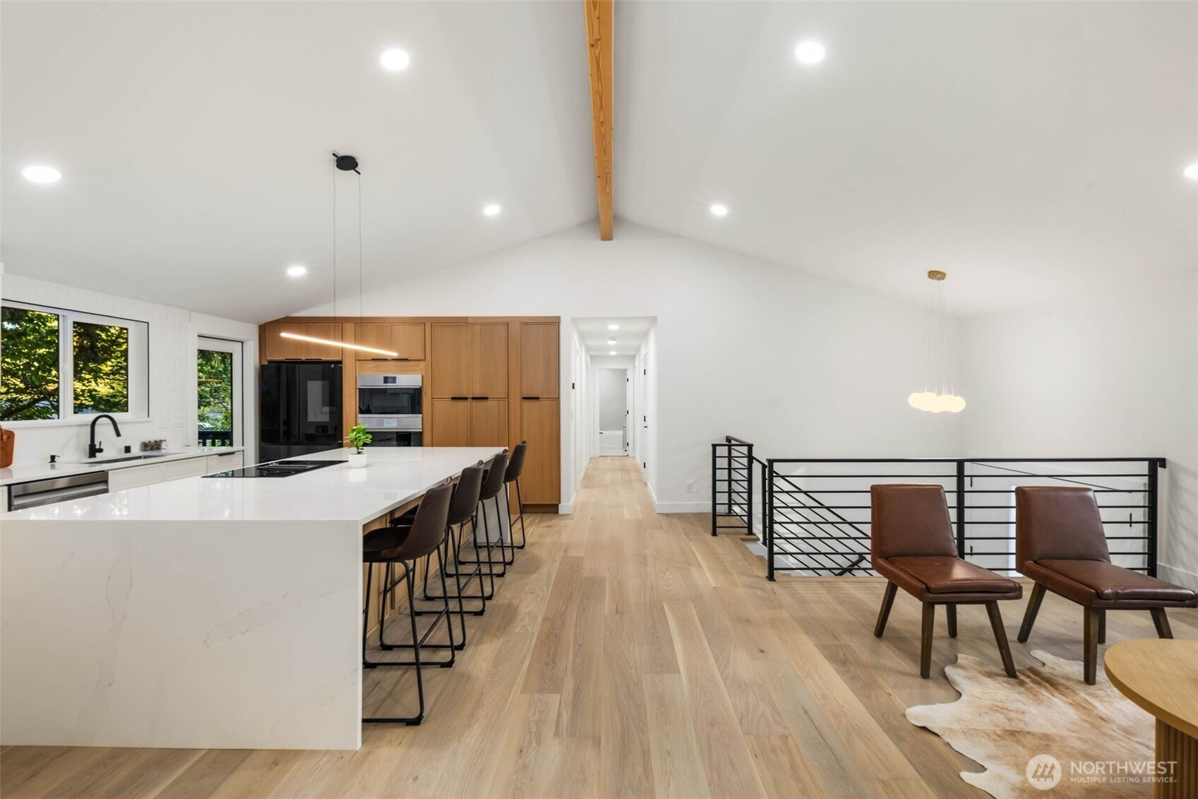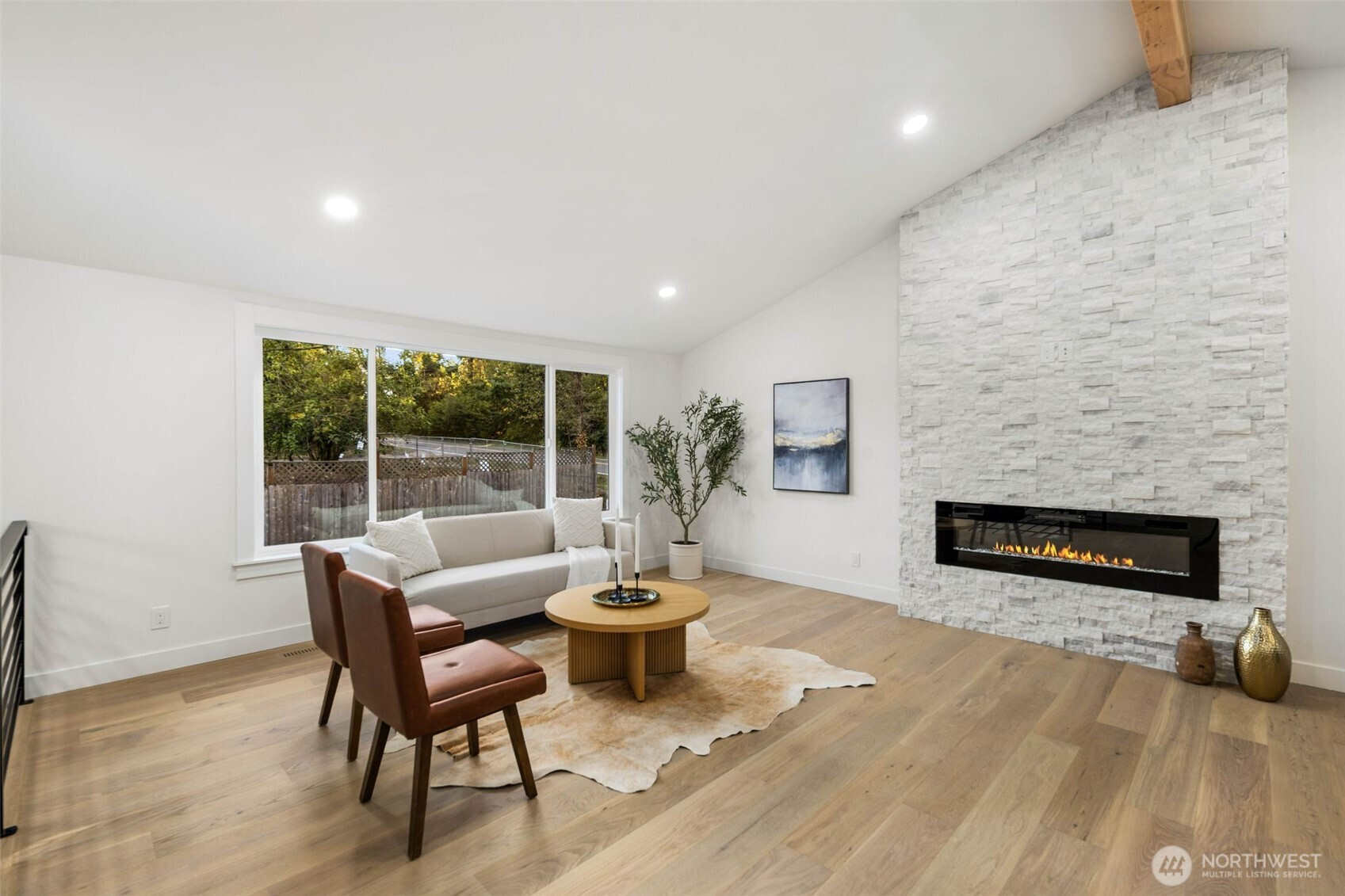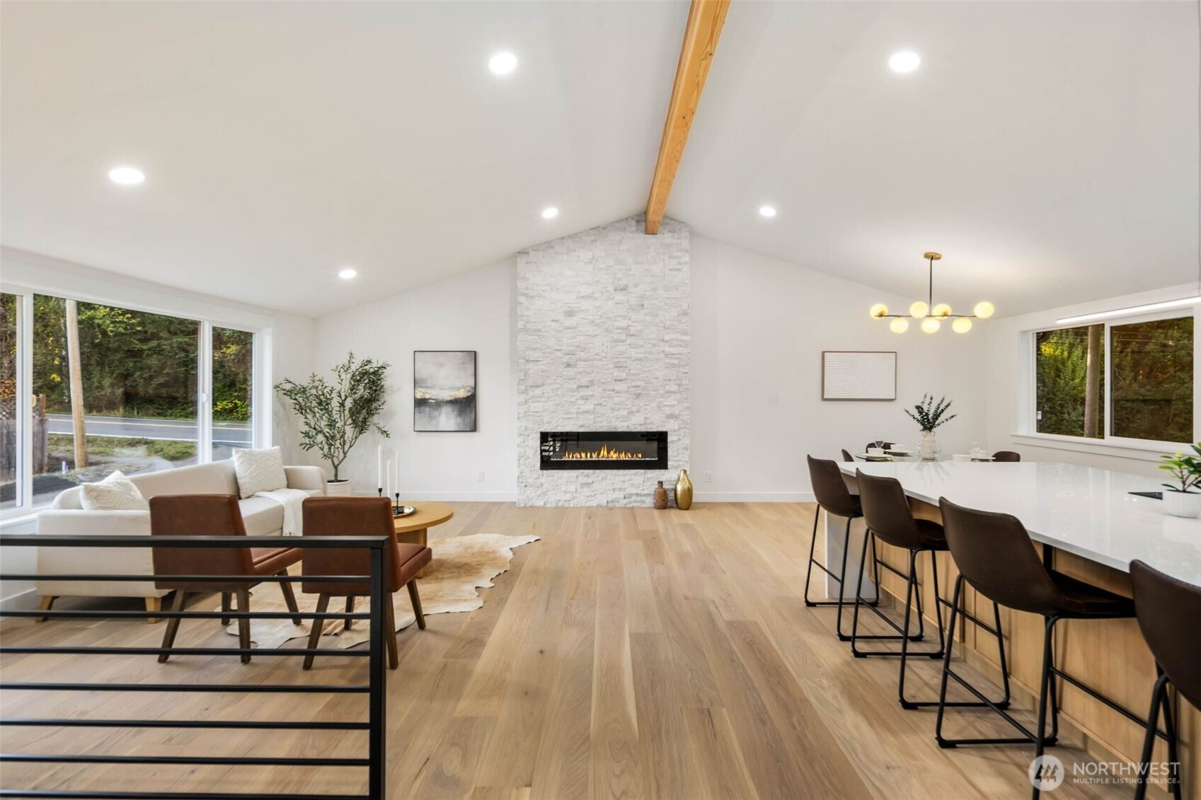 Experience modern elegance in this fully remodeled and permitted Shoreline home! Soaring vaulted ceilings, wide-plank floors, and exquisite tile work set the tone for refined living. The chef’s kitchen is the heart of the home, which includes a massive island and top tier appliances designed for both style and function, while the inviting living spaces flow seamlessly for entertaining or relaxation. Downstairs, a spacious family room with wet bar and wood-burning fireplace offers the perfect gathering place. Step outside to a beautifully landscaped yard with a deck and fire pit - your private retreat. Just steps from Shoreline Community College, shops, schools, parks, and transit, this home blends luxury, warmth, and location perfectly.