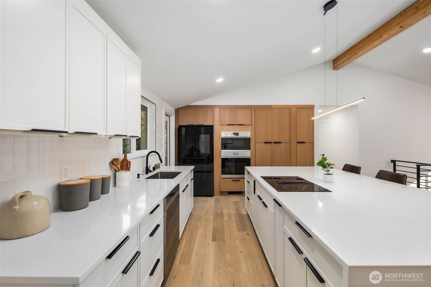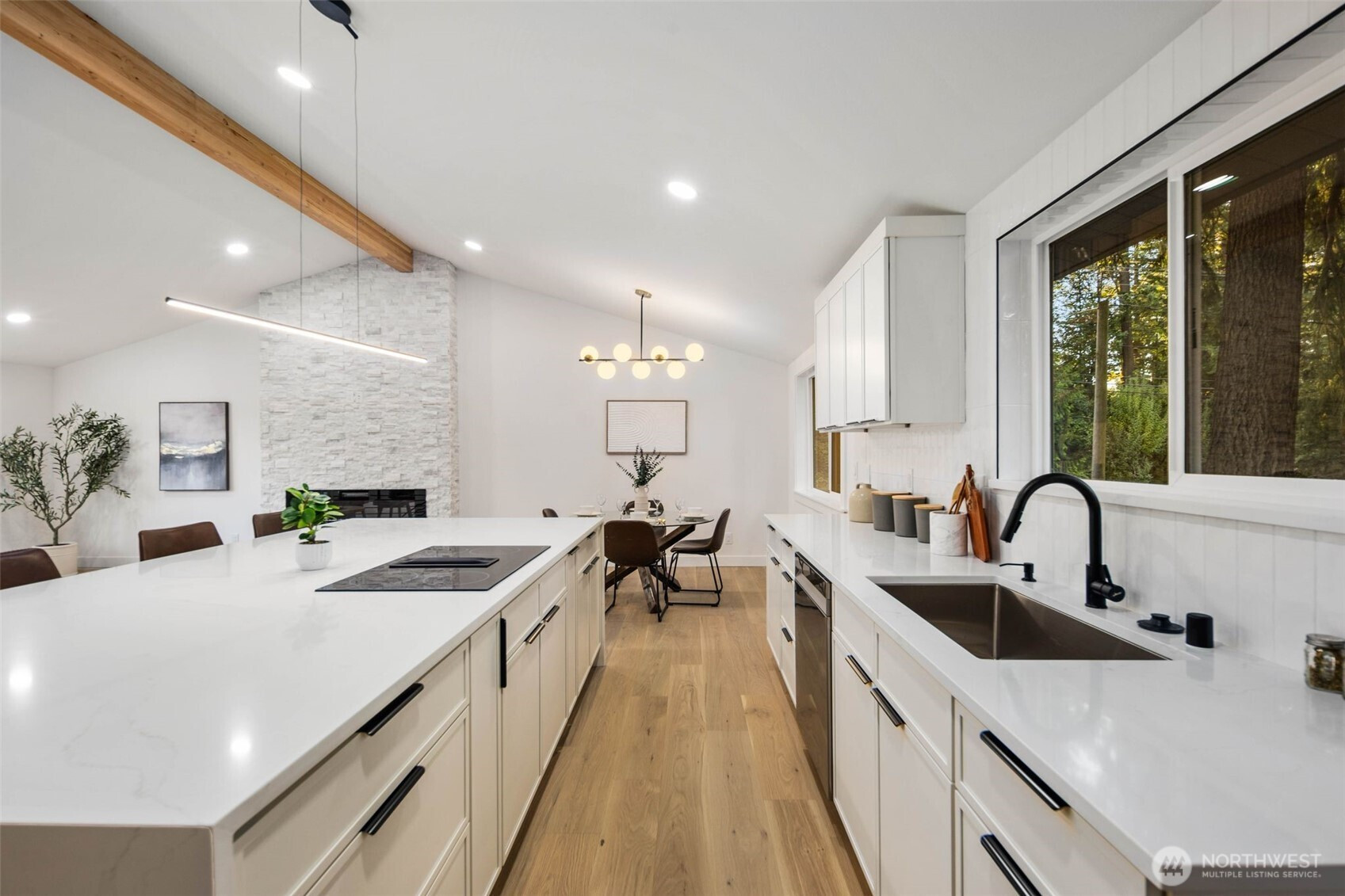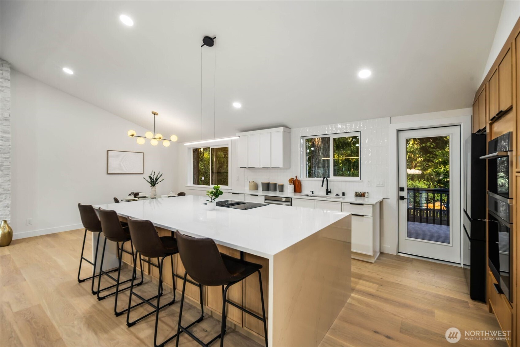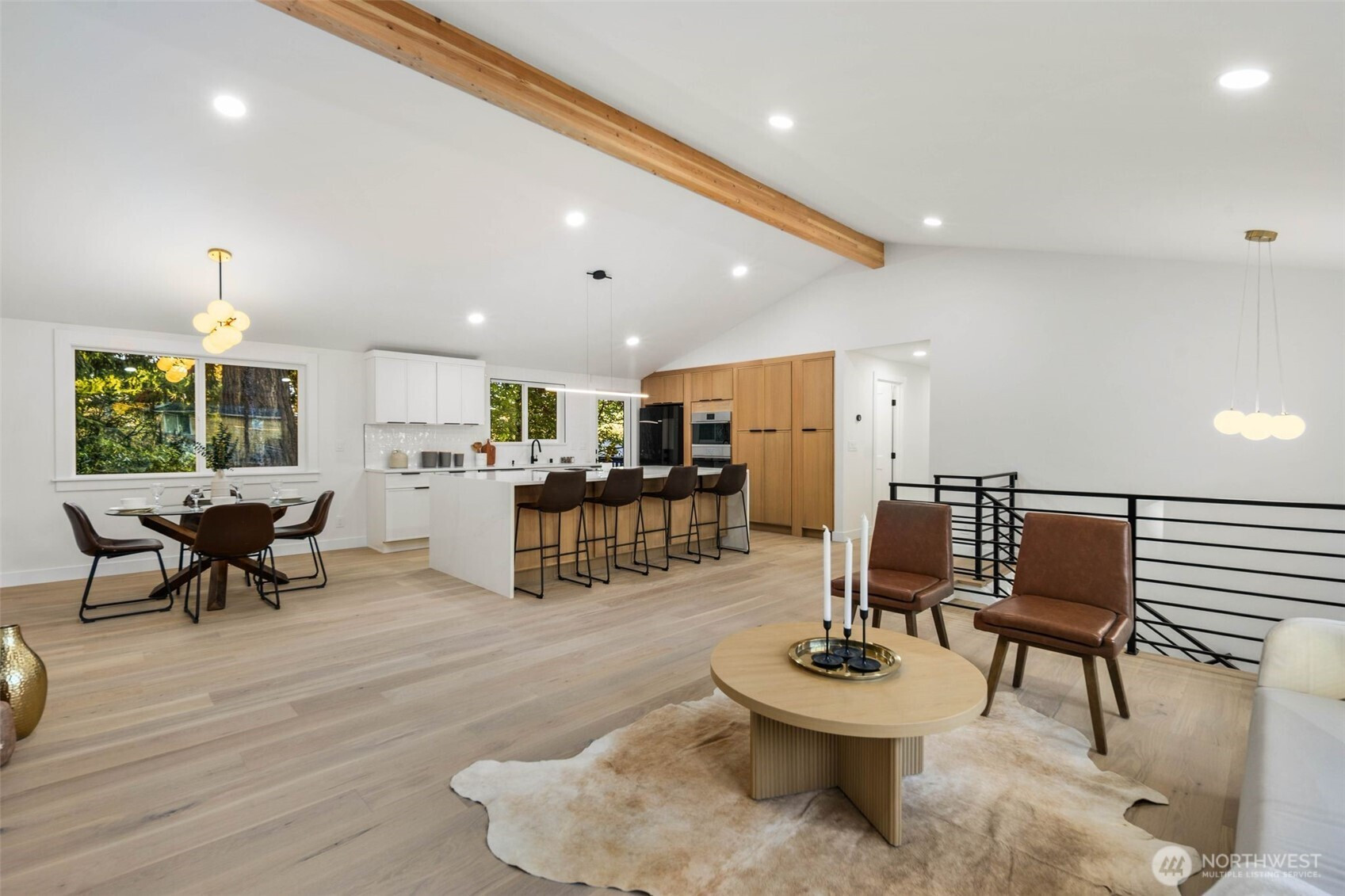 Experience modern elegance in this fully remodeled and permitted Shoreline home! Soaring vaulted ceilings, wide-plank floors, and exquisite tile work set the tone for refined living. The chef’s kitchen is the heart of the home, which includes a massive island and top tier appliances designed for both style and function, while the inviting living spaces flow seamlessly for entertaining or relaxation. Downstairs, a spacious family room with wet bar and wood-burning fireplace offers the perfect gathering place. Step outside to a beautifully landscaped yard with a deck and fire pit - your private retreat. Just steps from Shoreline Community College, shops, schools, parks, and transit, this home blends luxury, warmth, and location perfectly.