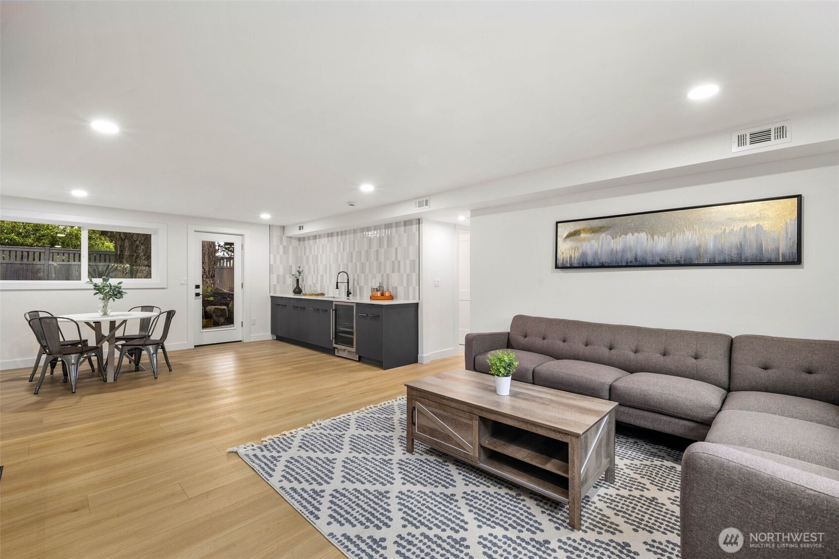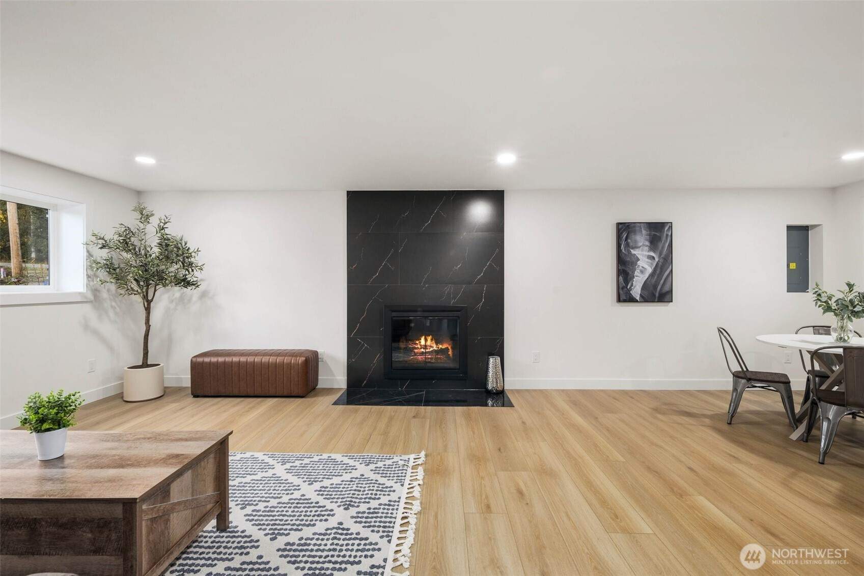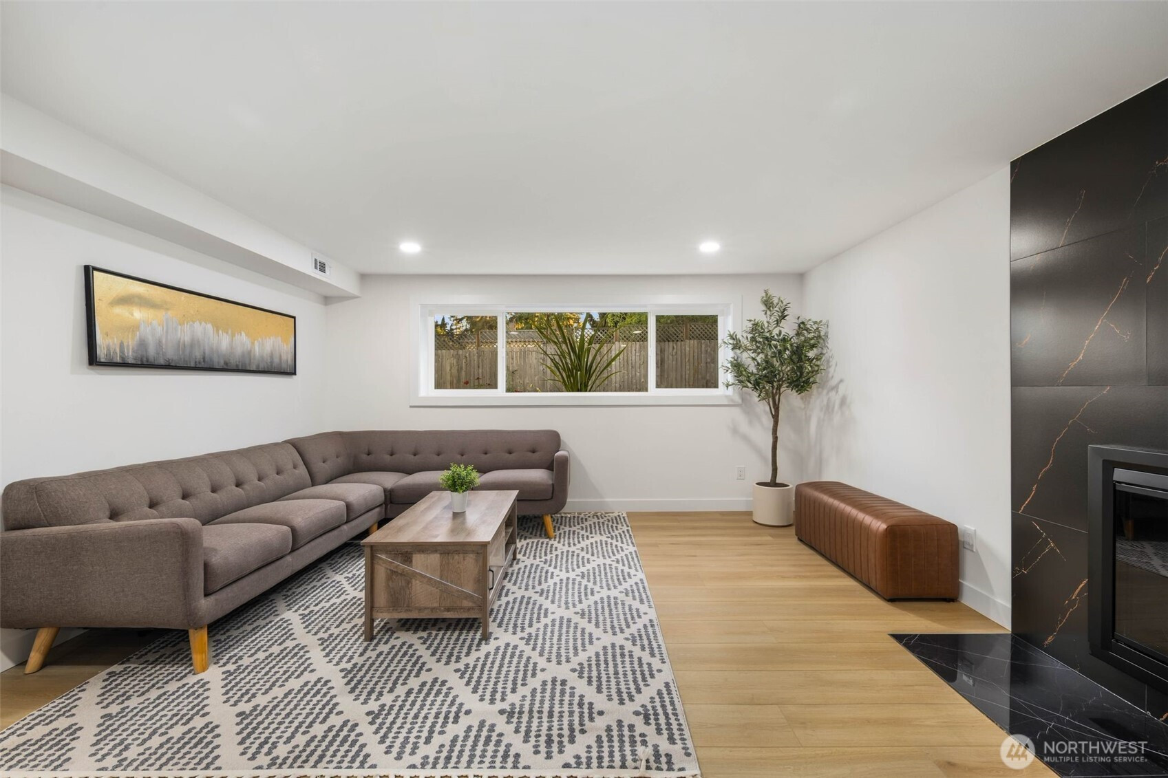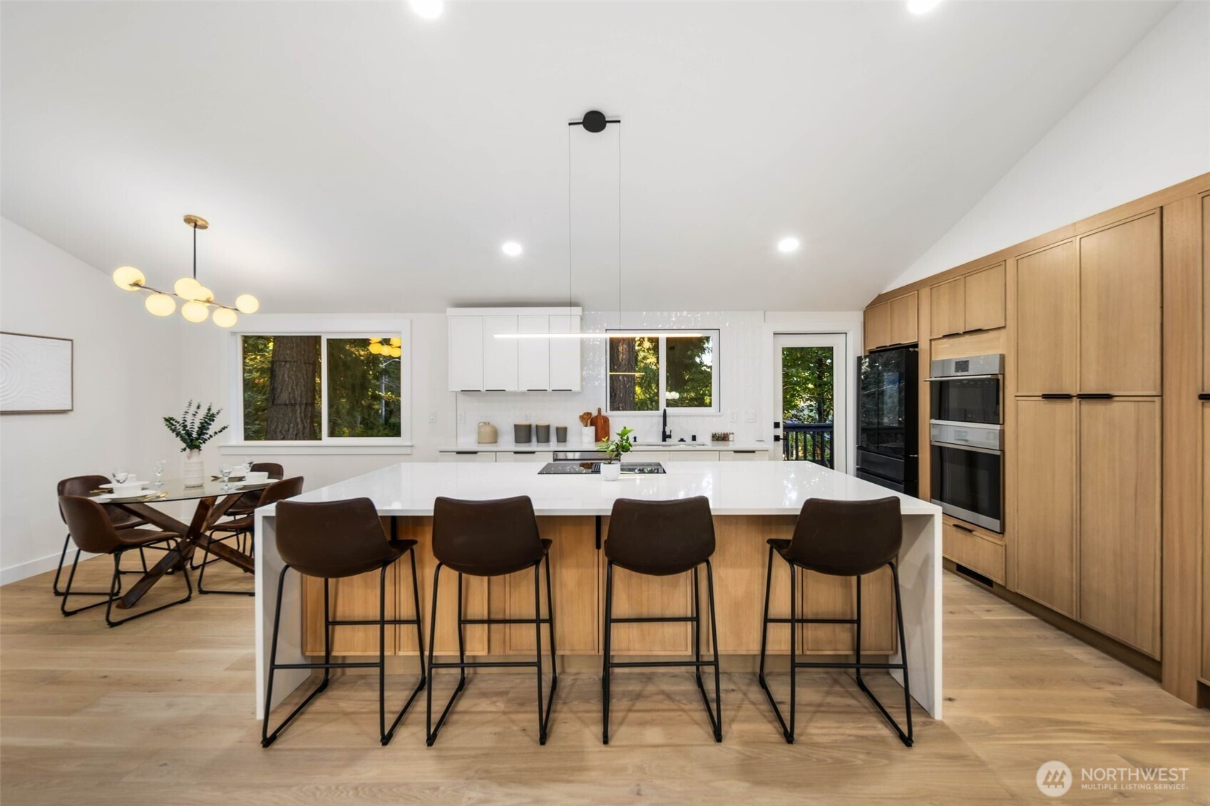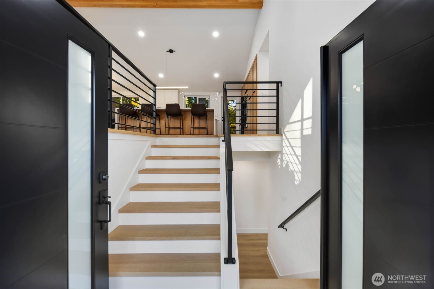 Experience modern elegance in this fully remodeled and permitted Shoreline home! Soaring vaulted ceilings, wide-plank floors, and exquisite tile work set the tone for refined living. The chef’s kitchen is the heart of the home, which includes a massive island and top tier appliances designed for both style and function, while the inviting living spaces flow seamlessly for entertaining or relaxation. Downstairs, a spacious family room with wet bar and wood-burning fireplace offers the perfect gathering place. Step outside to a beautifully landscaped yard with a deck and fire pit - your private retreat. Just steps from Shoreline Community College, shops, schools, parks, and transit, this home blends luxury, warmth, and location perfectly.