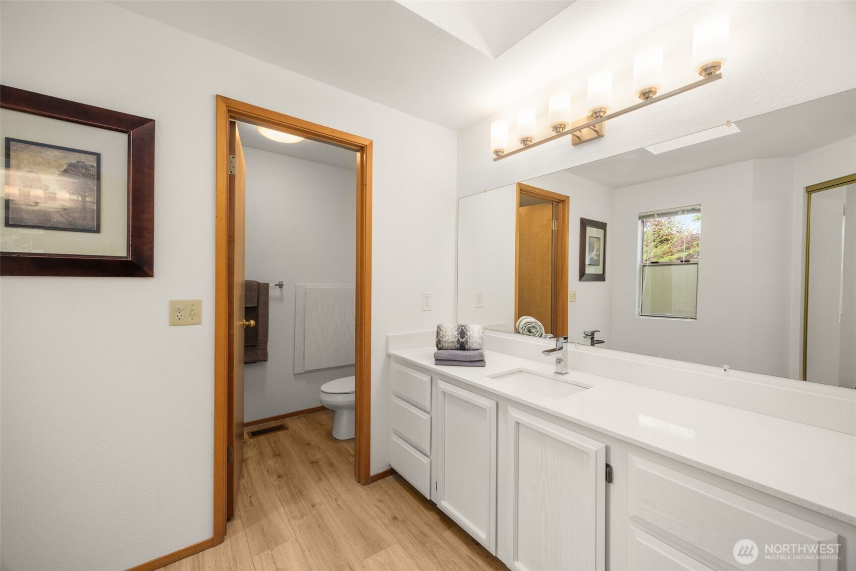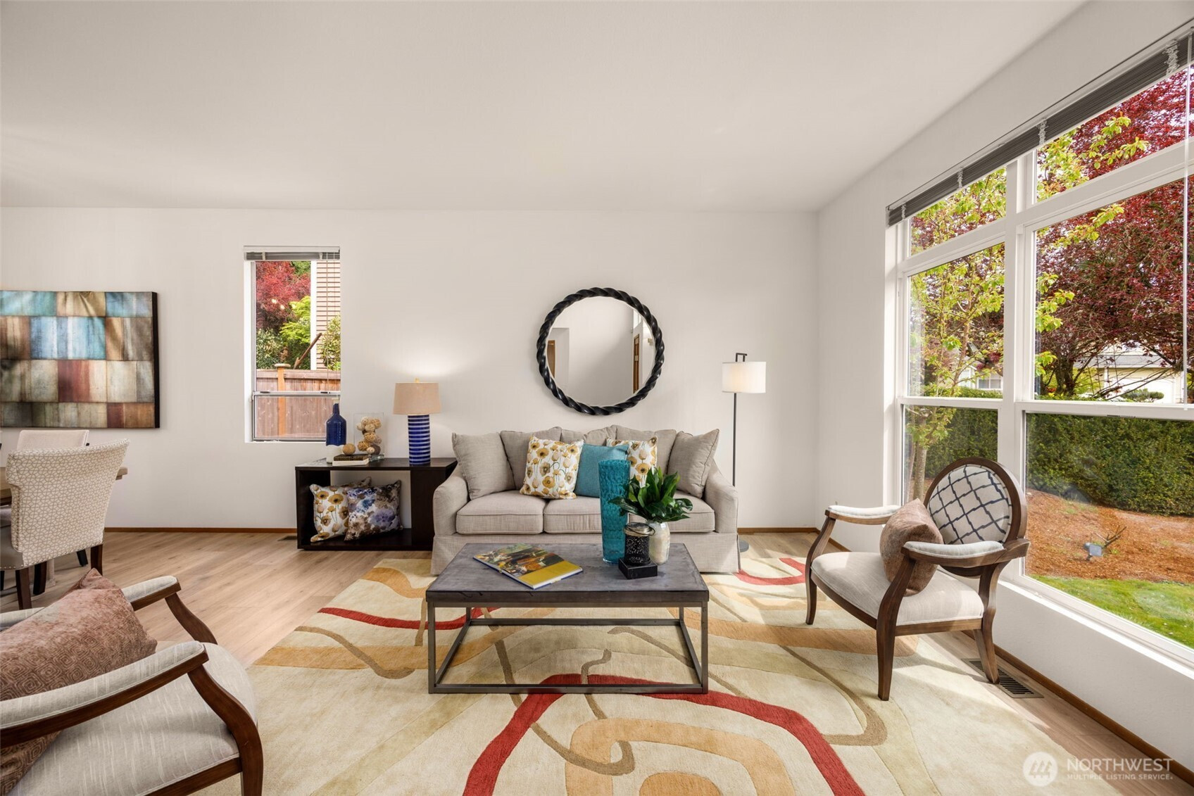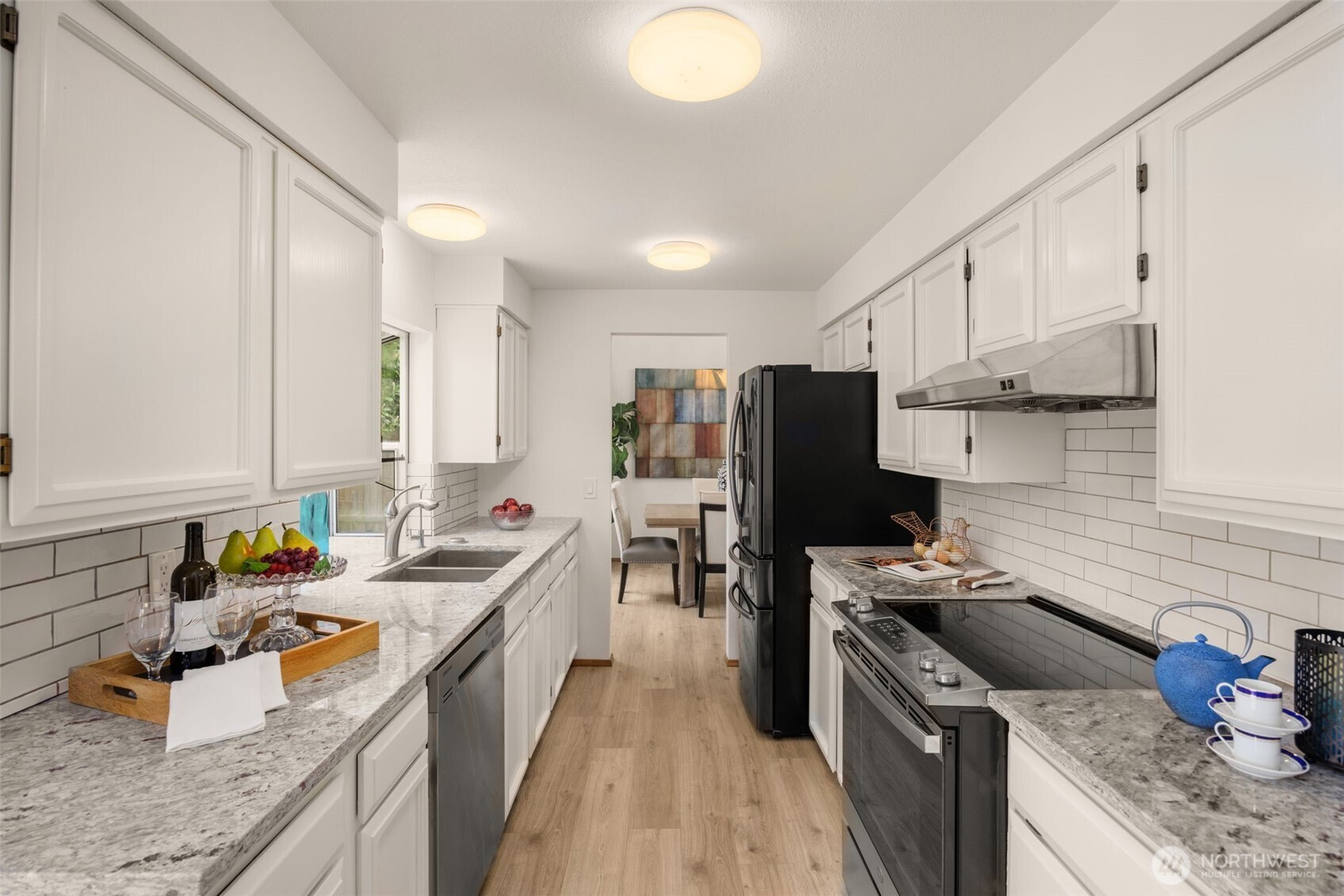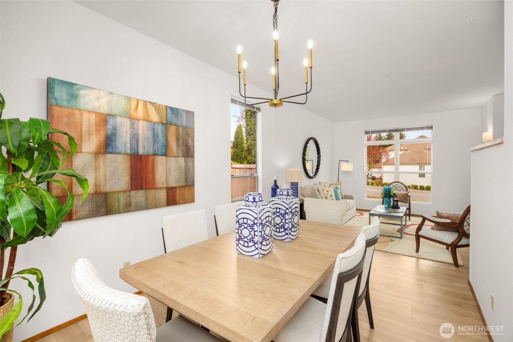 Rare opportunity to own a stunning 3-bedroom, 2.25-bath home + den/office in the coveted Fairwood community! Step inside to soaring ceilings, light-filled rooms, and brand-new LVP flooring throughout the main level. The updated kitchen boasts quartz countertops, a garden window, and stainless steel appliances, flowing seamlessly into the dining and family room for effortless entertaining. Upstairs, enjoy brand-new carpet and a spacious primary suite featuring a walk-in closet and an updated 3/4 ensuite. Fresh interior and exterior paint plus some new light fixtures make this home move-in ready. The oversized backyard is an outdoor oasis with a patio, raised paver platform, and storage shed. Ideally located across from Ridgewood Elementary with easy commuter access to I-405, SEA, restaurants, major retail & employment hubs. Home is pre-inspected!