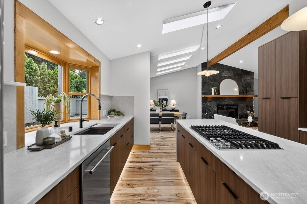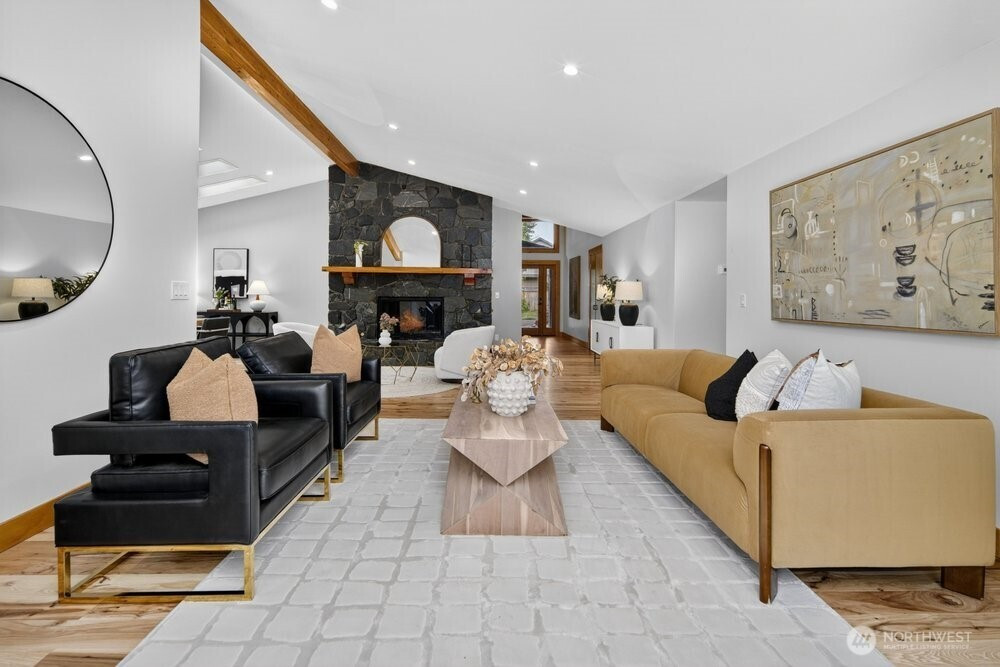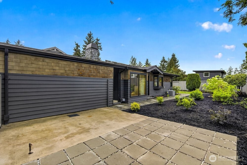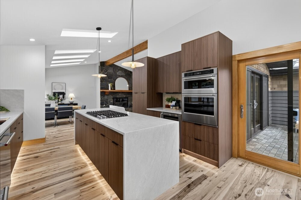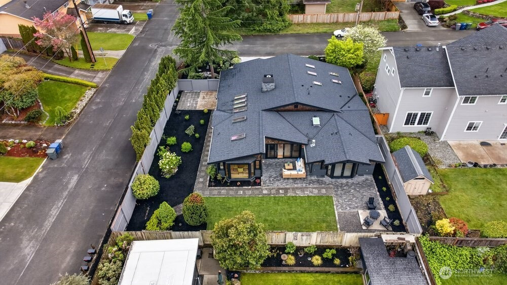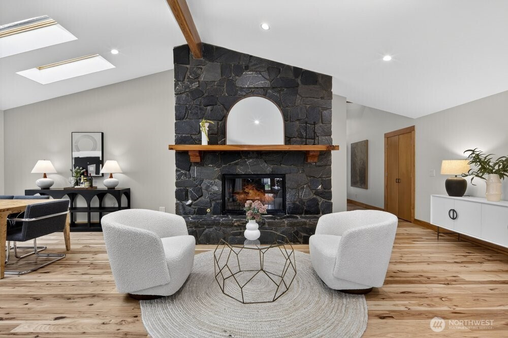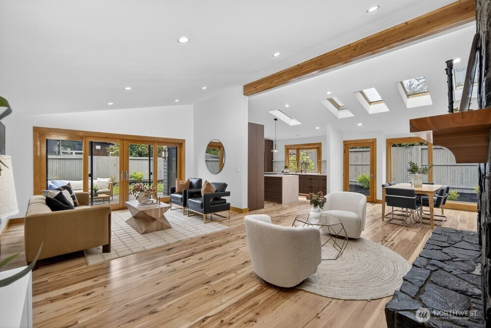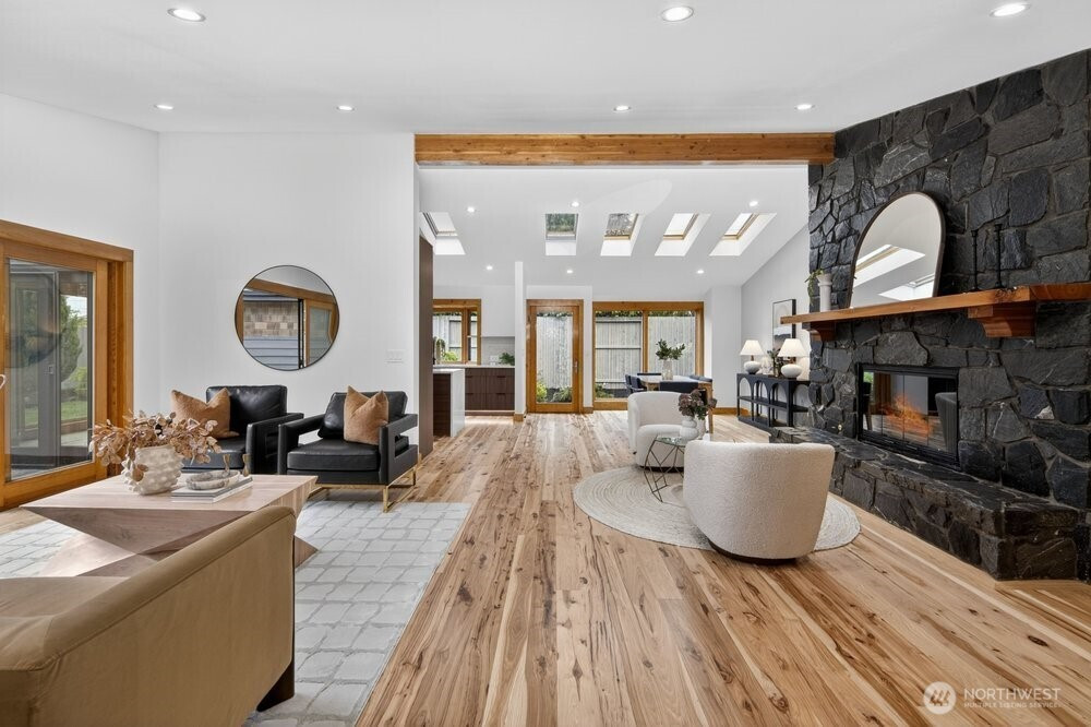 Large 2,190 sq ft rambler with striking Northwest contemporary design and vaulted ceilings throughout. Truly one of a kind, this home showcases quality craftsmanship with wood windows, cedar shingle siding, hardwood floors, and rich wood base and window trim. A new composite roof adds lasting value and peace of mind. The spacious kitchen is equipped with quality appliances, double ovens, a gas cooktop, and a beverage refrigerator. Natural light pours in through multiple skylights, including a dramatic series over the formal dining area and additional skylights above the kitchen island. The breakfast nook offers easy access to the paver patio through a 4-panel slider door, creating seamless indoor-outdoor flow. The primary suite is a private retreat with its own patio and backyard access, a gas fireplace, walk-in closet, and a 5-piece bath. Two additional large bedrooms, a huge full bath, and abundant storage provide space and flexibility. Additional major updates include a new tankless water heater with recirculation for instant hot water, plus a new gas furnace and A/C. Set on a fully fenced lot with a 2-car attached garage, this is a home you do not want to miss.