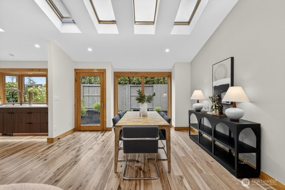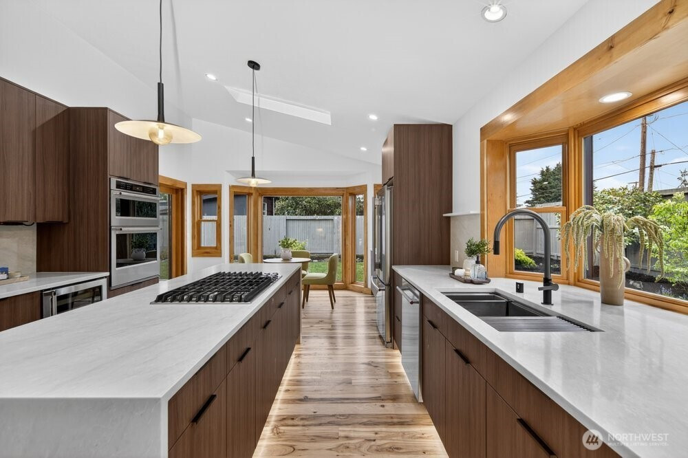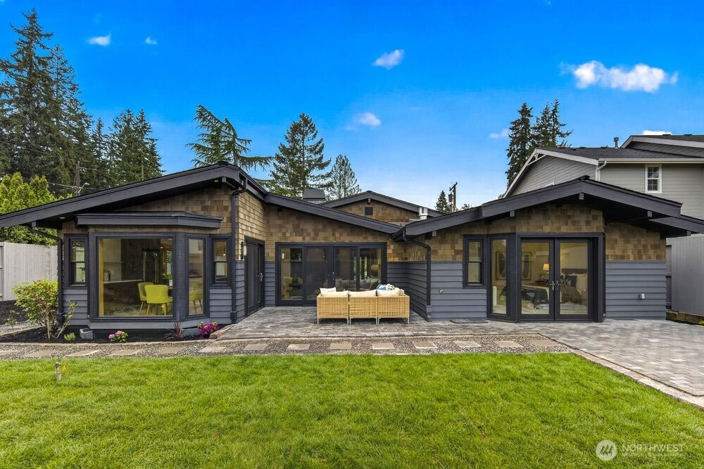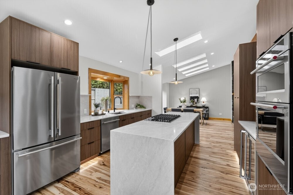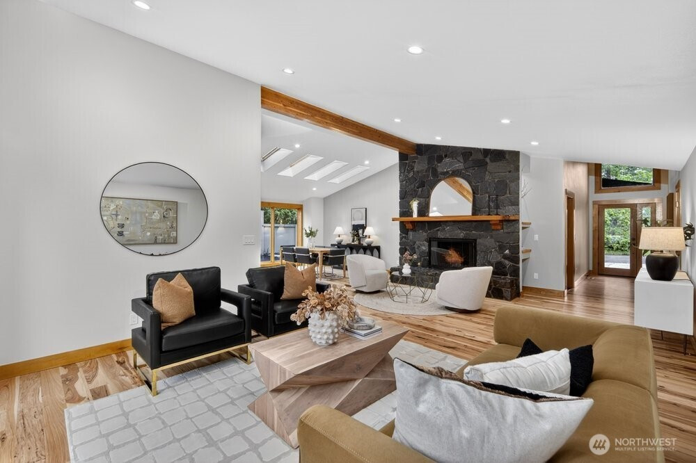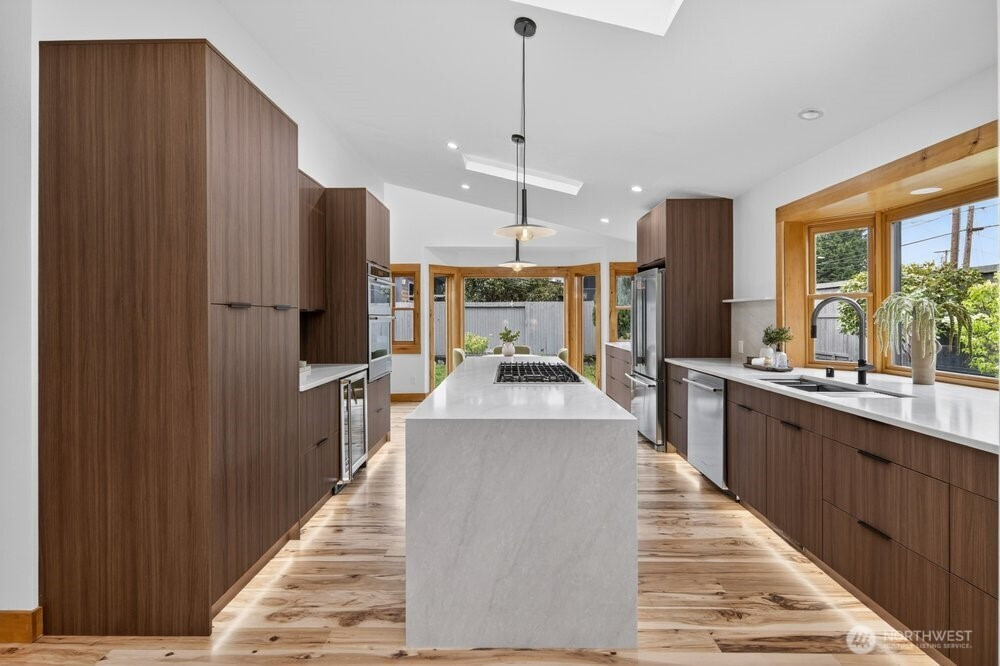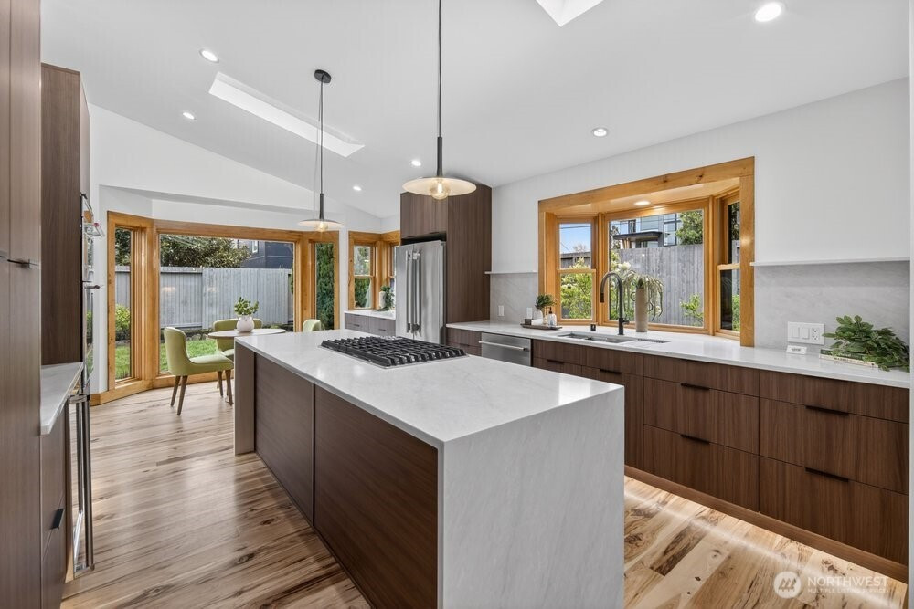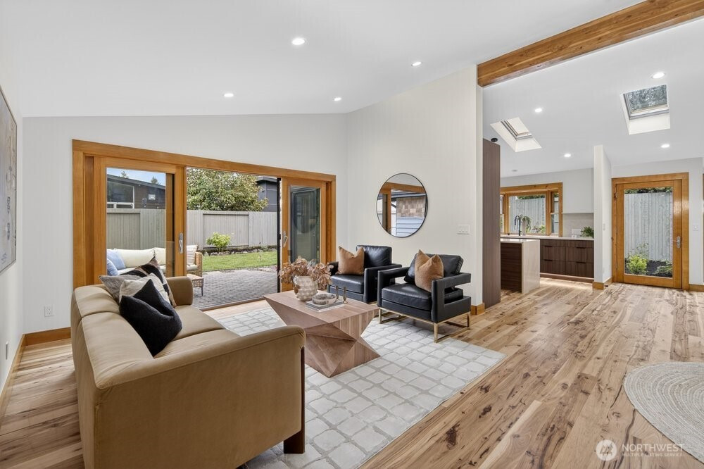 Large 2,190 sq ft rambler with striking Northwest contemporary design and vaulted ceilings throughout. Truly one of a kind, this home showcases quality craftsmanship with wood windows, cedar shingle siding, hardwood floors, and rich wood base and window trim. A new composite roof adds lasting value and peace of mind. The spacious kitchen is equipped with quality appliances, double ovens, a gas cooktop, and a beverage refrigerator. Natural light pours in through multiple skylights, including a dramatic series over the formal dining area and additional skylights above the kitchen island. The breakfast nook offers easy access to the paver patio through a 4-panel slider door, creating seamless indoor-outdoor flow. The primary suite is a private retreat with its own patio and backyard access, a gas fireplace, walk-in closet, and a 5-piece bath. Two additional large bedrooms, a huge full bath, and abundant storage provide space and flexibility. Additional major updates include a new tankless water heater with recirculation for instant hot water, plus a new gas furnace and A/C. Set on a fully fenced lot with a 2-car attached garage, this is a home you do not want to miss.